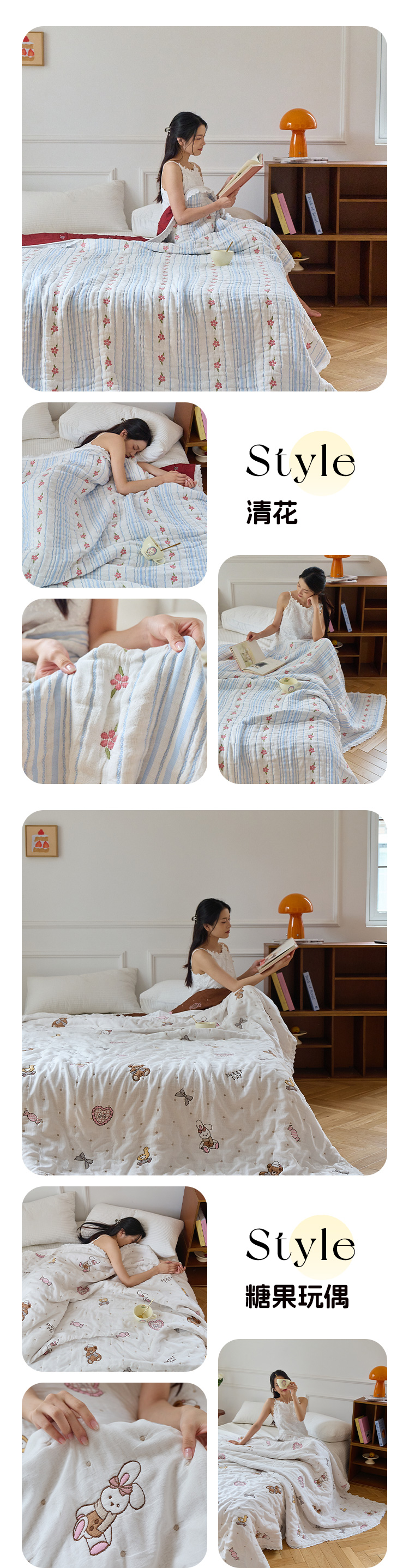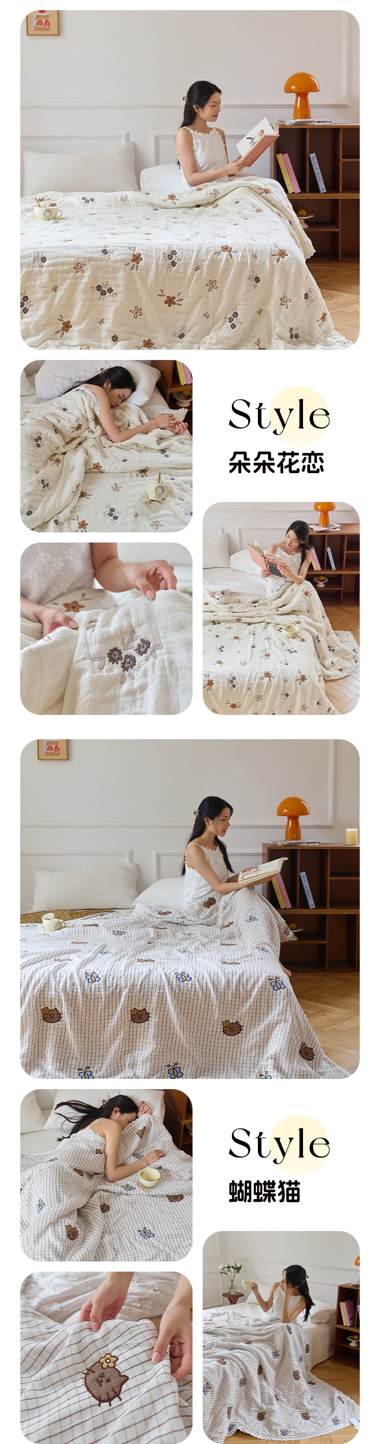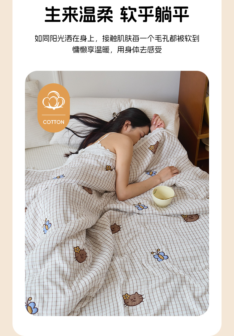 (总)沐瑟家纺 2026新款A类全棉纱布泡芙被春秋被被被子被芯,朵朵花恋,蝴蝶猫,企鹅小熊,清花,糖果玩偶,小草莓,小拉布布,小熊发卡,樱桃狗,组合图