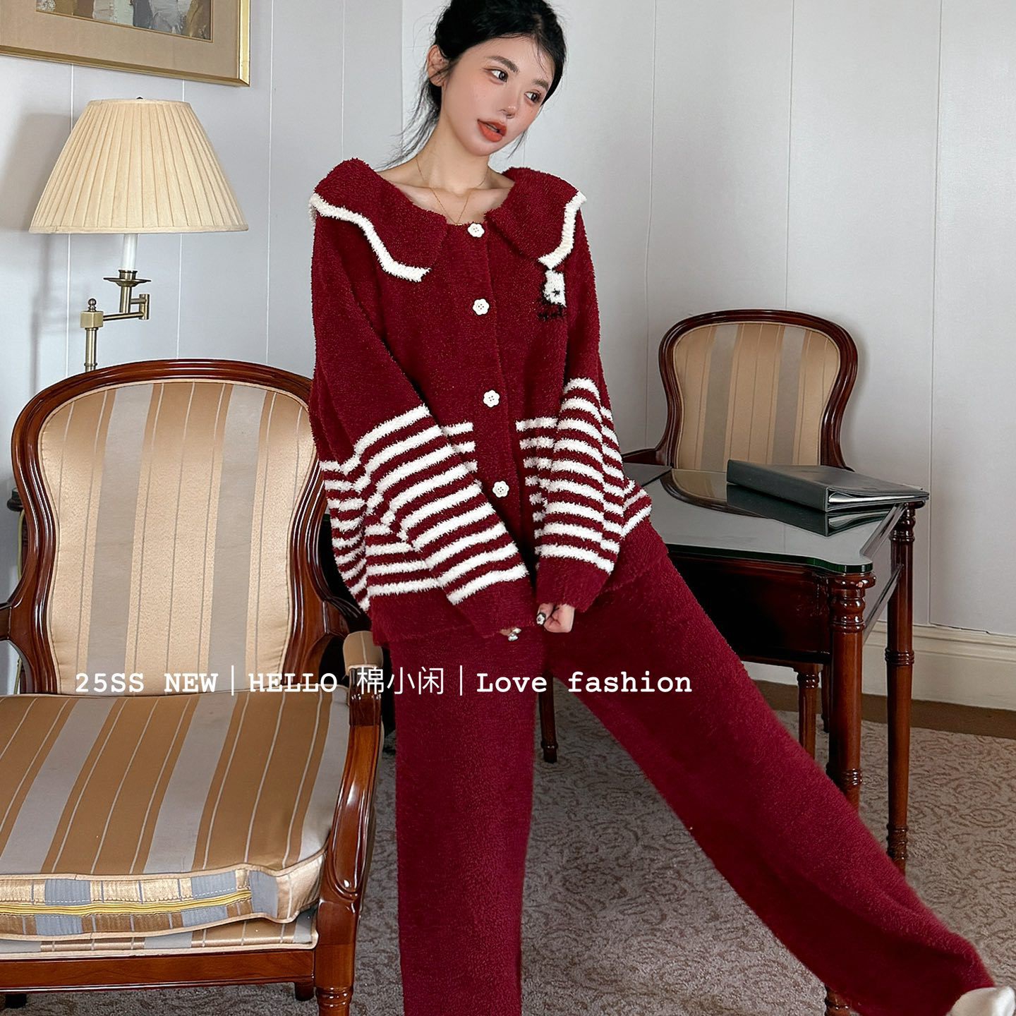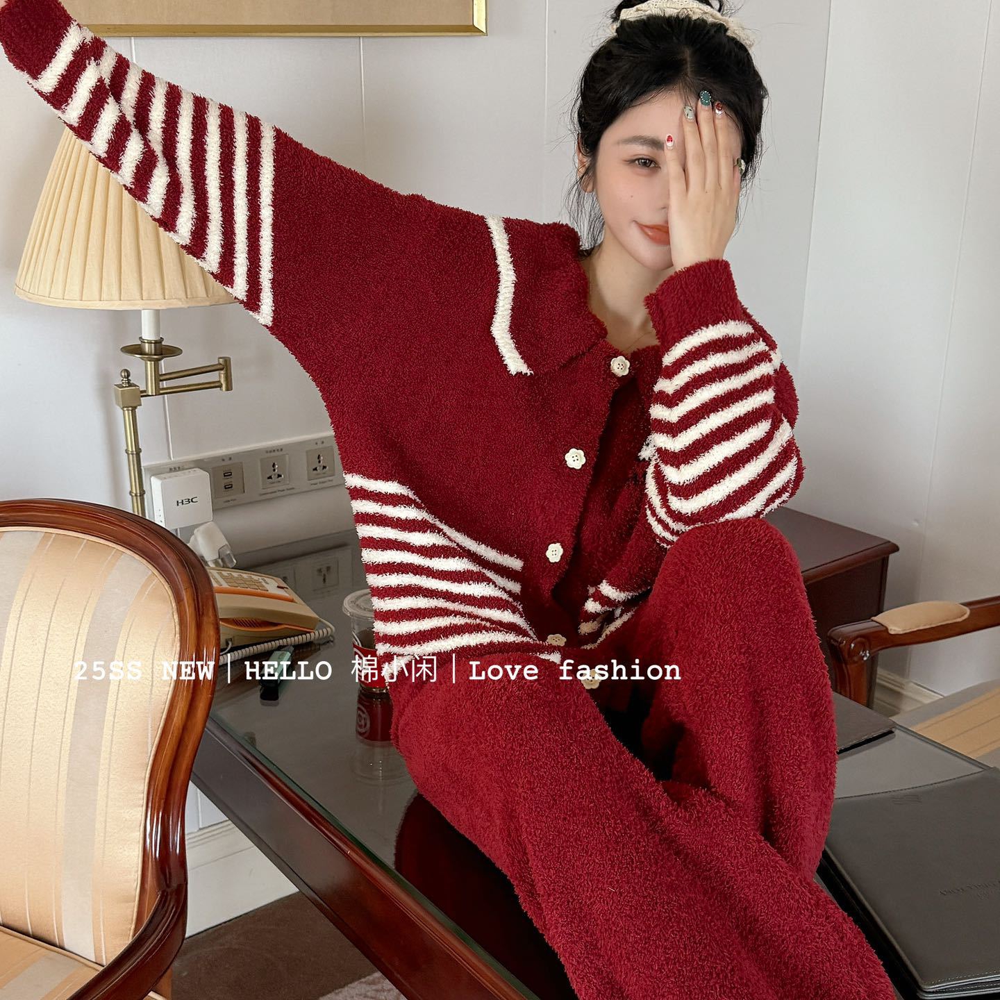 • 91家纺网 家纺一手货源 找家纺 妍景家居生活馆 2026新款软绵绵条纹KT款家居服睡衣套装 红色