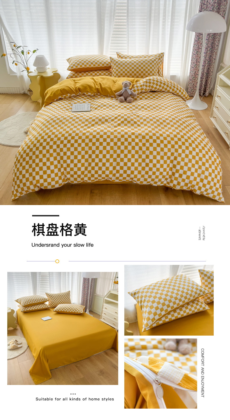 赫然家纺 新款舒适柔软亲肤爆款芦荟棉四件套货源充足 棋盘格-黄