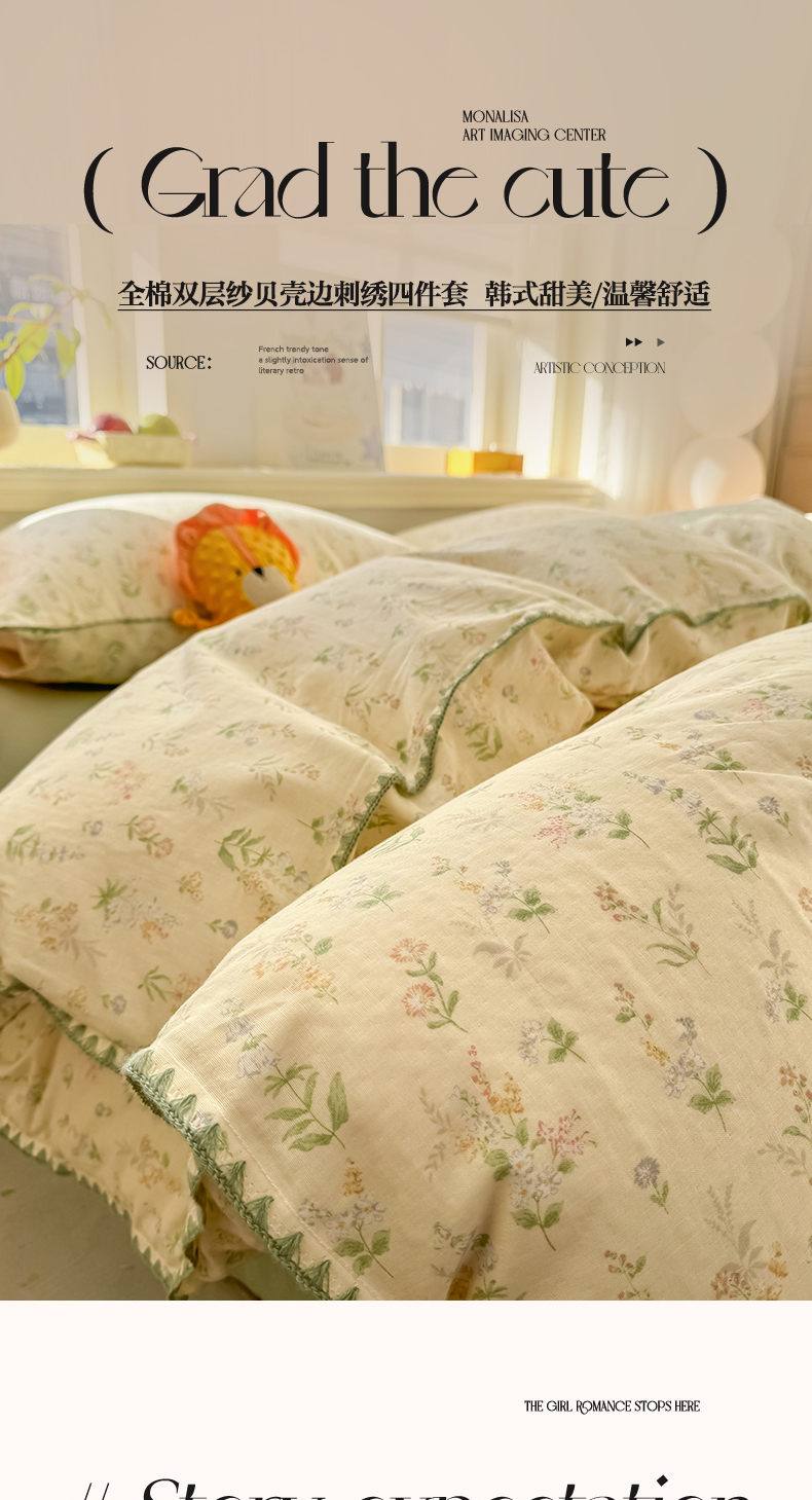 商品名称:对白 2026新款A类全棉纯棉有氧双层纱贝壳边三角针单床单床单单件 雾岛听风