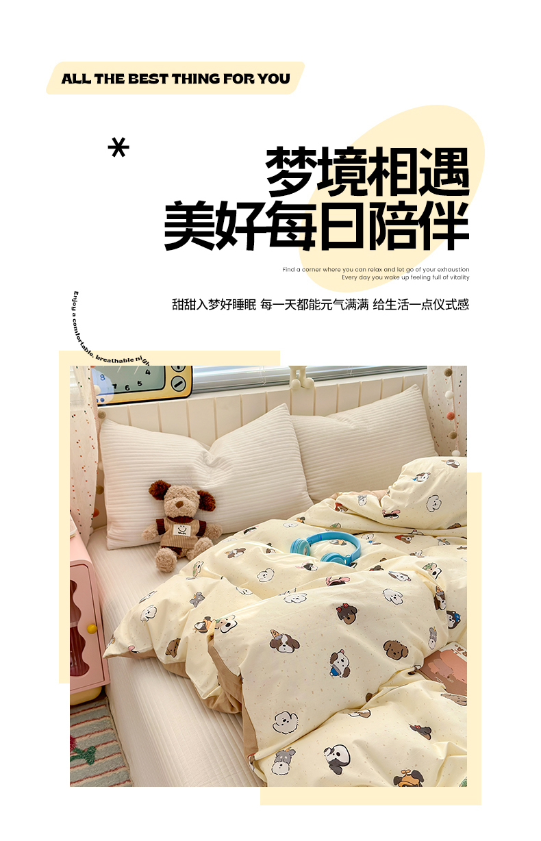 • 91家纺网 家纺一手货源 找家纺 梵克保罗 2026春夏新款ins小清新40支全棉13372四件套学生三件套单被套单枕套系列-第一批(单被套) 富贵狗