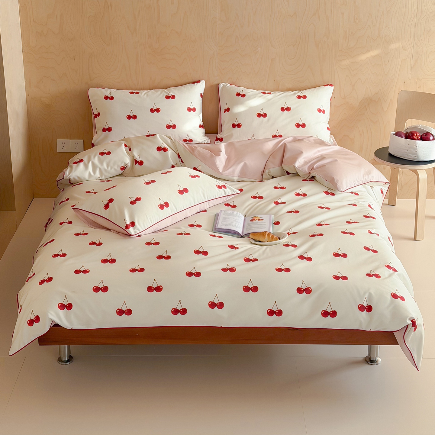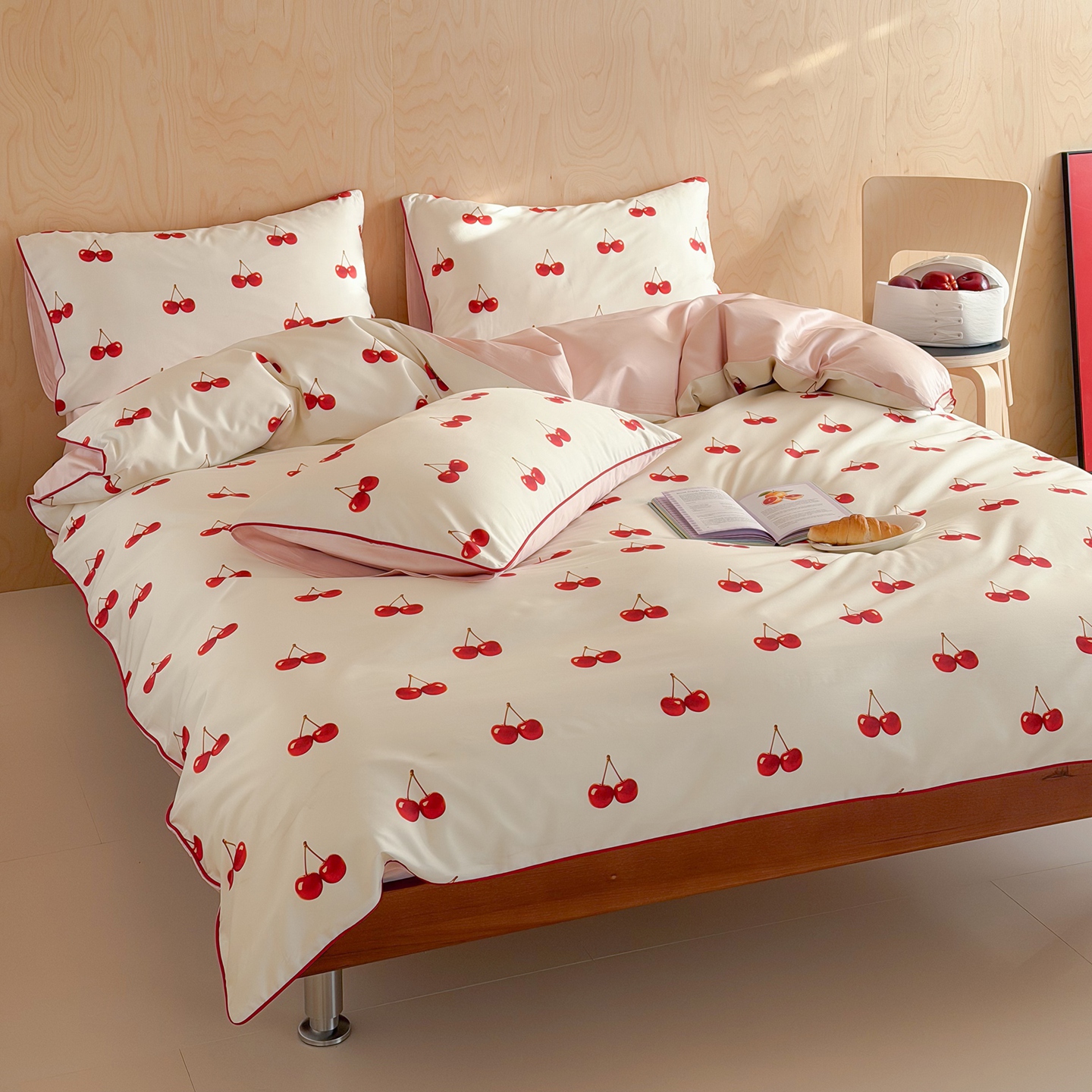桔子家纺 2026春夏新款100s全棉纯棉复古樱桃系列四件套-场景二 复古樱桃-粉