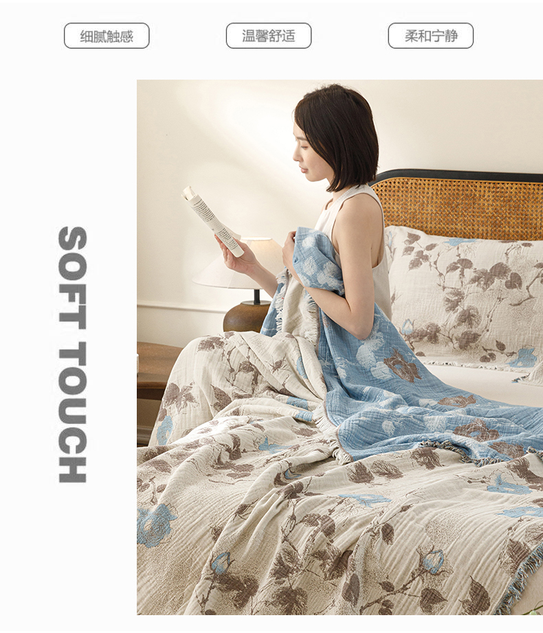 • 91家纺网 家纺一手货源 找家纺 朴尔家纺-毛巾被 2026新款全棉60s精细纱流苏花边四层纱布毛巾被 蓝色随想