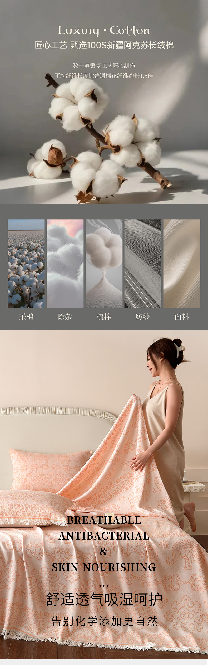 商品名称:朴尔家纺-毛巾被 2026新款长绒棉100s贡缎丝光棉纯棉流苏纱布毛巾被三件套 皇室吉象-橙粉