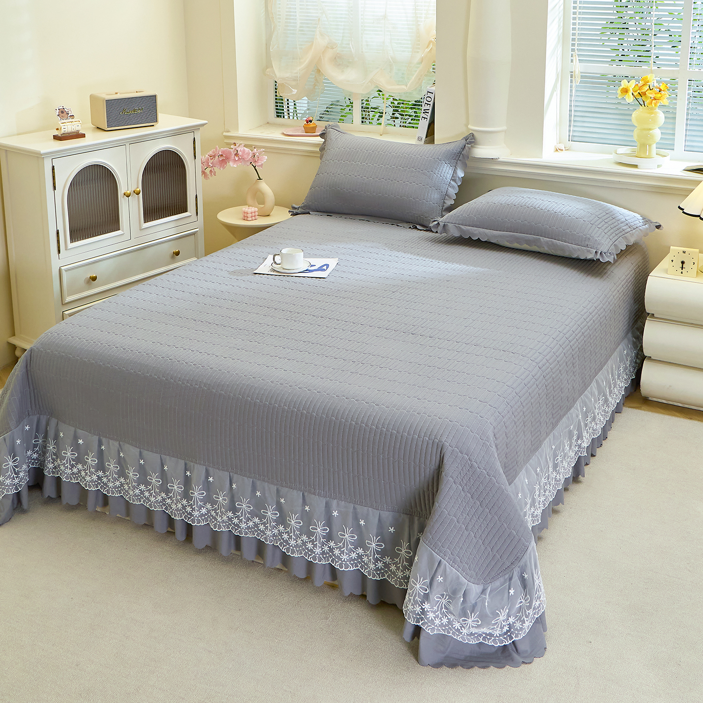彩亿家纺 2026新款A类古法水洗仿棉蕾丝床盖三件套 星河灰