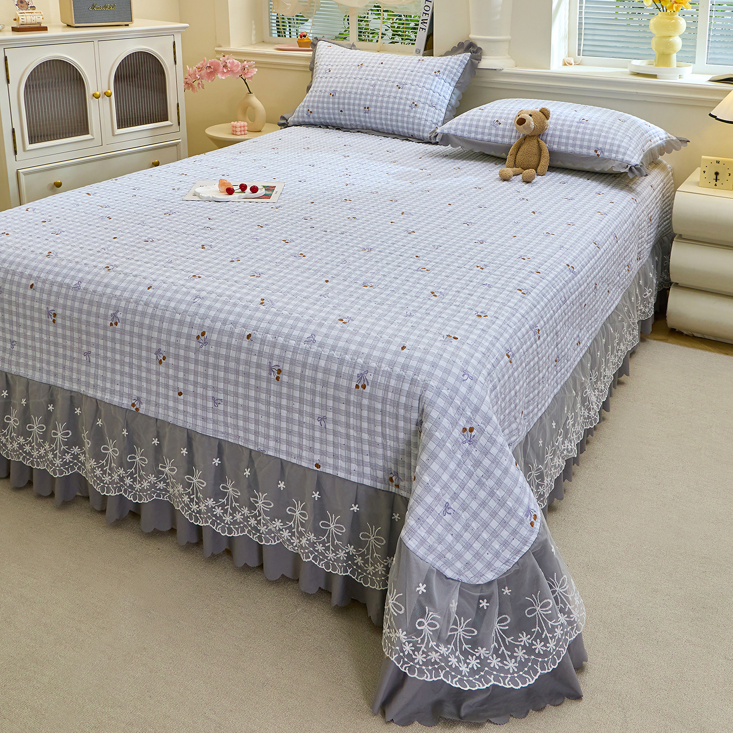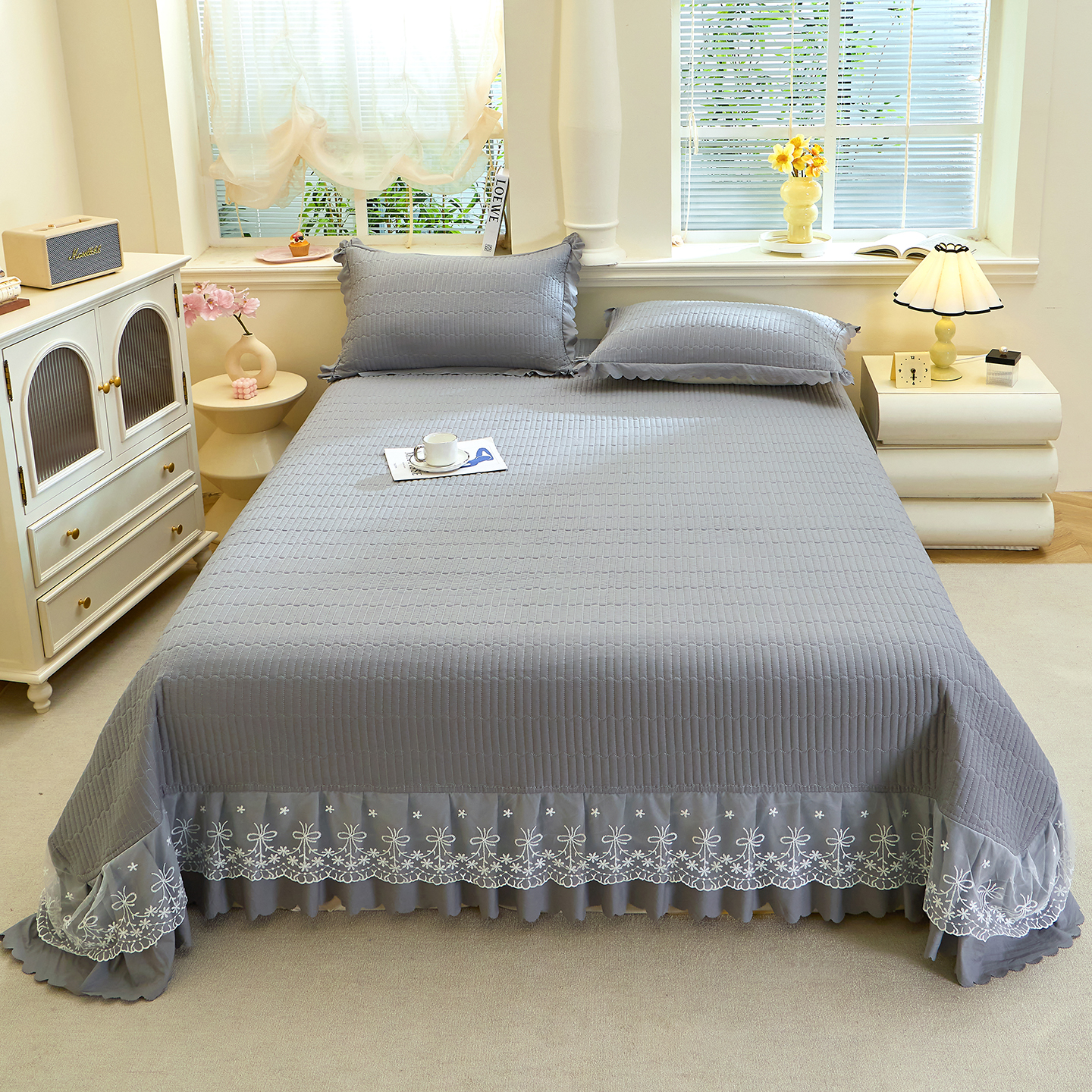 当前位置: 91家纺网 > 商品网购 > 床上用品 > 床盖 > 彩亿家纺 2026新款A类古法水洗仿棉蕾丝床盖三件套 星河灰