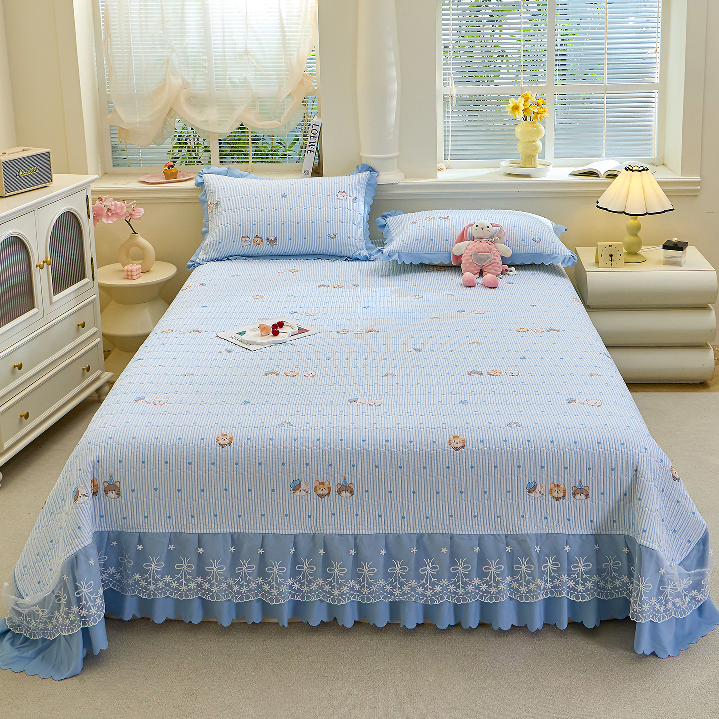 (总)彩亿家纺 2026新款泡芙纱印花款床笠三件套云感泡芙双层纱套件单件床笠,旧街星星,星星糖豆,旋转木马,星星点点,猫猫乐园,萌马驾到,奶蓝蝴蝶,田园兔