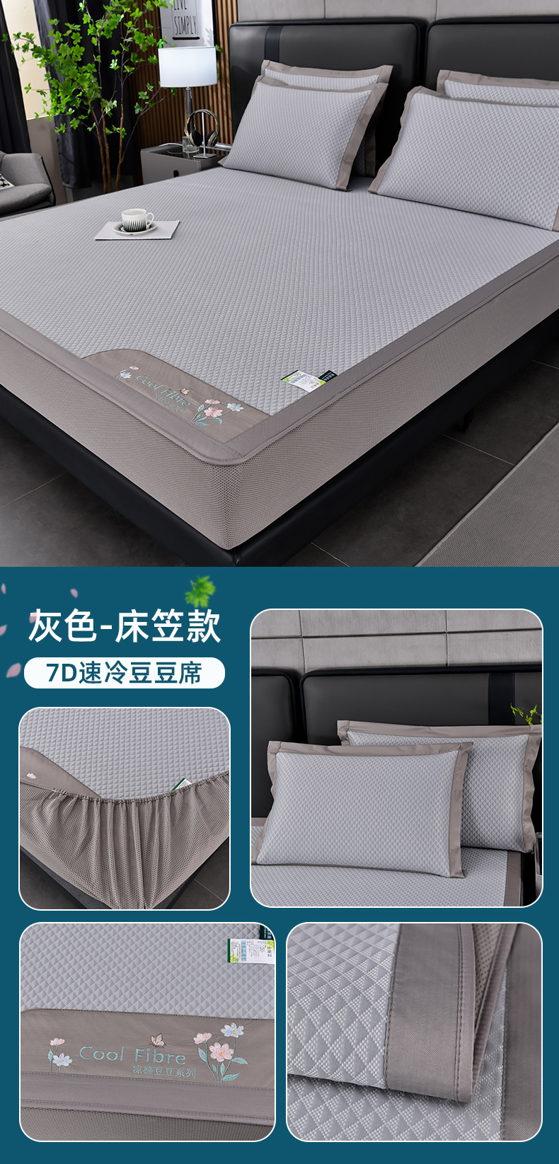 (总)小牛席业 2026新款半定位大提花凉感冰丝席(床笠款)凉席竹席藤席冰藤席乳胶席豆豆席,灰色,粉色,蓝色,香槟