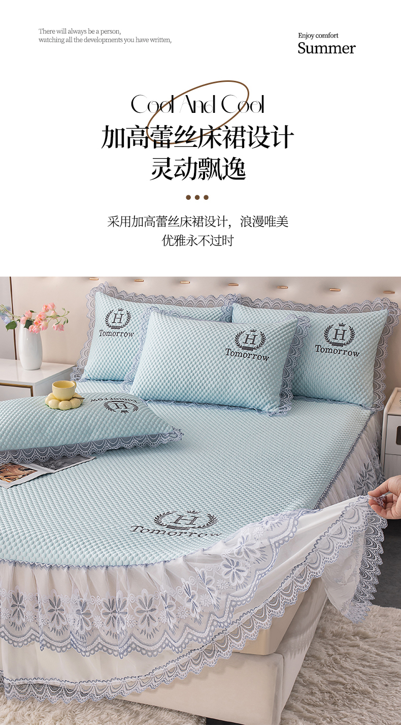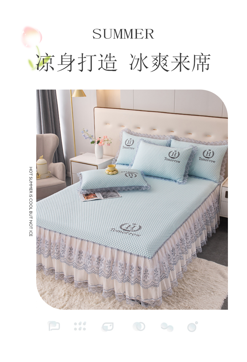 (总)优姿家纺 2025新款500克冰豆豆床裙凉席三件套,冰川蓝,高级灰,公主粉,奶油咖,青草绿,天空蓝