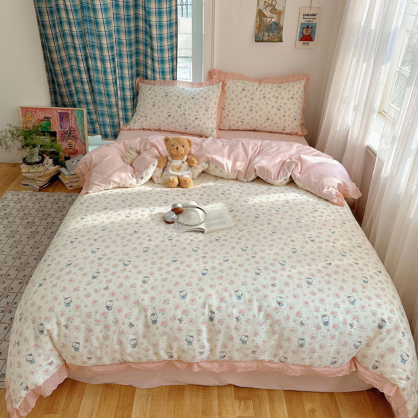 (总)一比一家纺 2026新款云感泡芙棉小清新印花贝壳边四件套,豹纹凯蒂,蛋糕星人,费尔岛小狗,哈喽星人,黑白蝴蝶,萌趣小马,萌趣小熊,青涩樱桃,诗意柔,小汽车,摇摇星人,樱桃波点