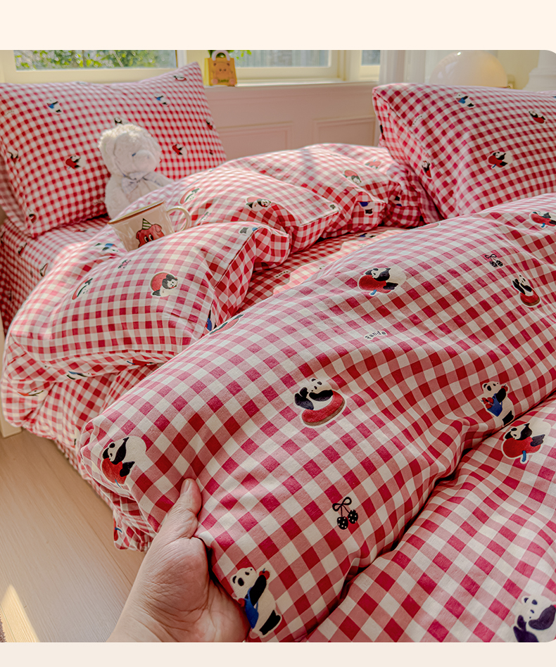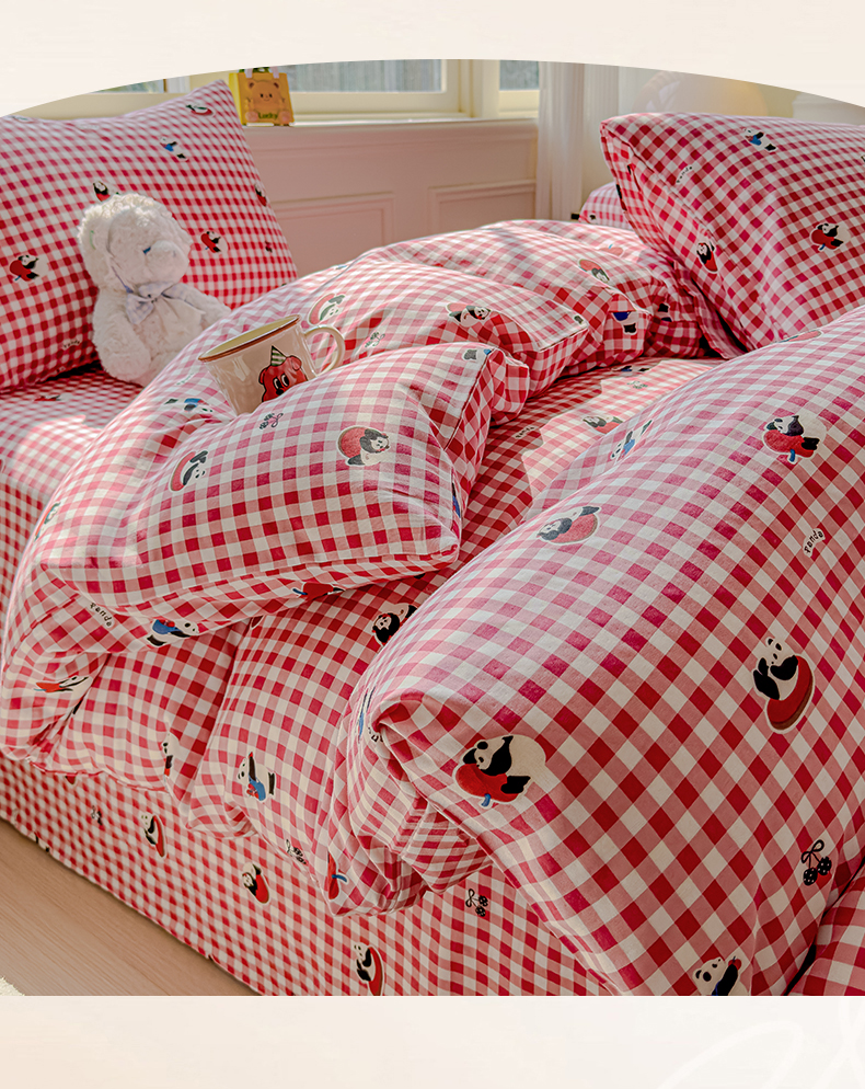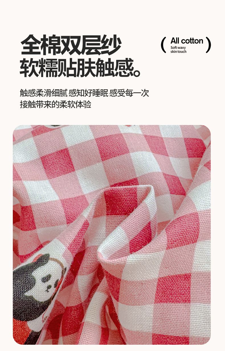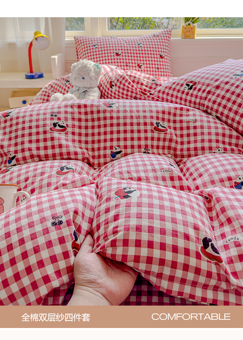 当前位置: 91家纺网 > 商品网购 > 床品套件 > 四件套 > 双层纱四件套 > 感遇家纺 2026春夏新款双层纱全棉纯棉系列四件套-第一批 红格熊猫