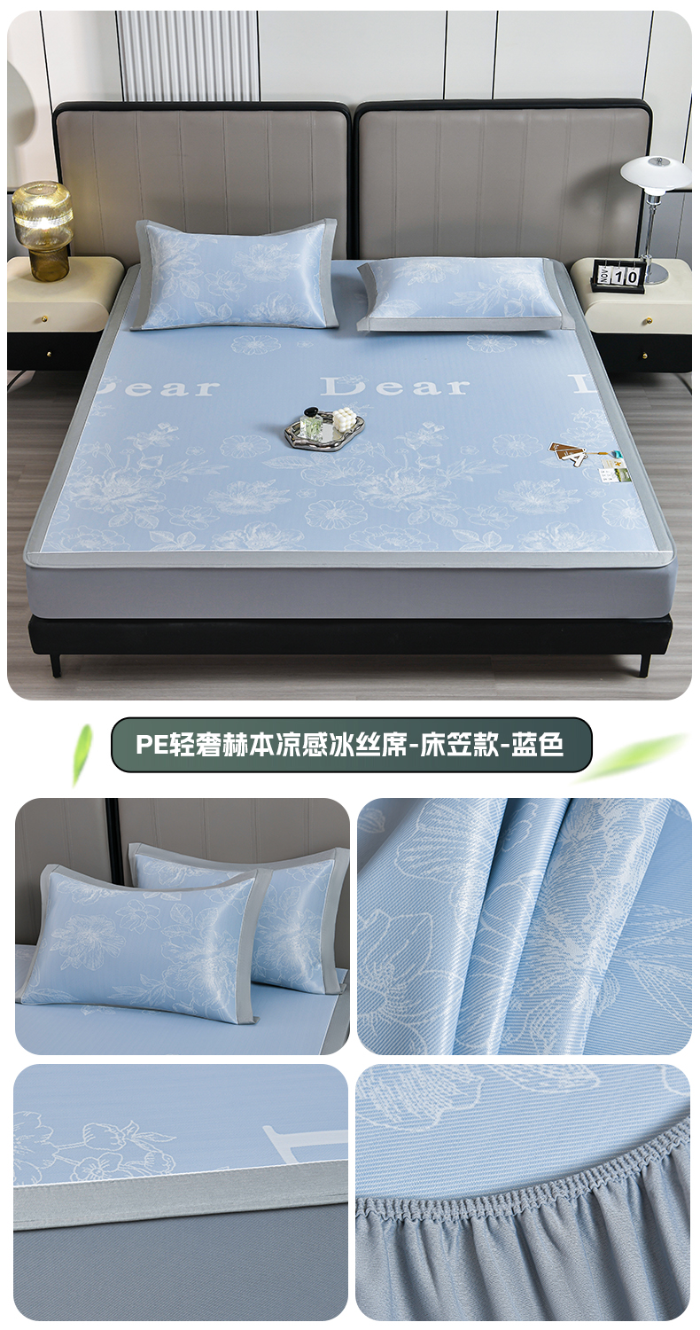 商品名称:小牛席业 2026春夏新款【实拍风格】PE凉感凉席席子-轻奢赫本(床笠款) 轻奢赫本-蓝色