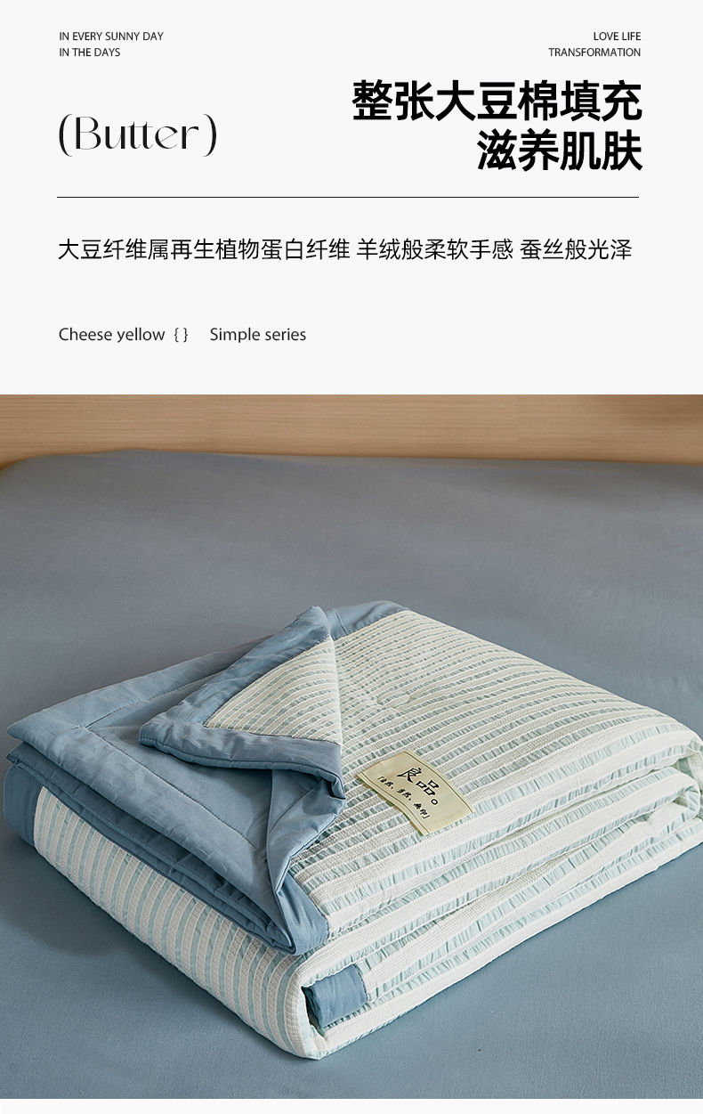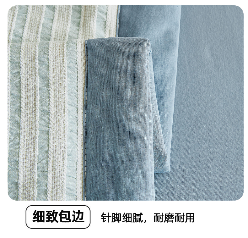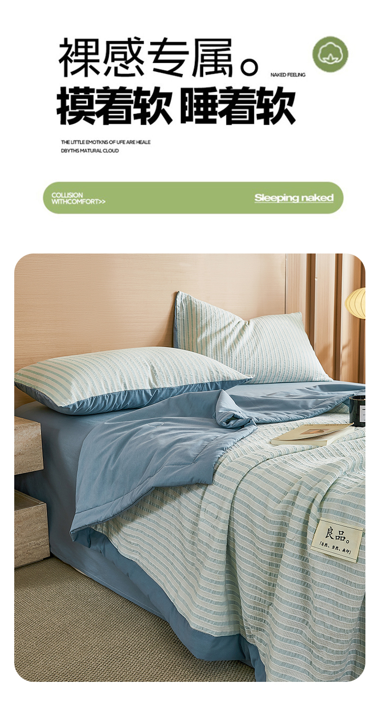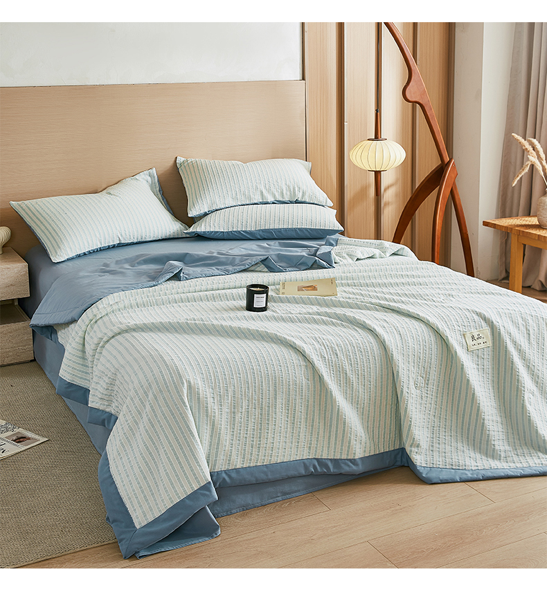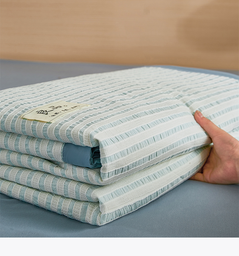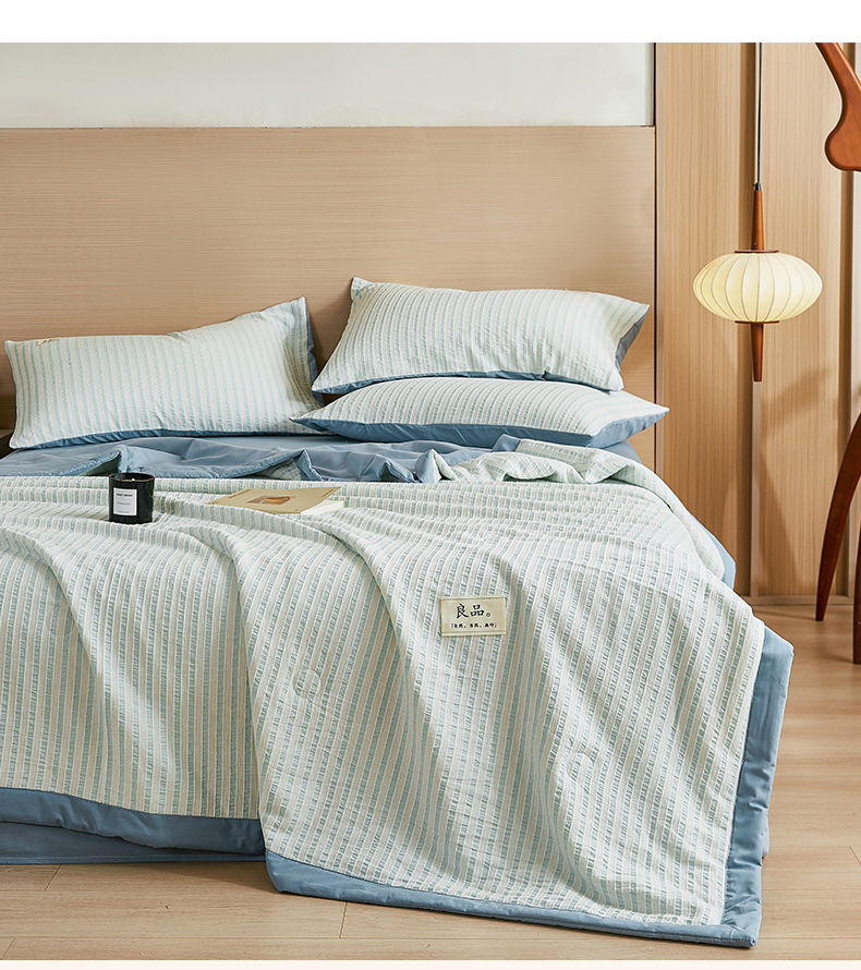 • 91家纺网 家纺一手货源 找家纺 鸣升家纺 2026新款A类全棉水洗棉条纹提花大豆纤维夏被四件套空调被 条纹提花蓝