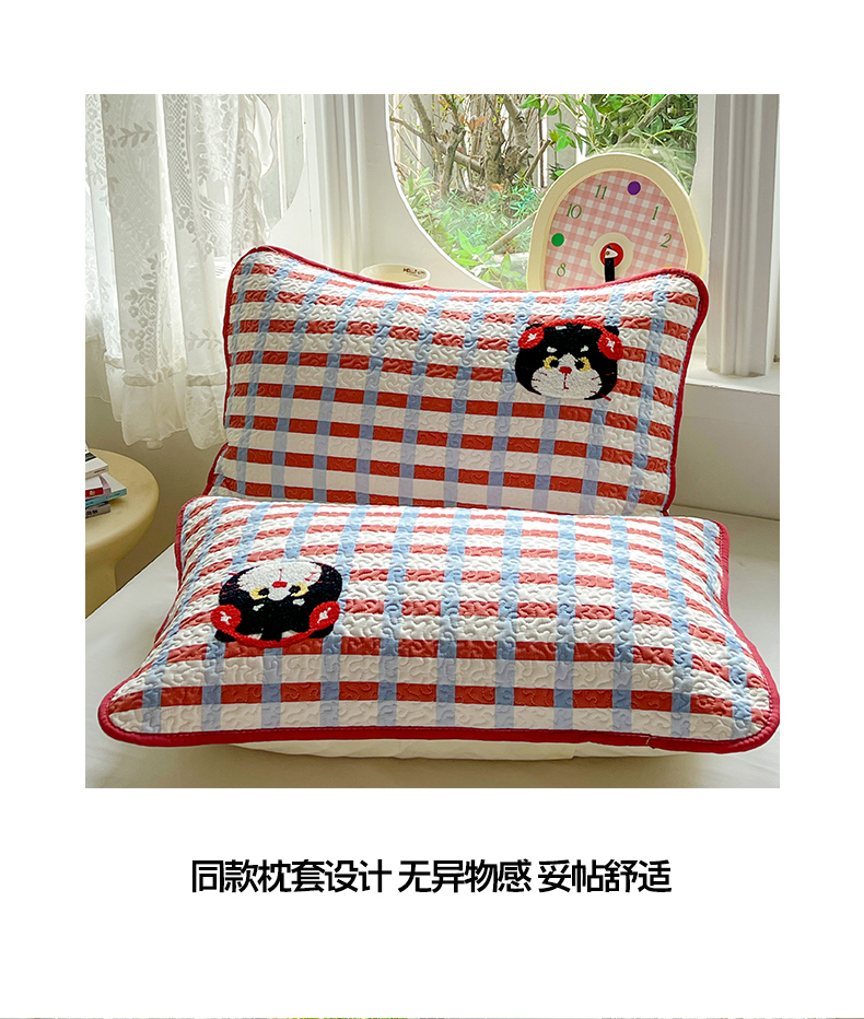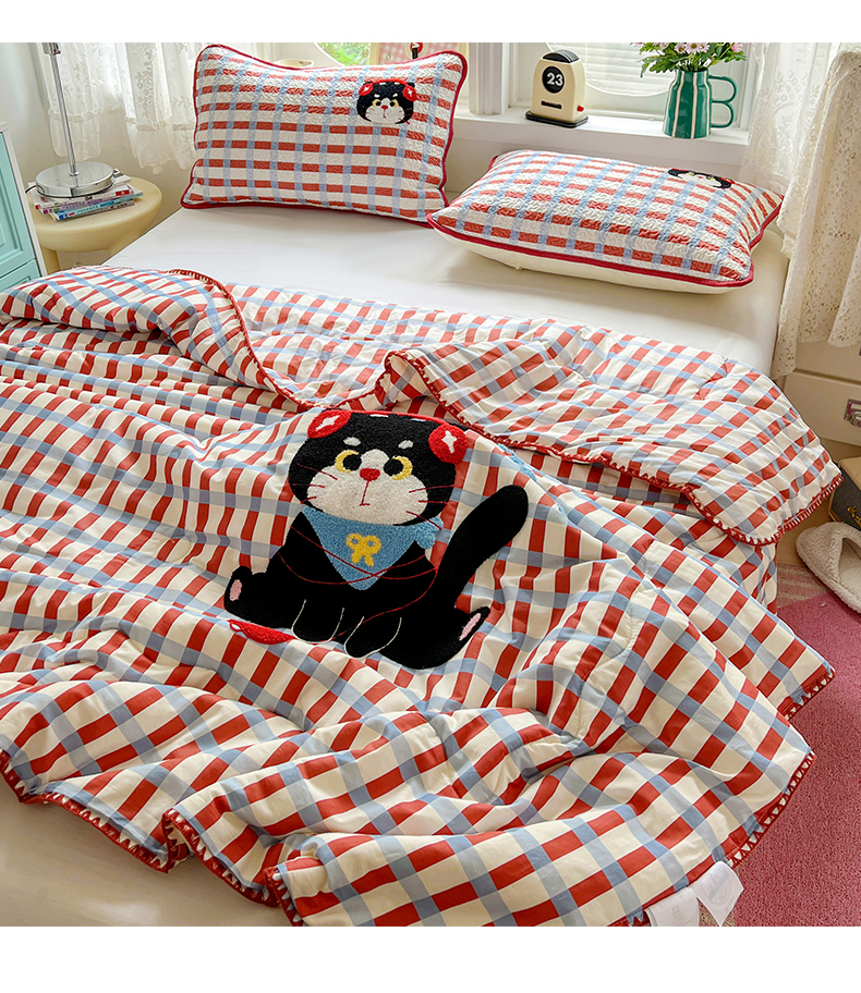 • 91家纺网 家纺一手货源 找家纺 鑫喜莱家纺 2026新款全棉纯棉夏被毛巾绣贝壳边大豆纤维全棉夏凉被空调被夹棉绗棉枕套 线团小黑猫