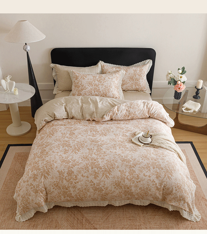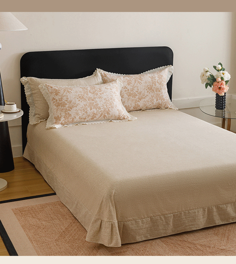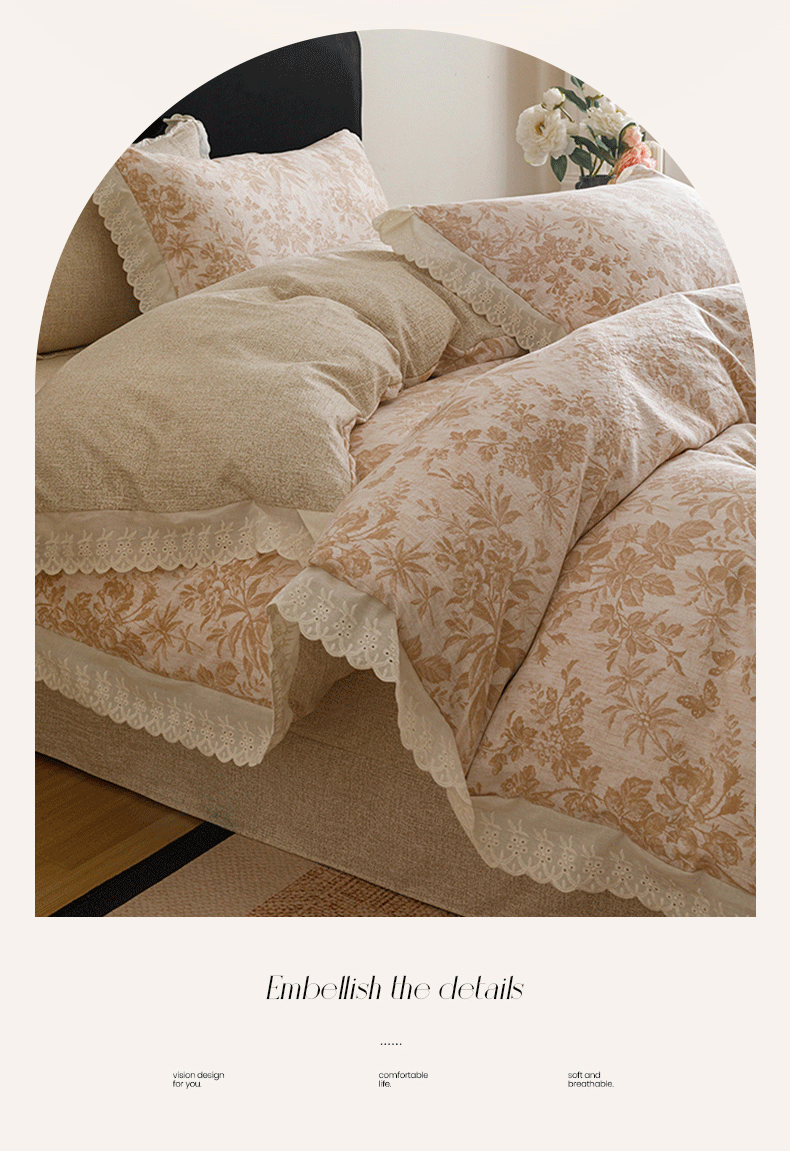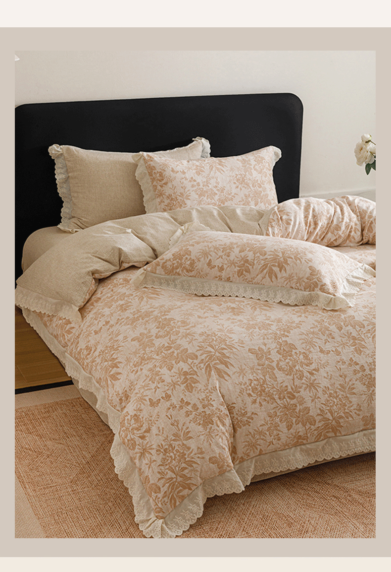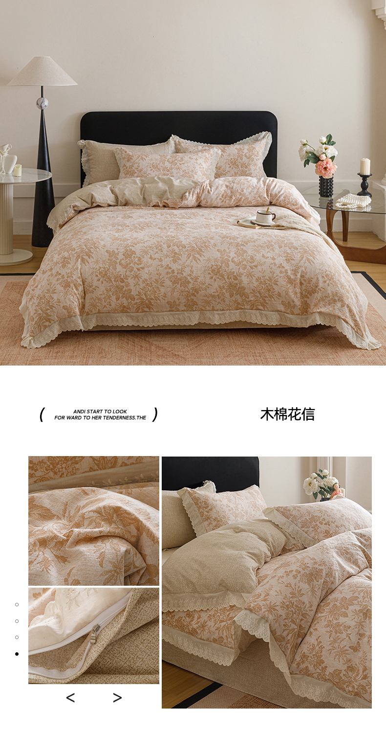 商品名称:悦然毛巾被 2026春夏新款加厚原麻水洗复古风四件套亚麻提花花边四件套 木棉花信