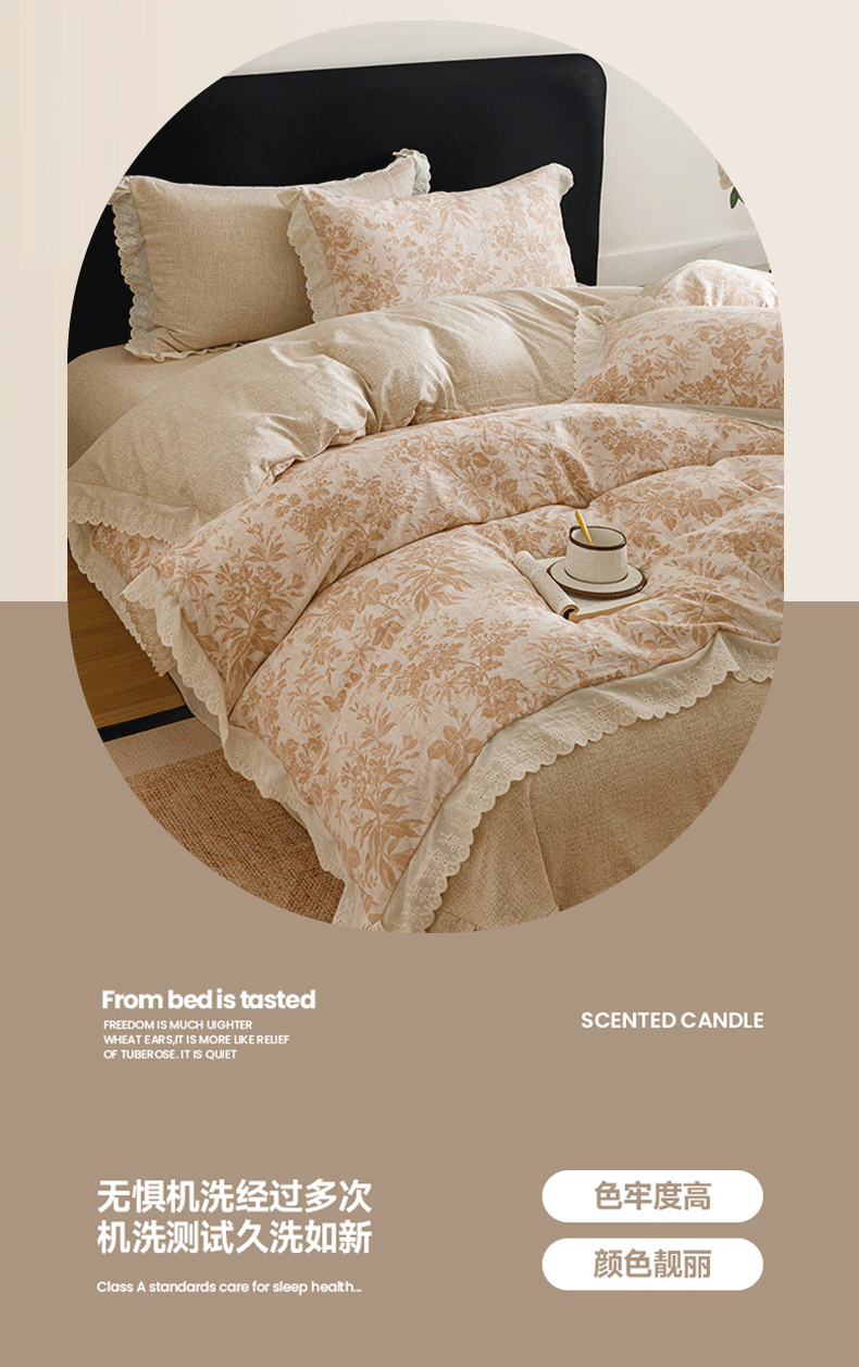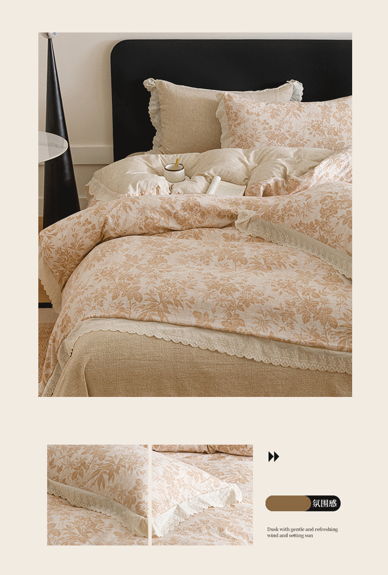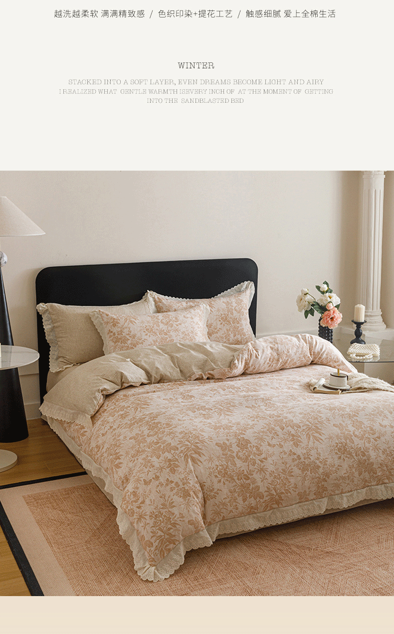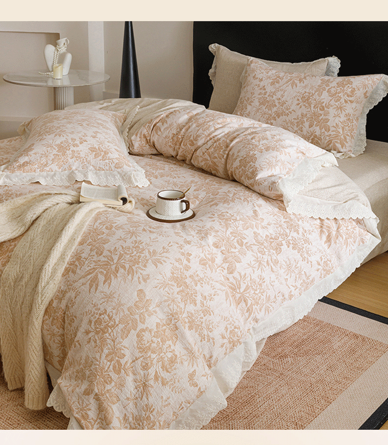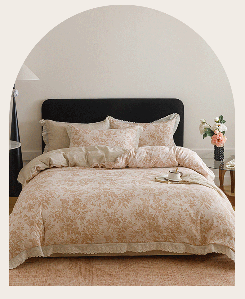 商品名称:悦然毛巾被 2026春夏新款加厚原麻水洗复古风四件套亚麻提花花边四件套 木棉花信