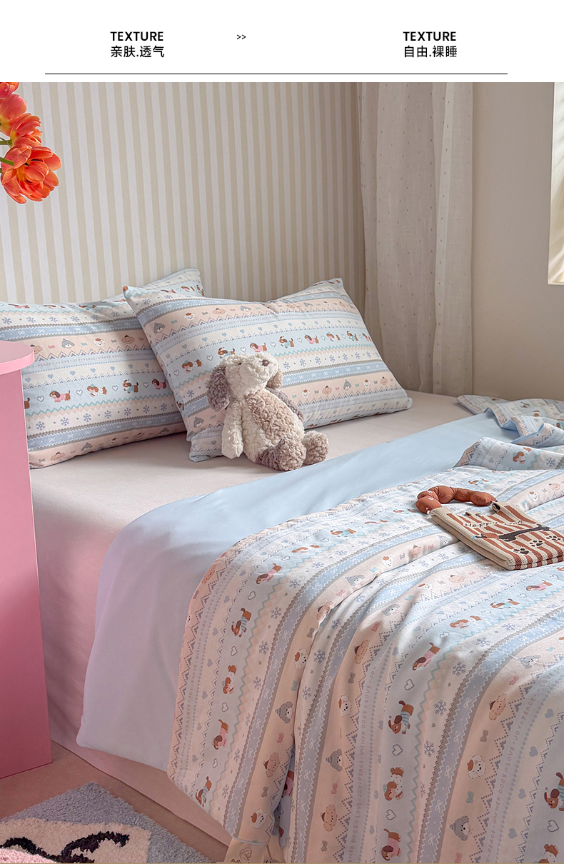 (总)麦伦家居 2026年春夏新款全棉纯棉有氧双层纱印花四件套-第二波,组合图仅供展示-不可下单,白露,花香粉,萌星粉,木马乐园,俏皮熊猫,甜梦汪汪,兔兔茉莉,心动狗狗,云锦兔-粉,云锦兔-蓝