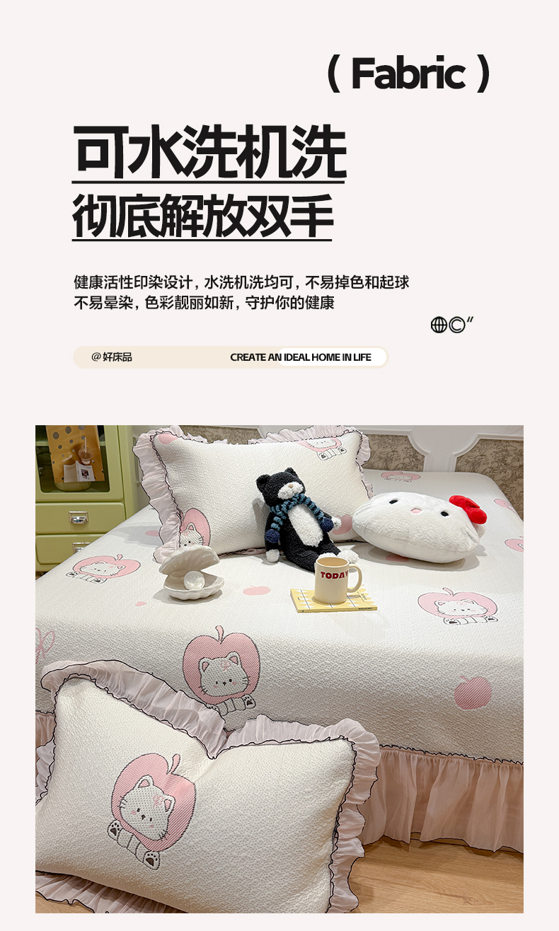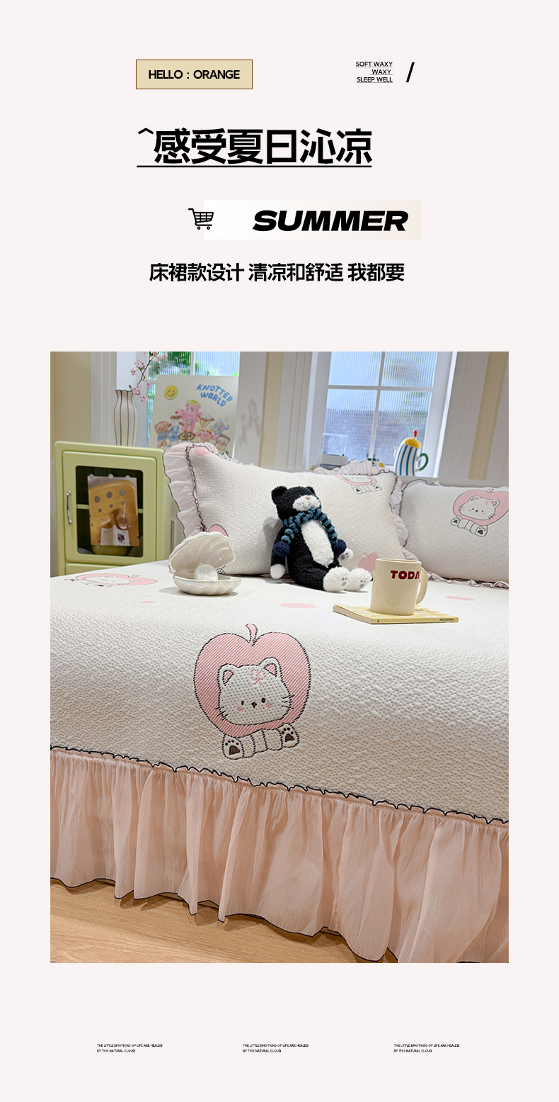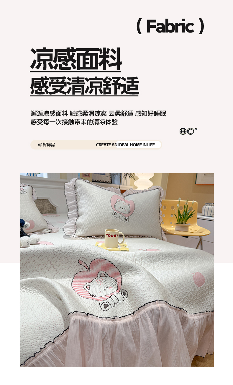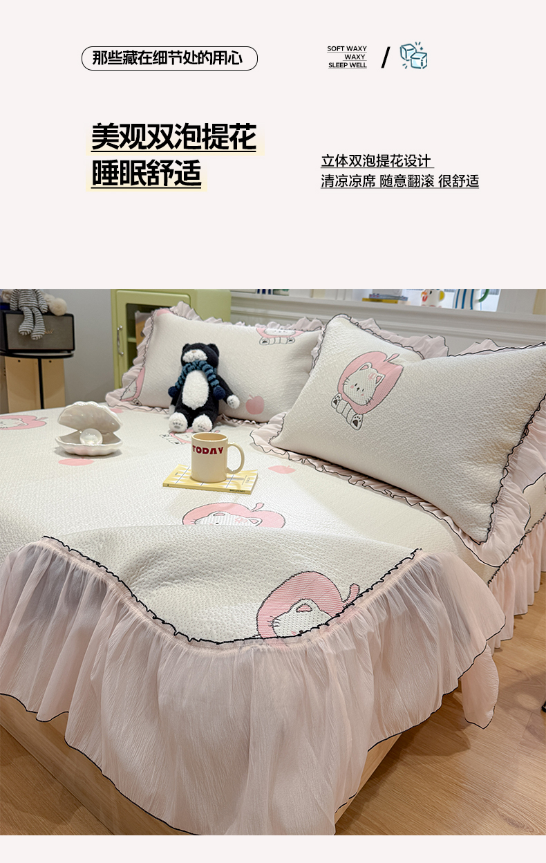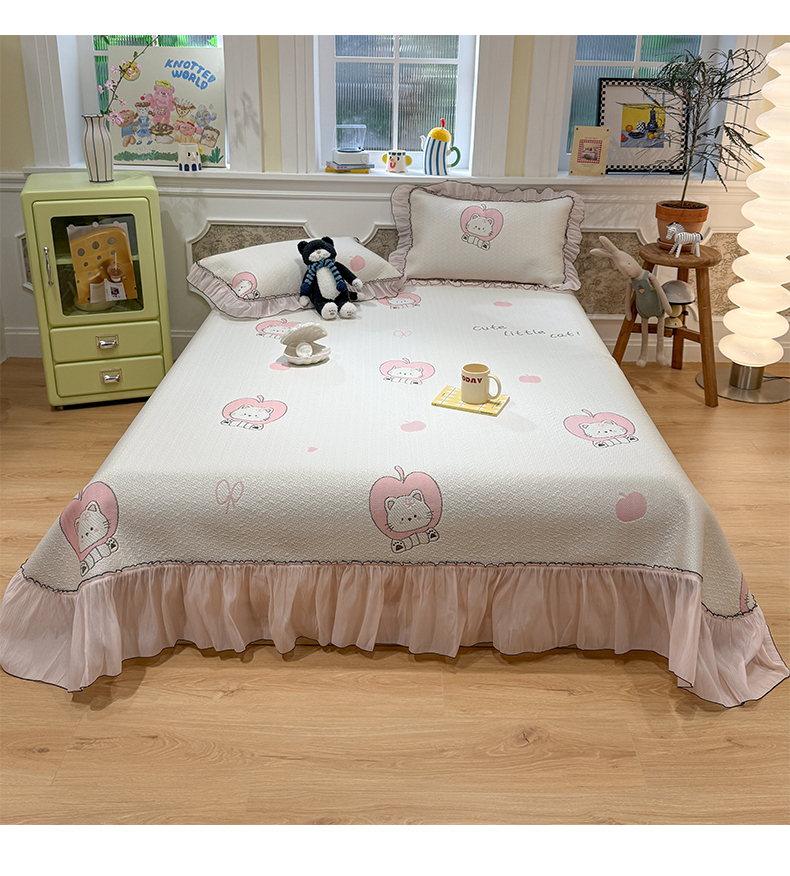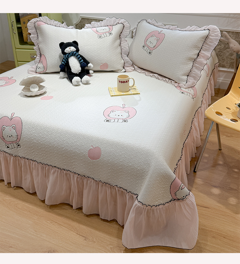 商品名称:雅居纺家纺 2026新款PE凉感卡通床裙床盖凉席韩版花边加厚三明治底PE凉感席 萌萌苹安果
