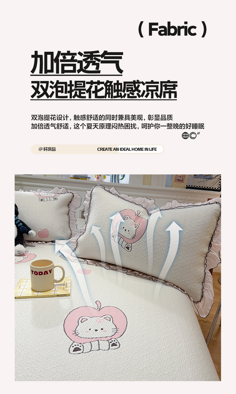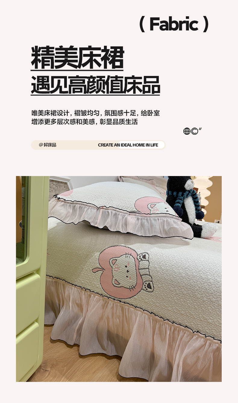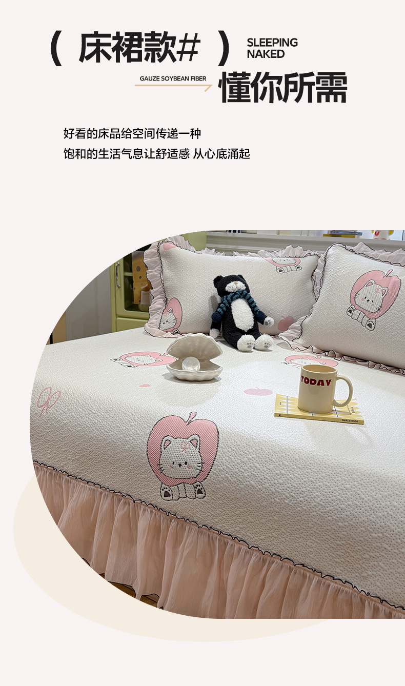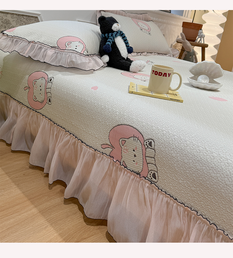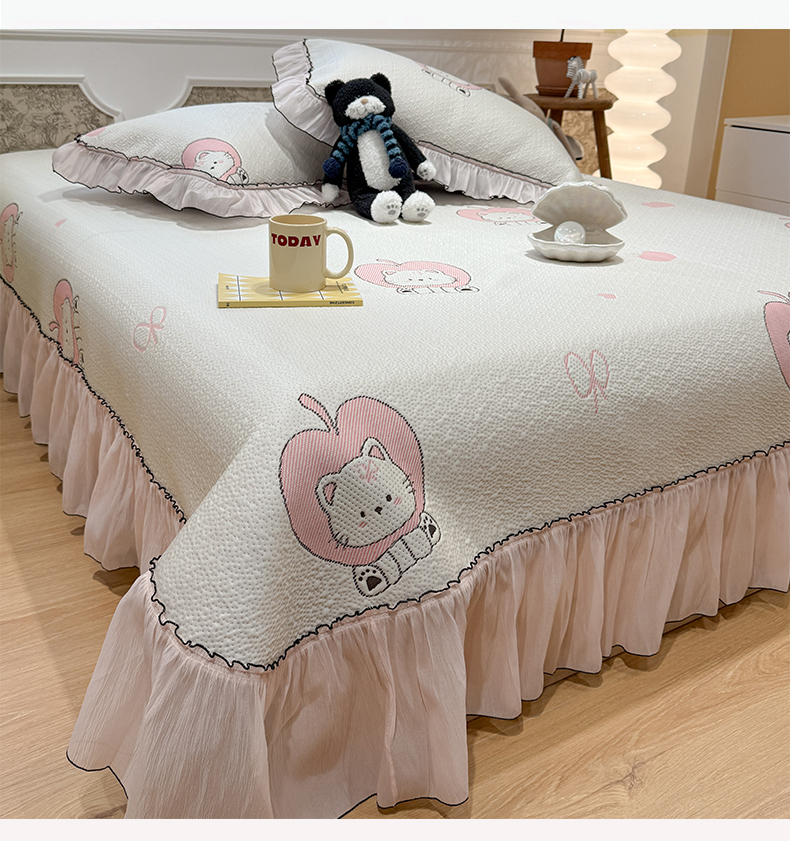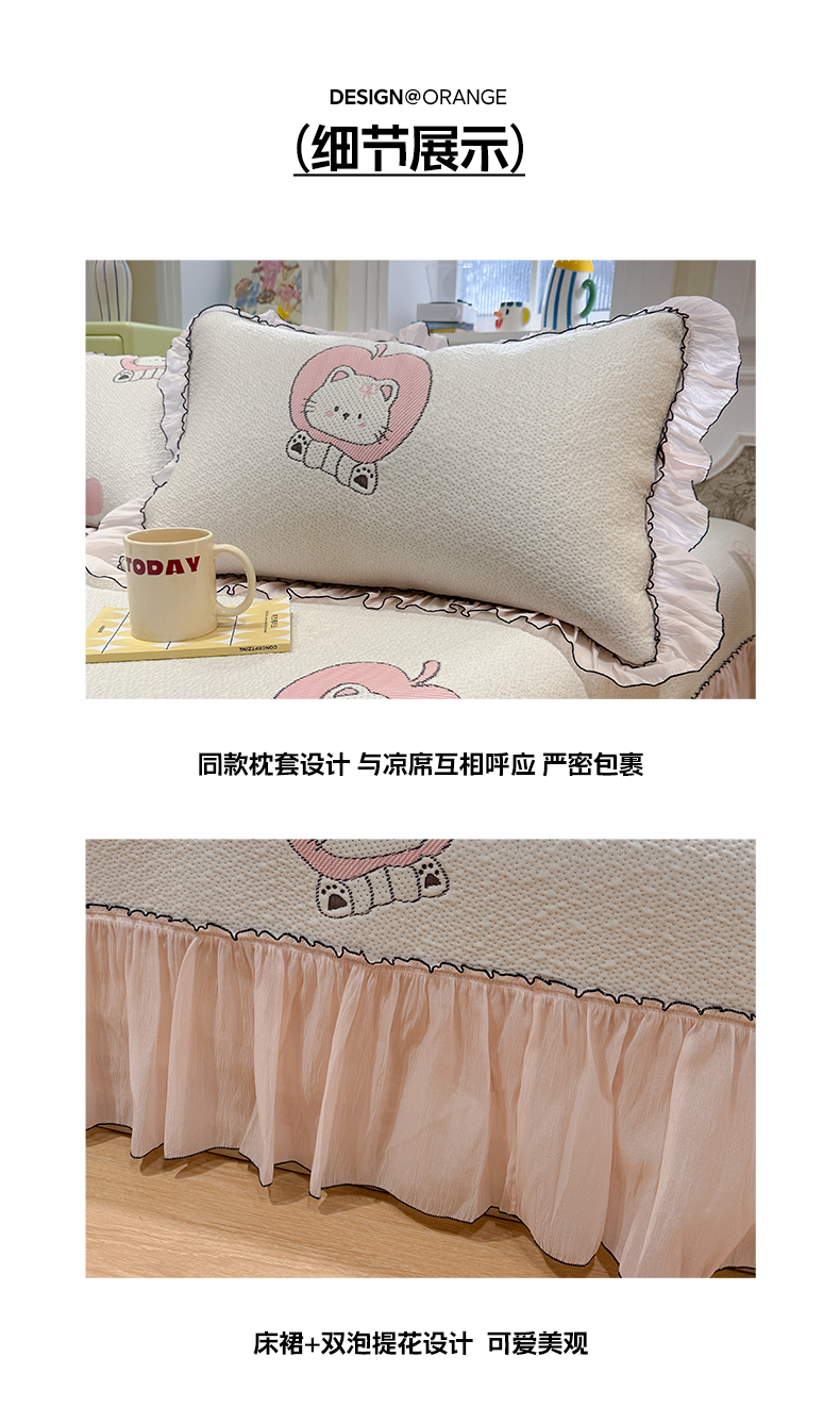 (总)雅居纺家纺 2026新款PE凉感卡通床裙床盖凉席韩版花边加厚三明治底PE凉感席,粉色猫咪家族,粉色星星腊肠狗,萌萌苹安果,汪星人,夏日苹果狗,幸运酷熊
