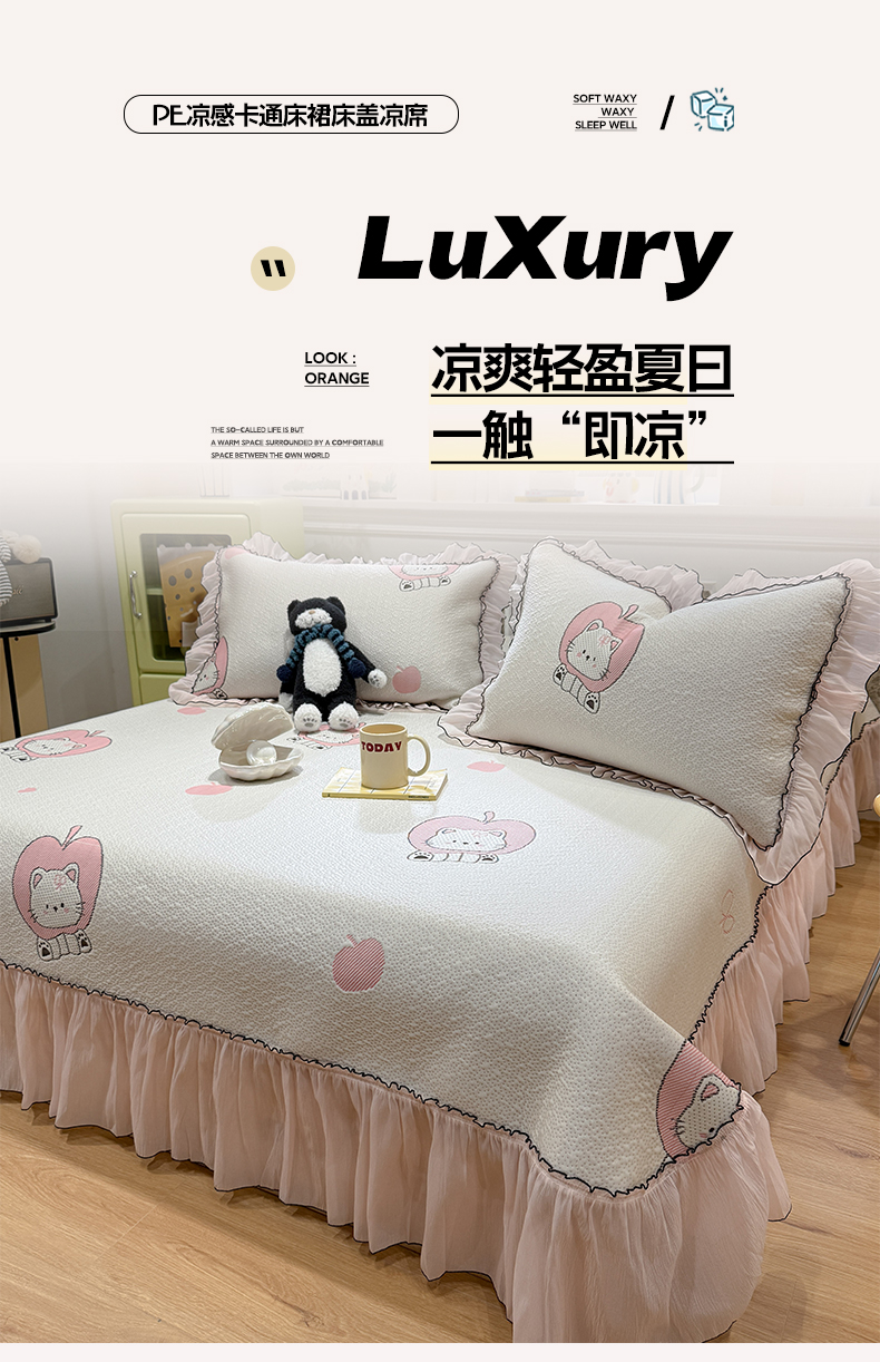 雅居纺家纺 2026新款PE凉感卡通床裙床盖凉席韩版花边加厚三明治底PE凉感席 萌萌苹安果