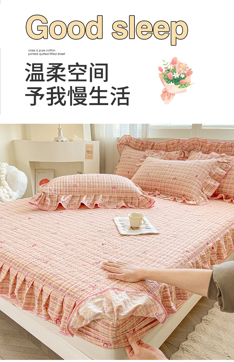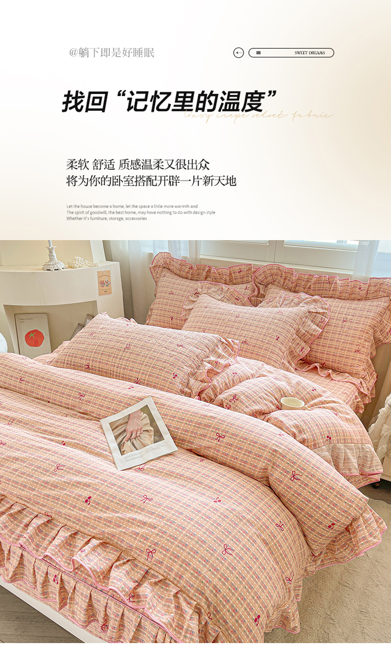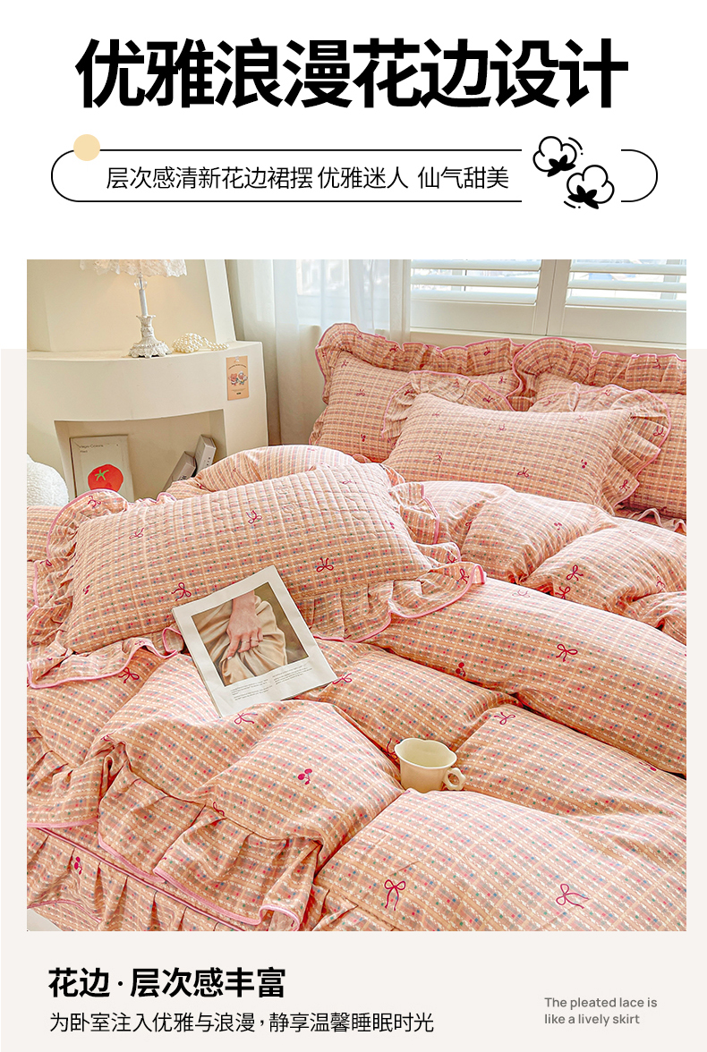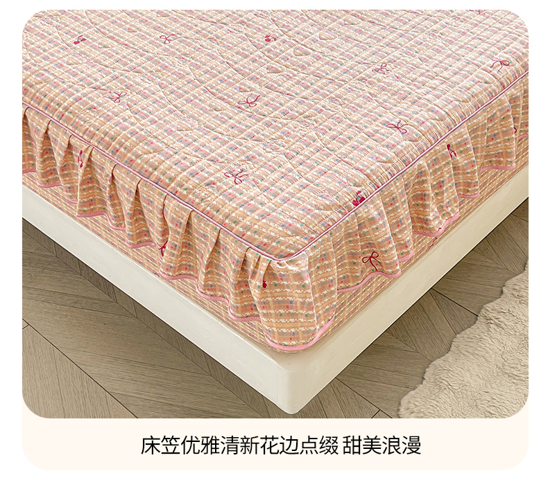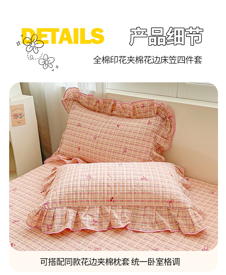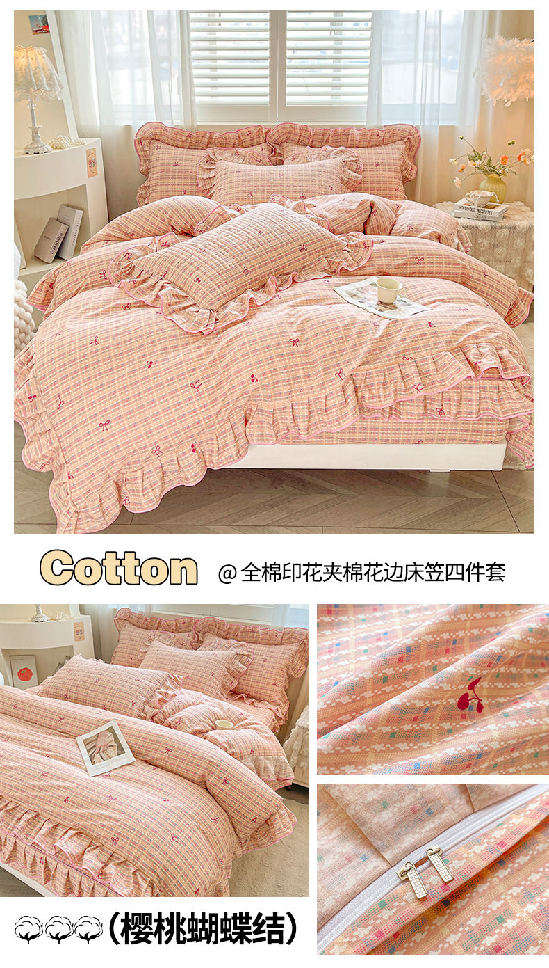 当前位置: 91家纺网 > 商品网购 > 床品套件 > 四件套 > 全棉普通四件套 > 宜凡家纺 2026新款全棉印花夹棉花边床笠套件②--四件套 樱桃蝴蝶结