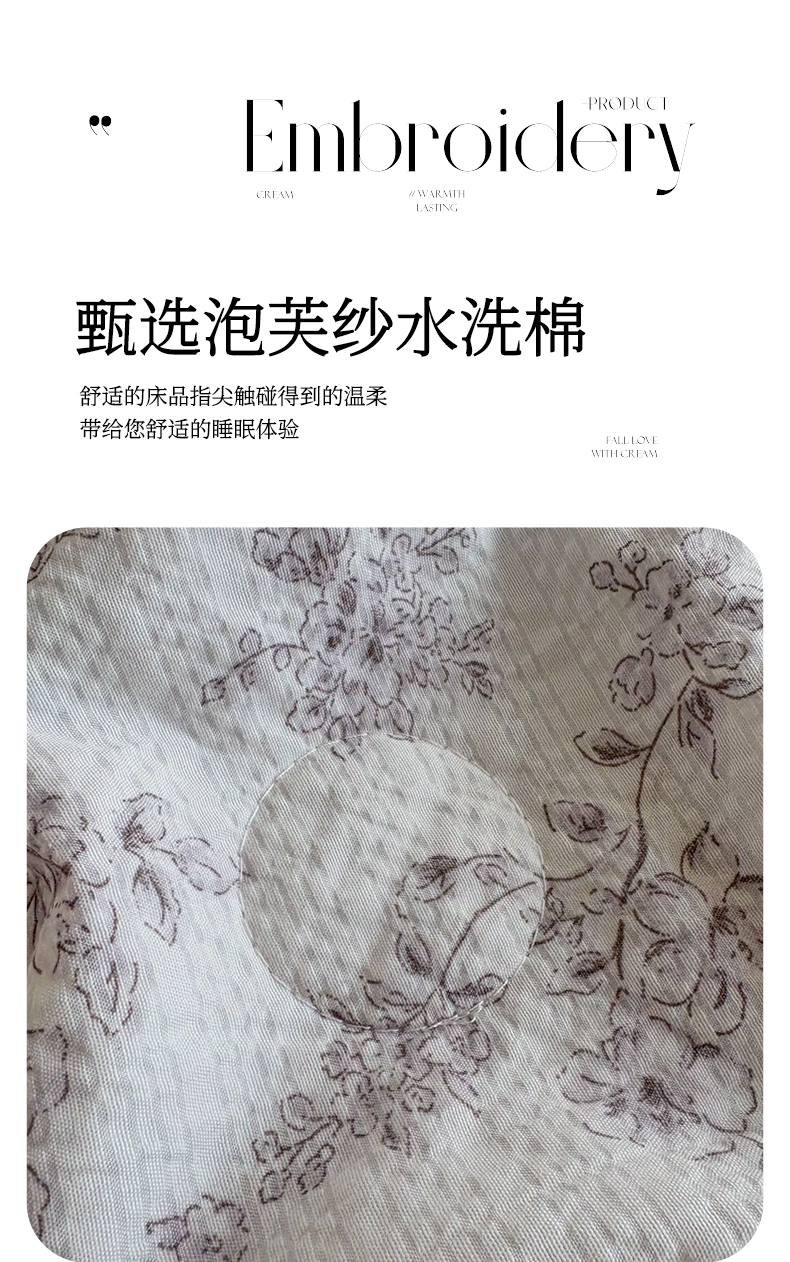 商品名称:铠畅家纺 2026新款泡芙纱水洗棉夏被四件套 灰影花眠