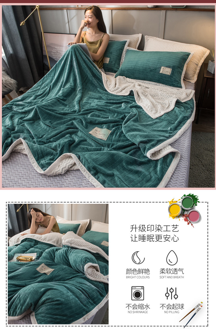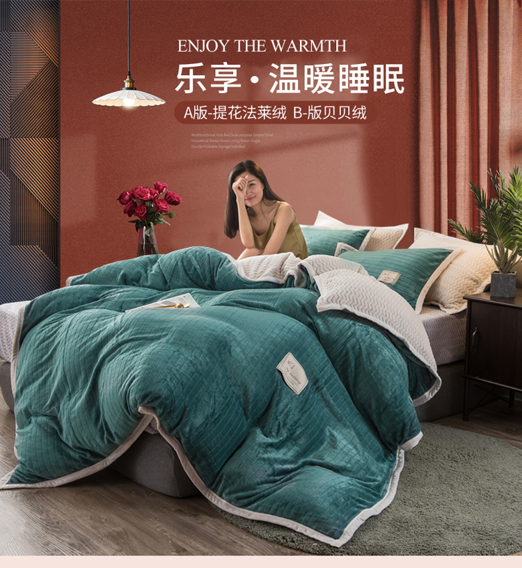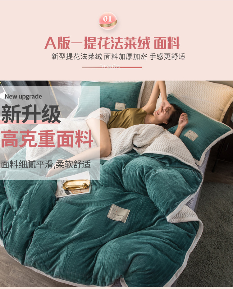 欧冠 2019提花法莱绒加贝贝绒加厚四件套 果绿白