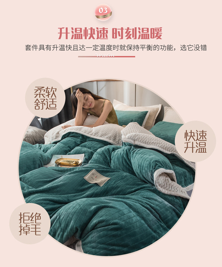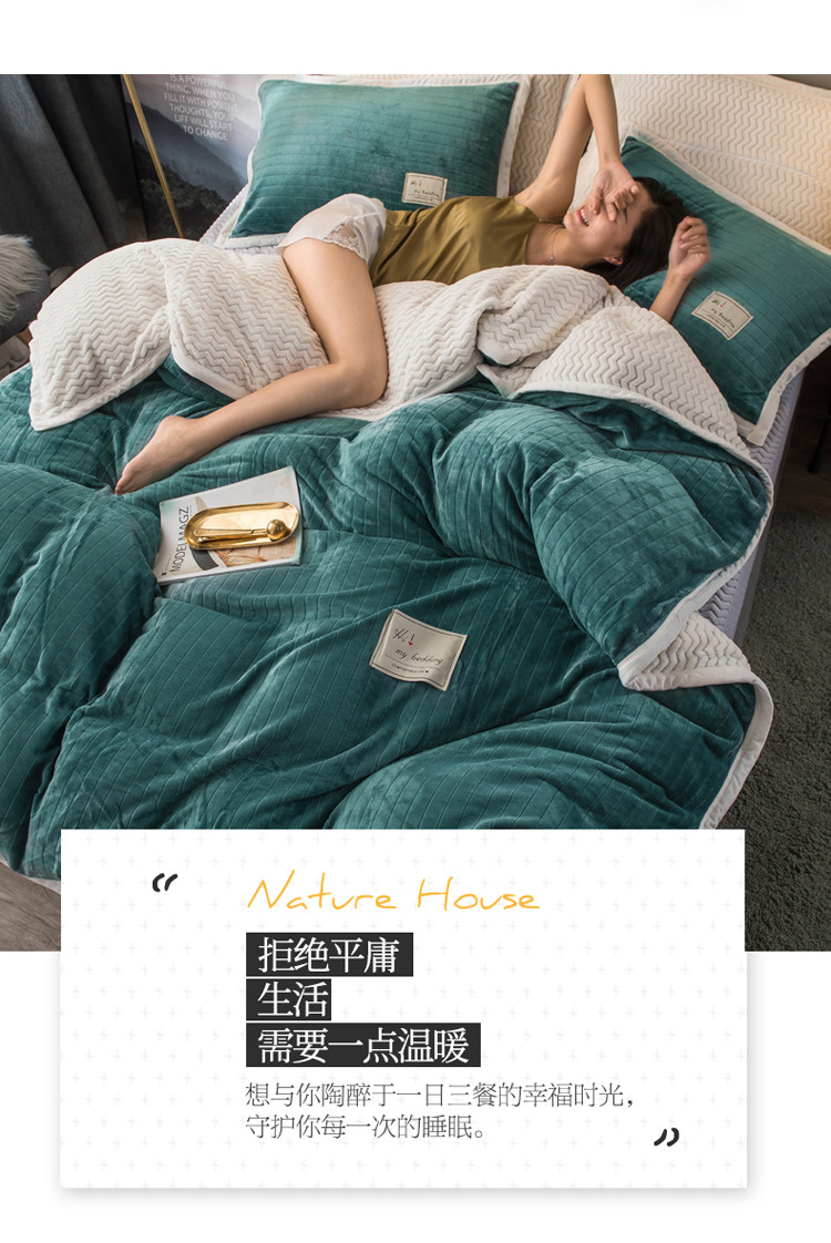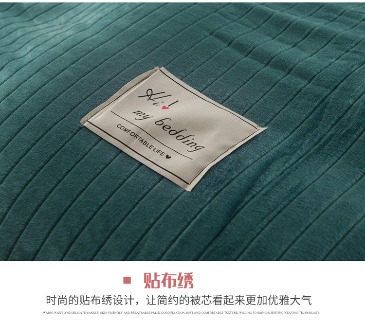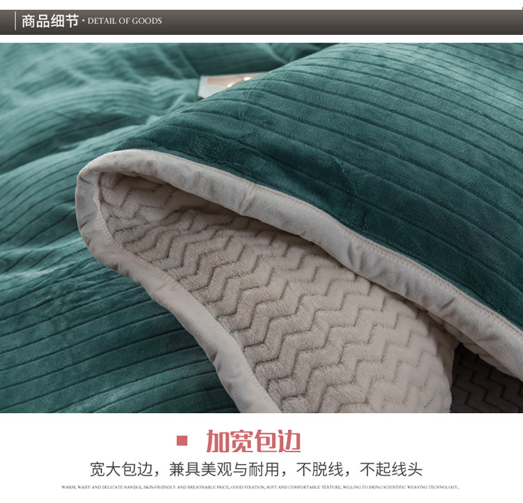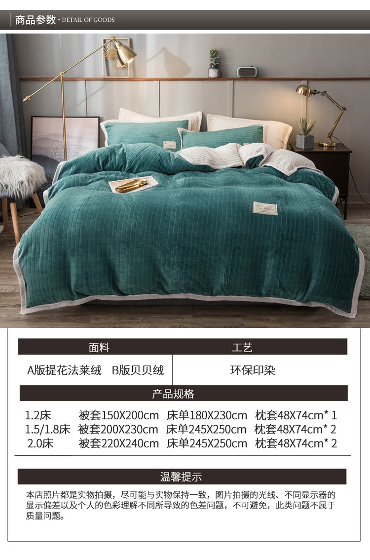 商品名称:欧冠 2019提花法莱绒加贝贝绒加厚四件套 果绿白