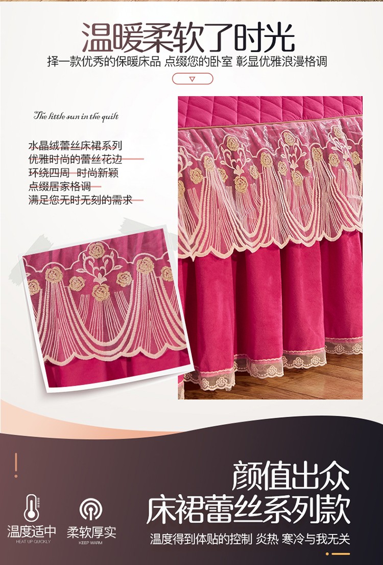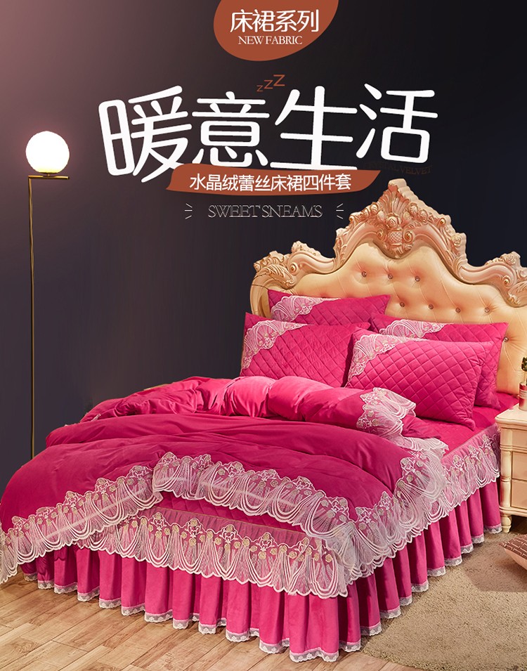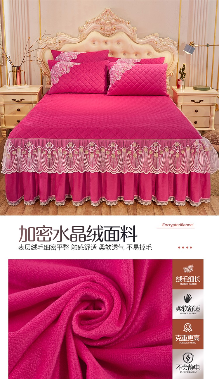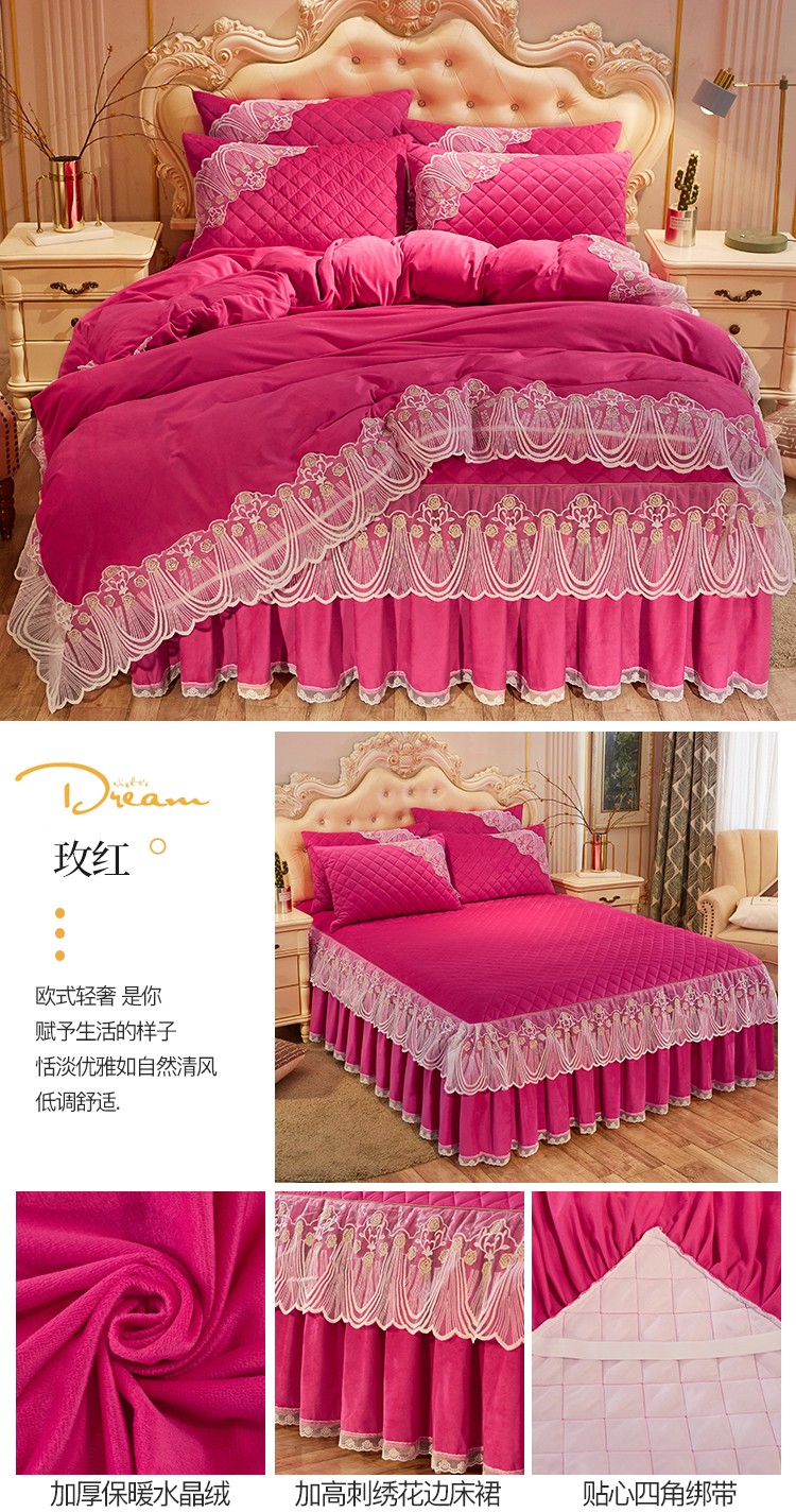 商品名称:网红馆 2025新款幸福花开水晶绒蕾丝床裙四件套 玫红