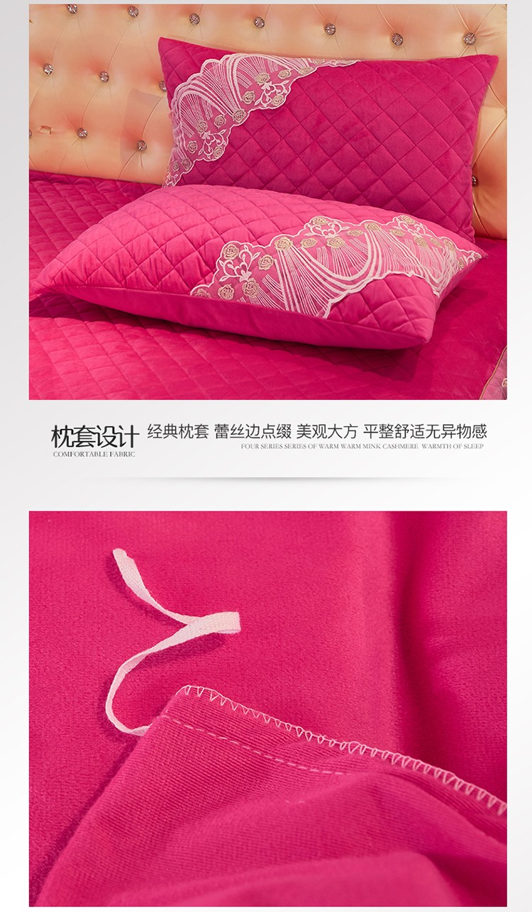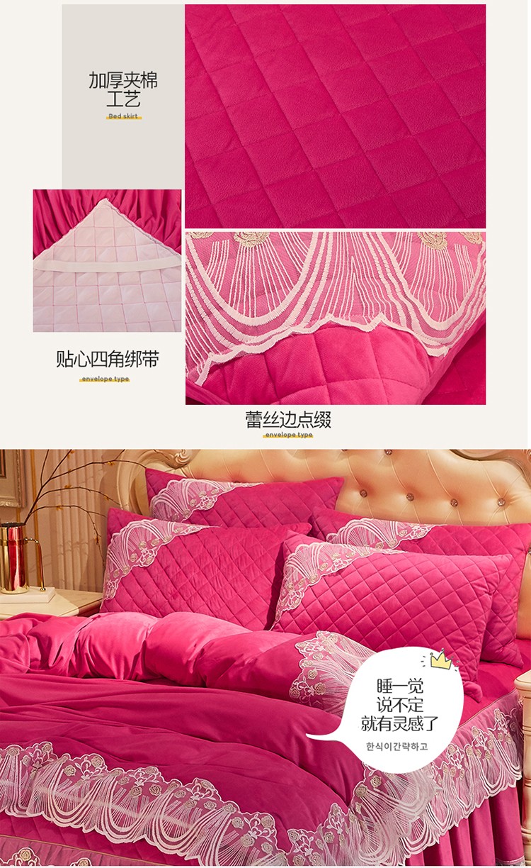 网红馆 2025新款幸福花开水晶绒蕾丝床裙四件套 玫红