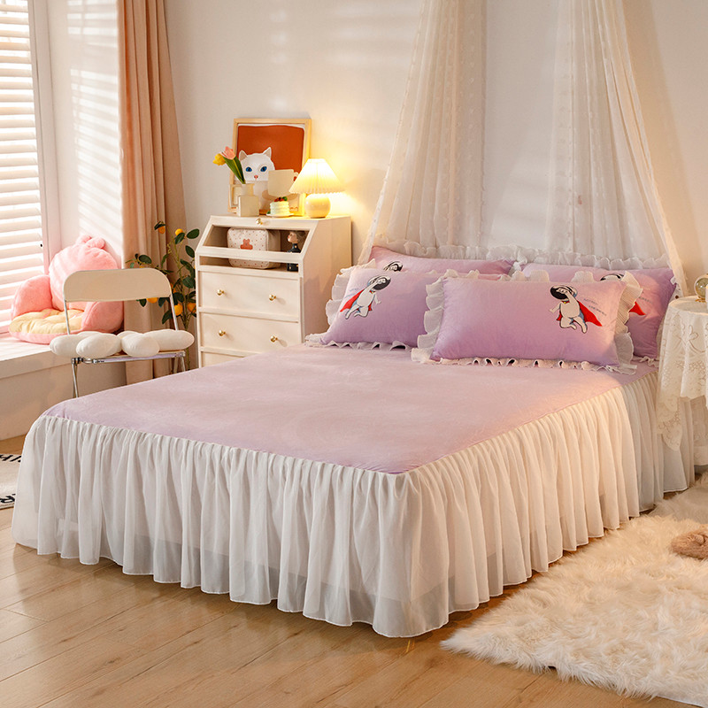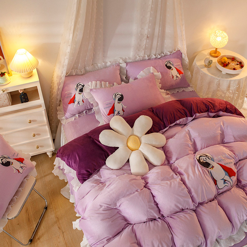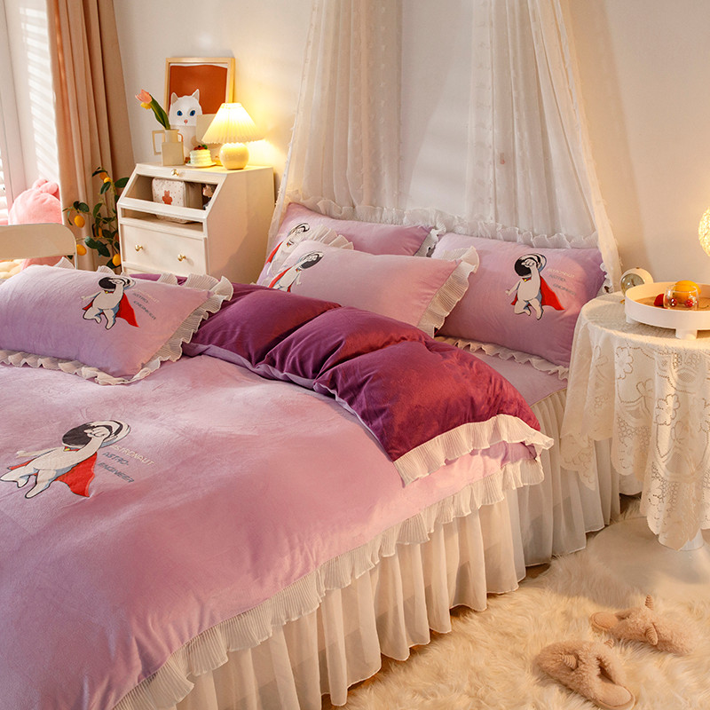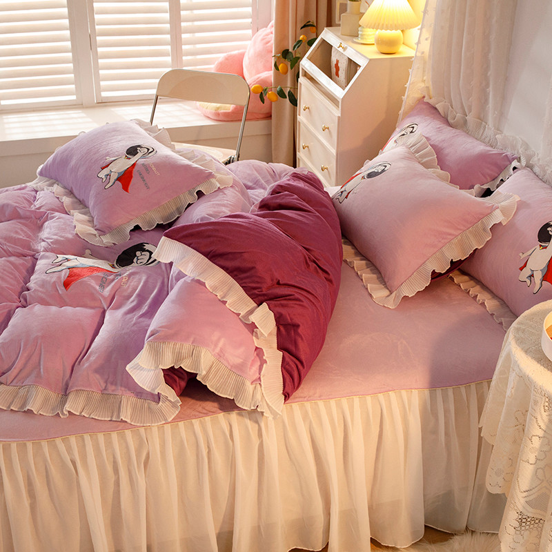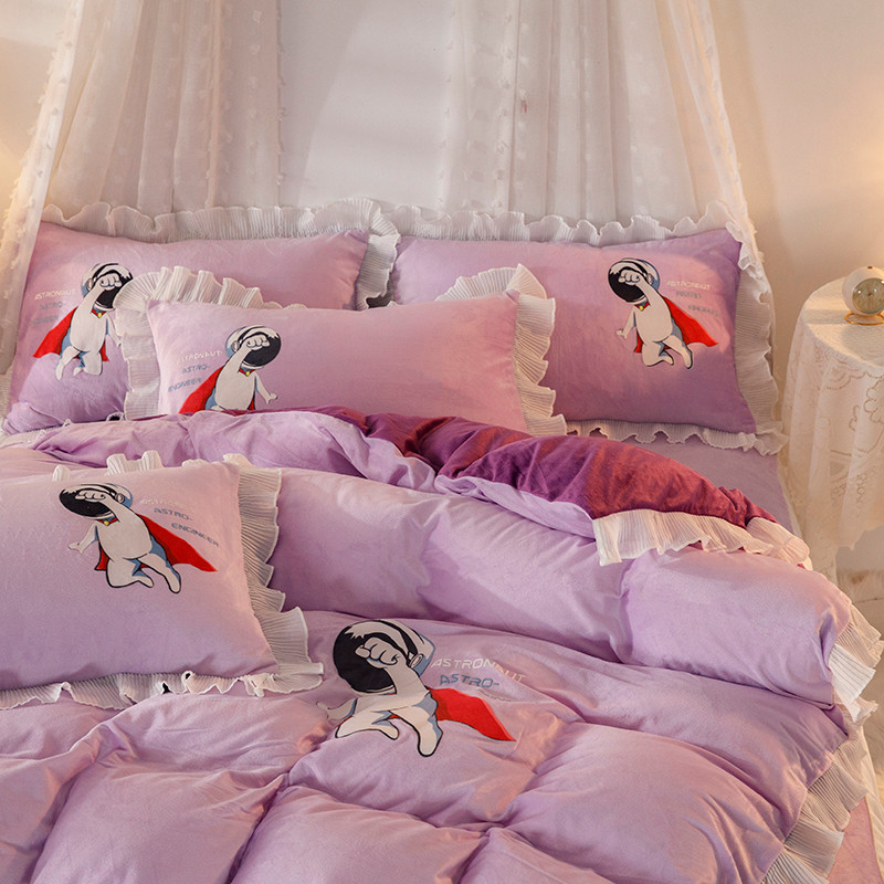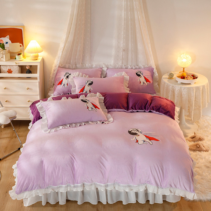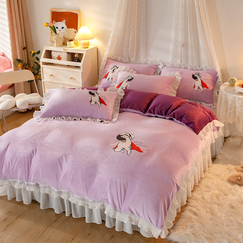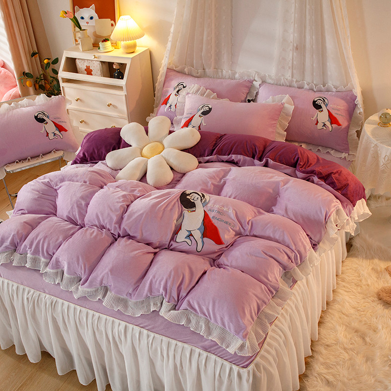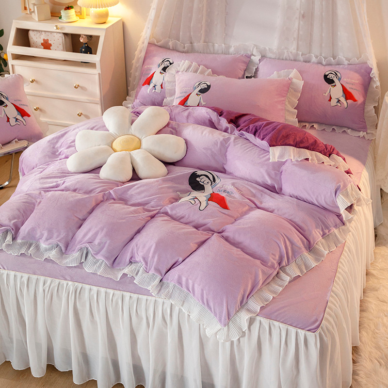 纽缦 2021新款韩版水晶绒床裙四件套 萌熊-深浅紫