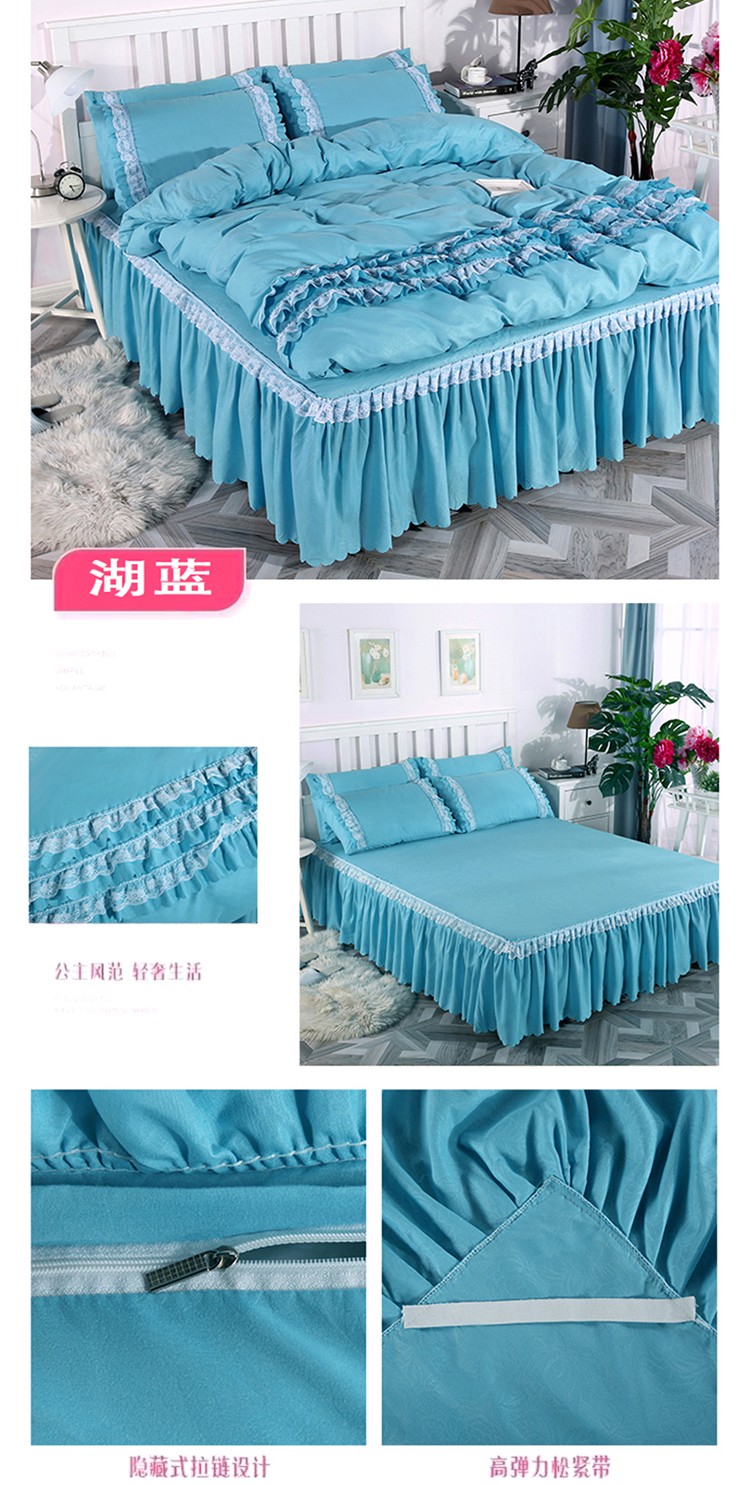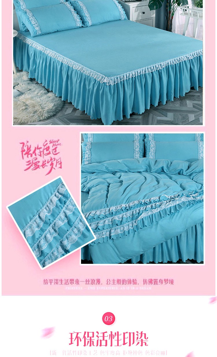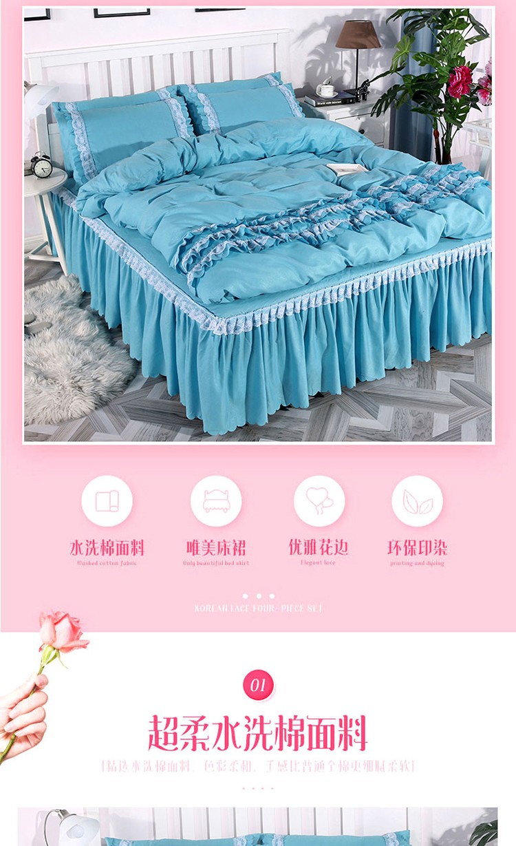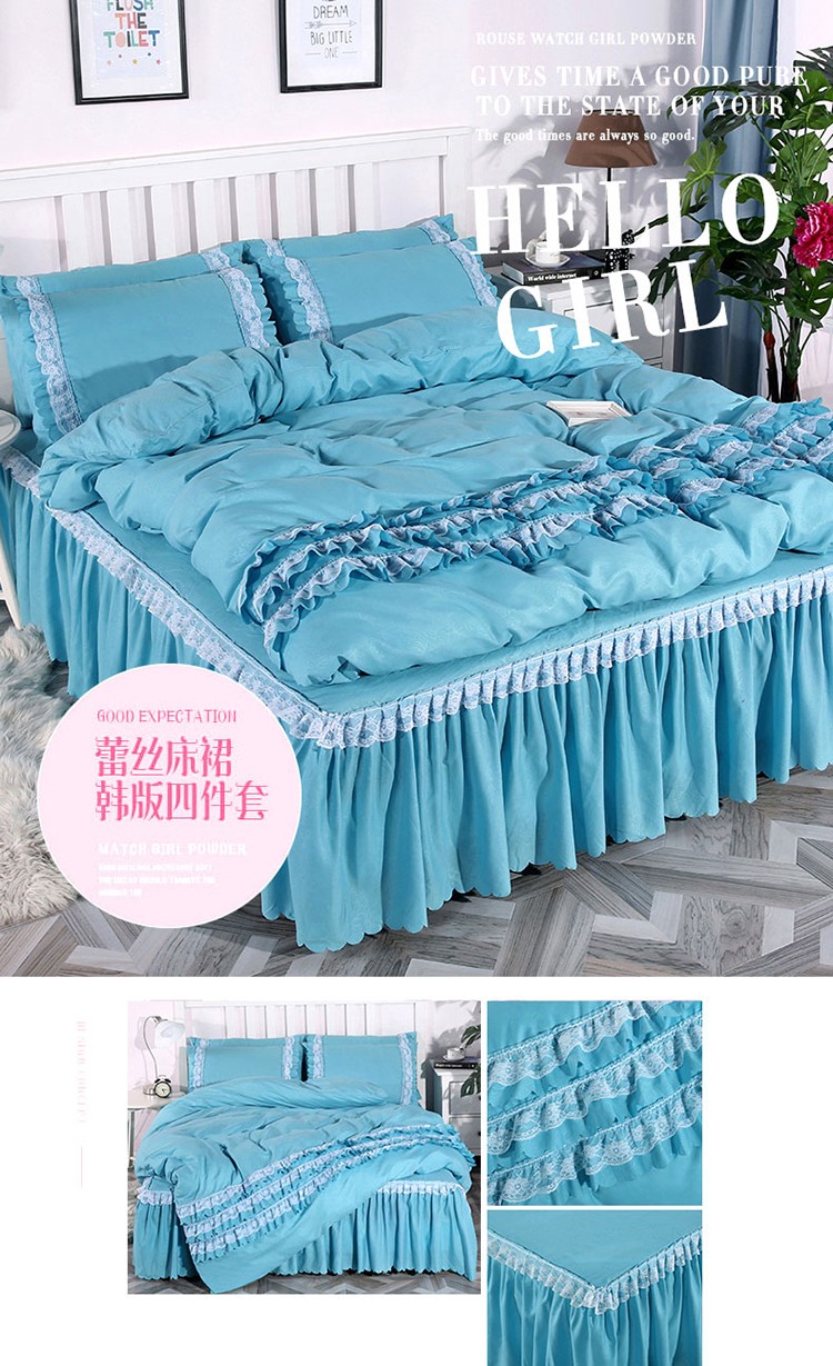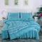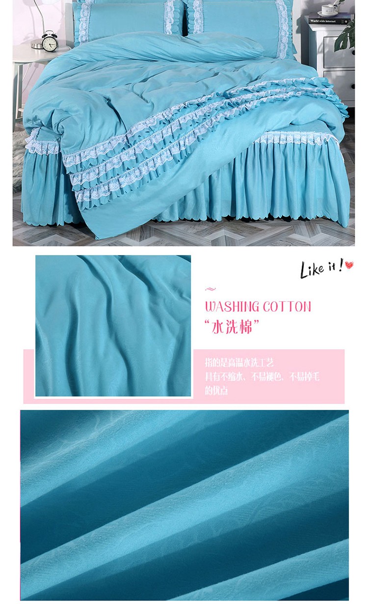 梦柏家纺 2021新款水洗棉蕾丝四件套 天湖蓝