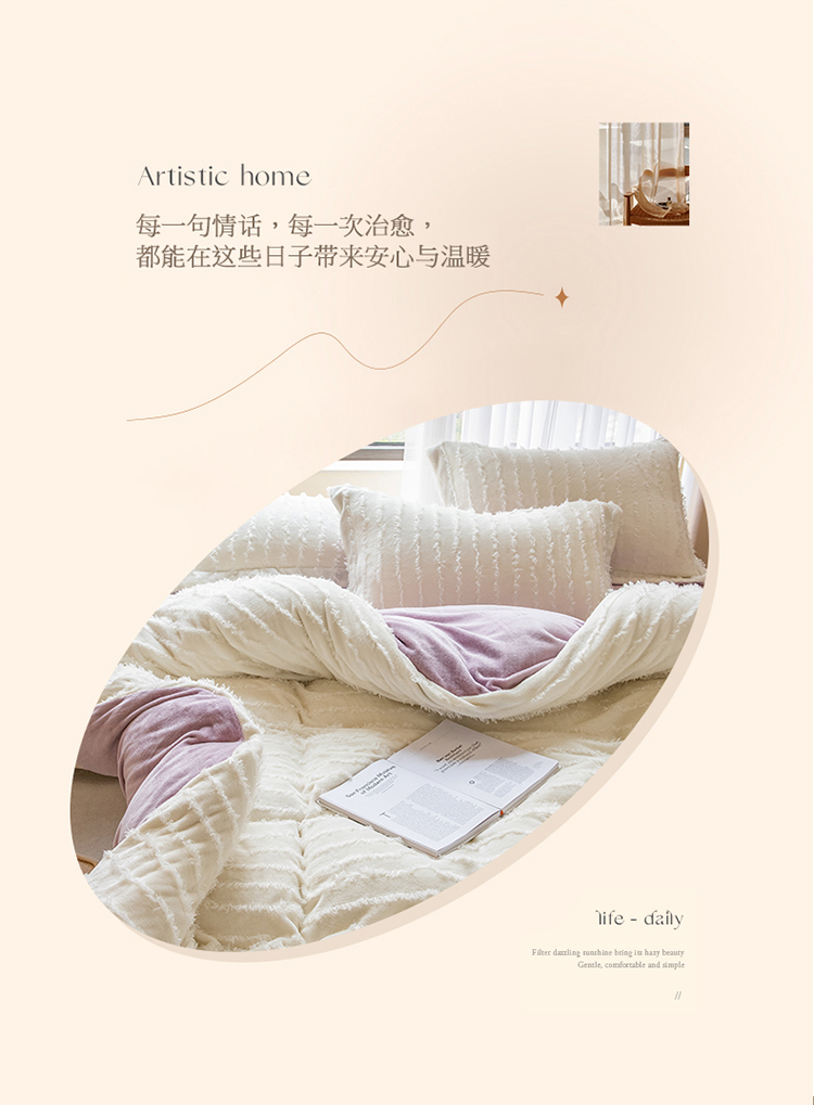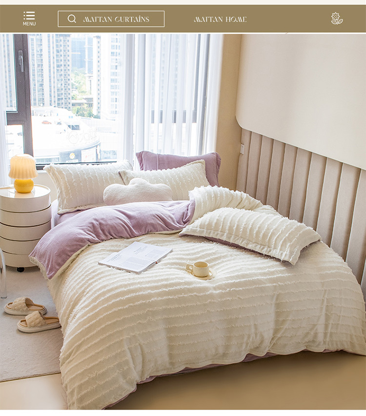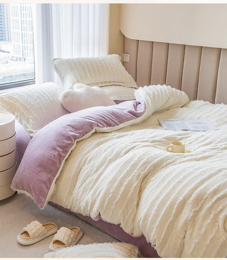 商品名称:骏腾 2022直播爆款纯色流苏牛奶绒四件套法莱宝宝绒 朵拉-奶白芋紫