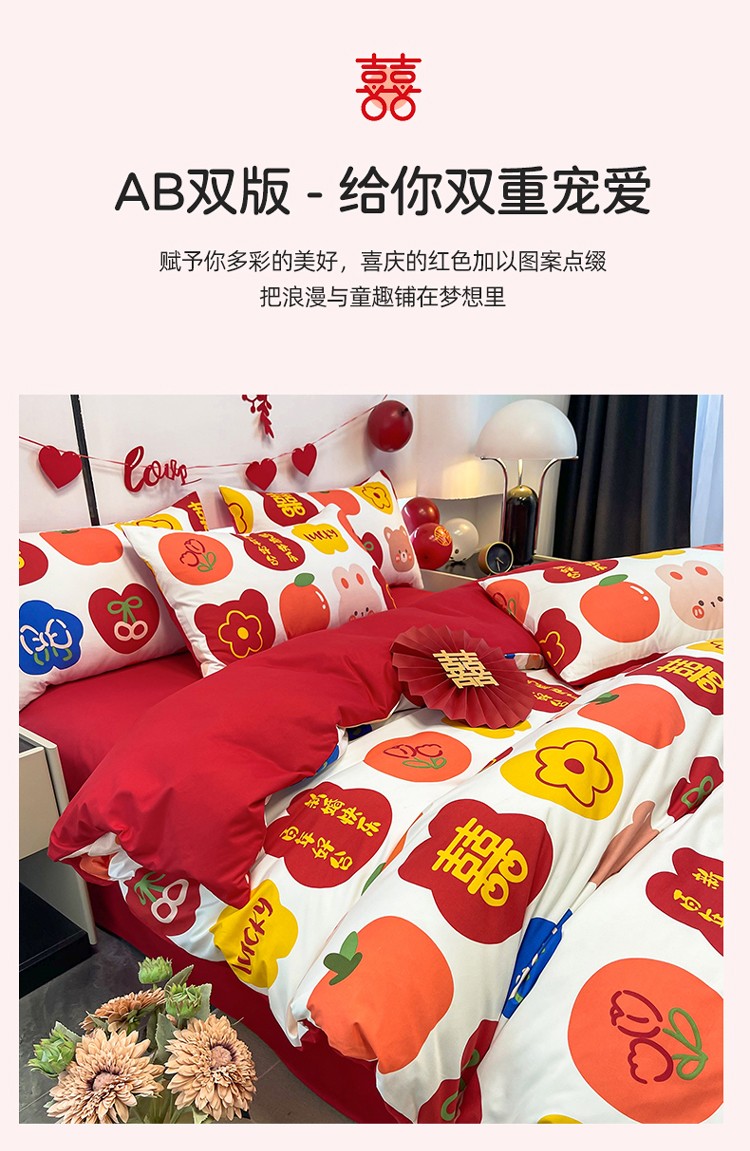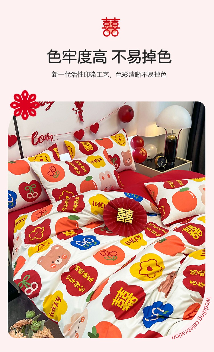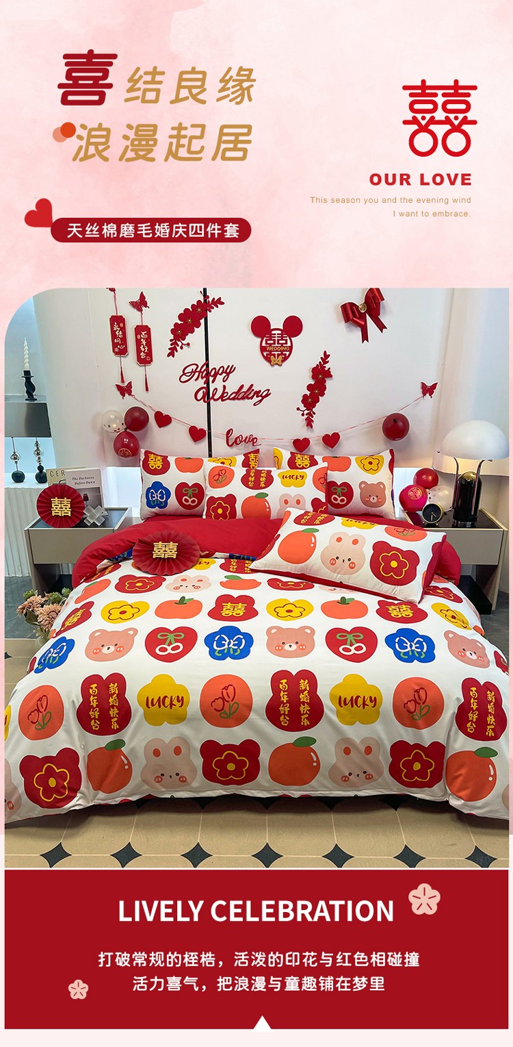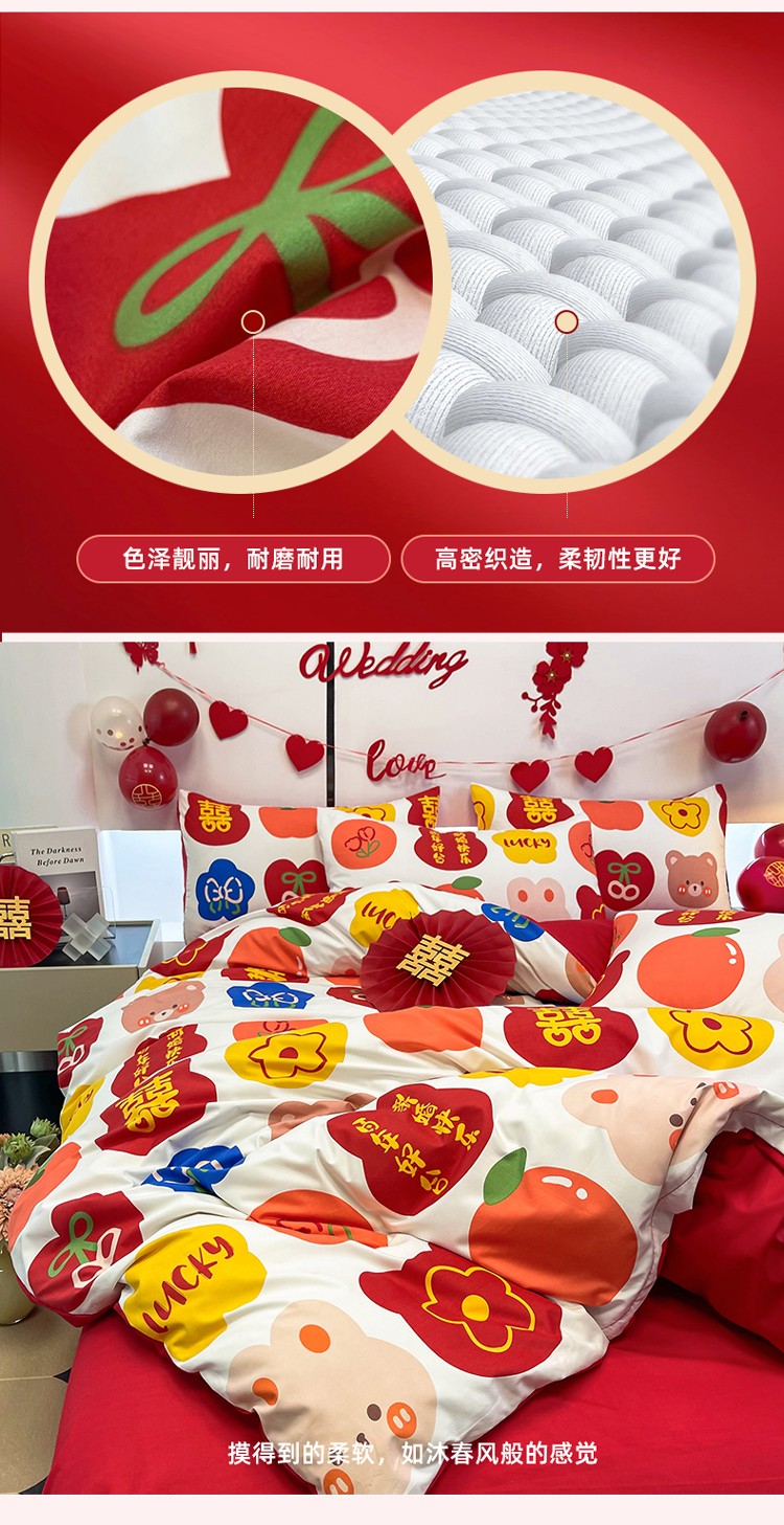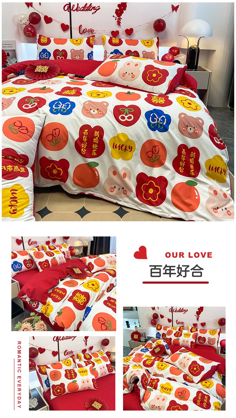 宏源 2022年新款大红时尚磨毛婚庆四件套 百年好合