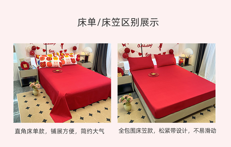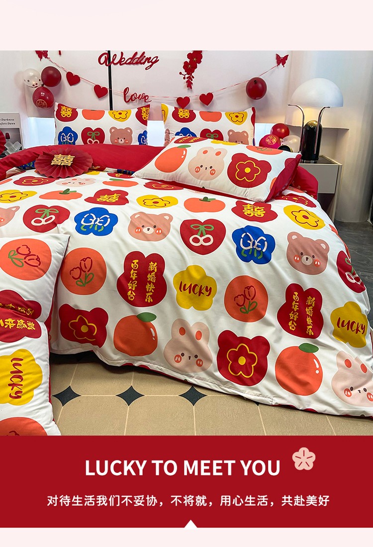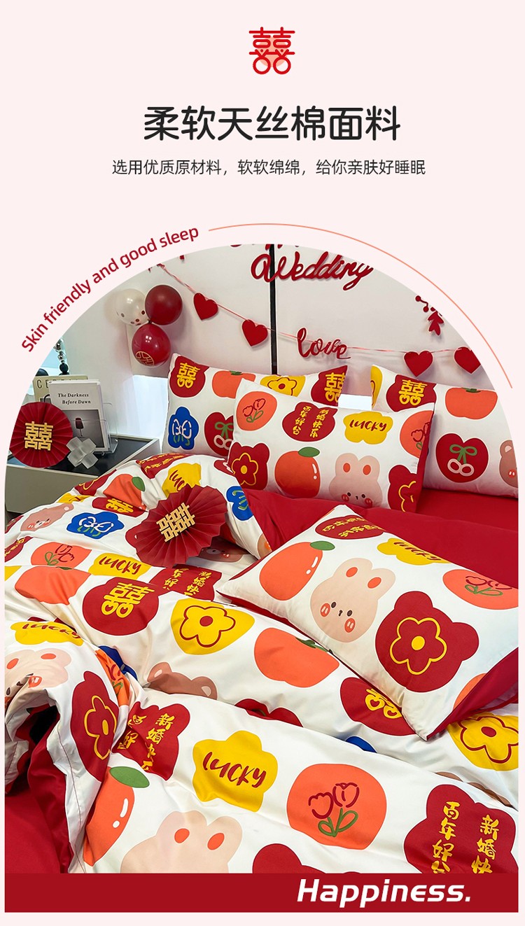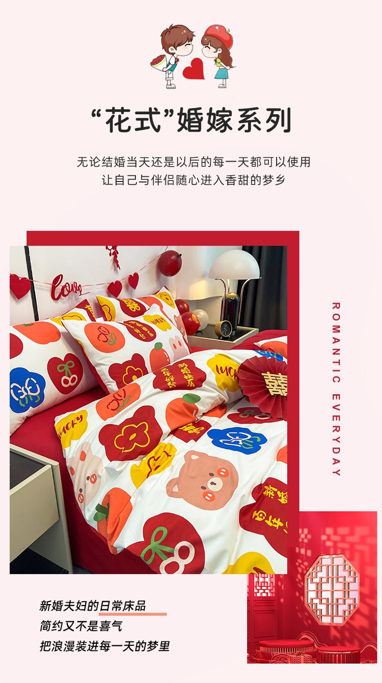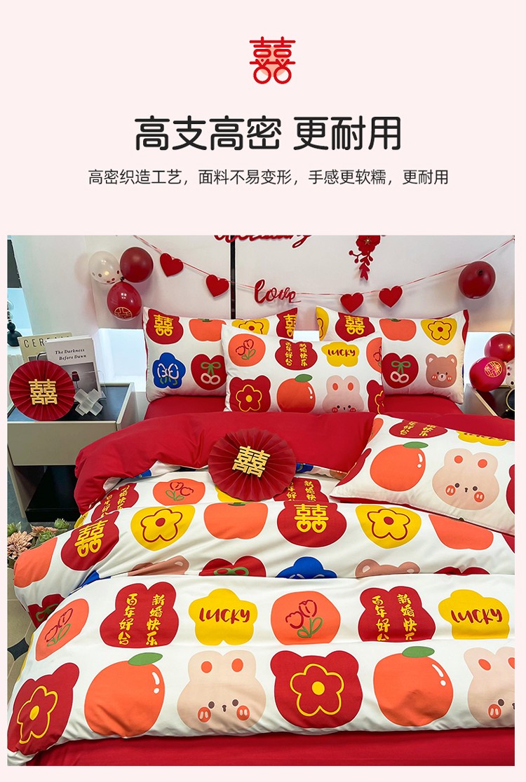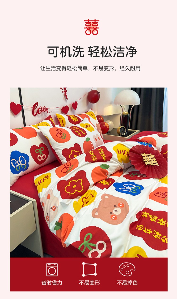 宏源 2022年新款大红时尚磨毛婚庆四件套 百年好合