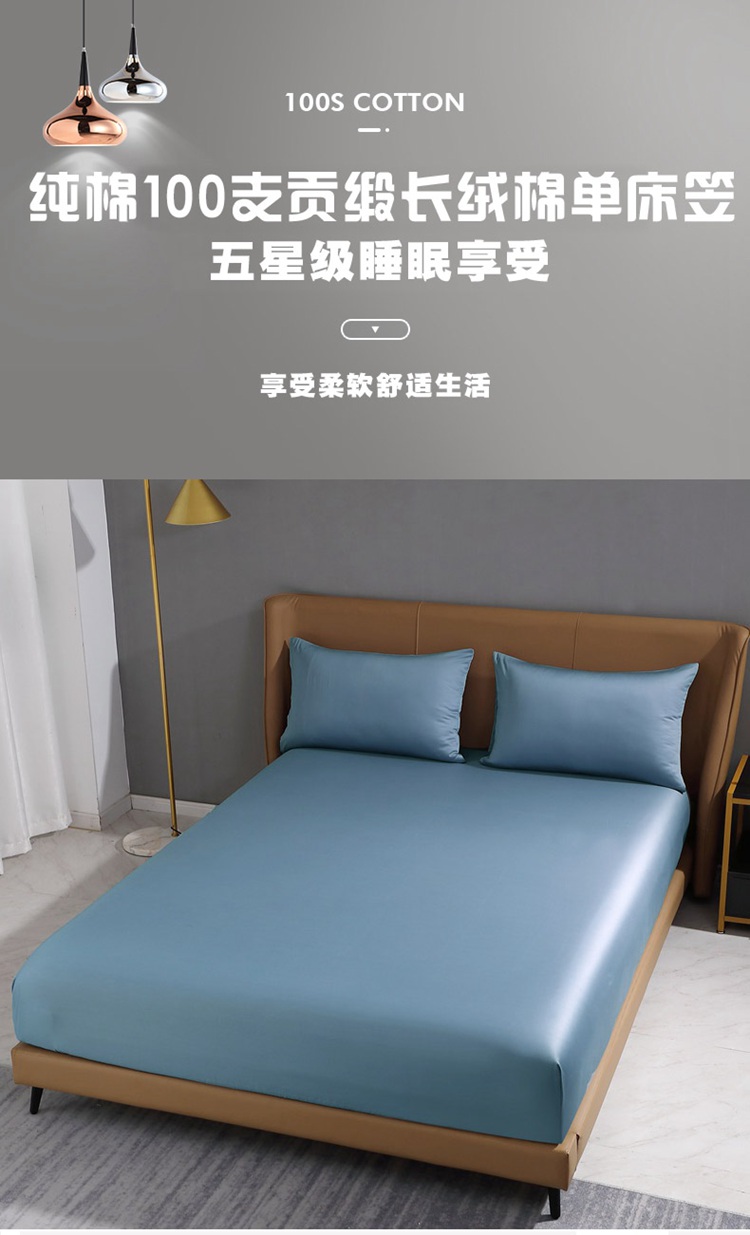 晶缦家纺 2023新款纯棉50支双股全棉贡缎长绒棉纯色单床笠单件单品 纯沐-天青蓝