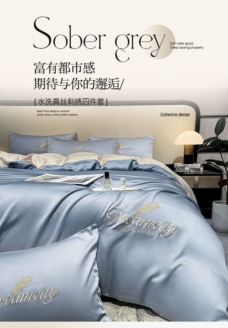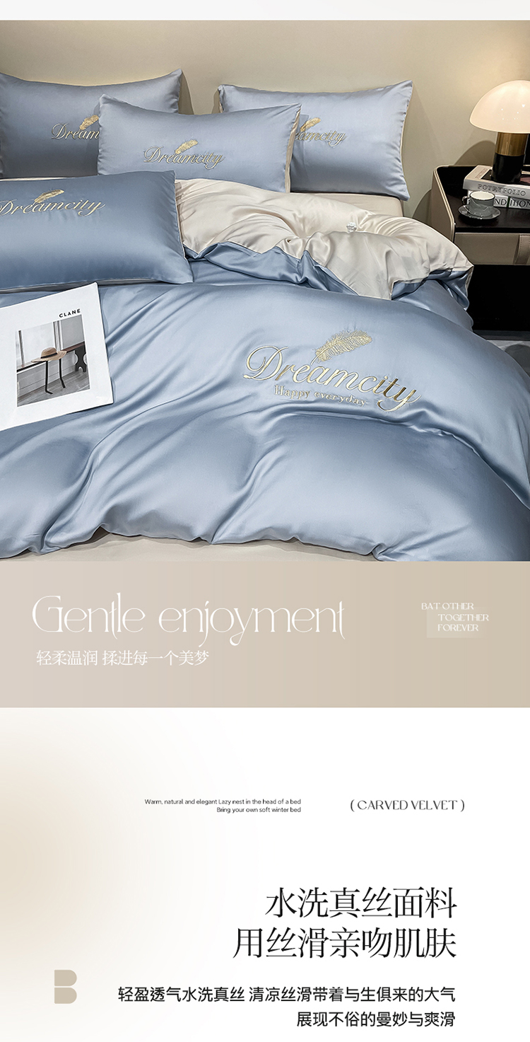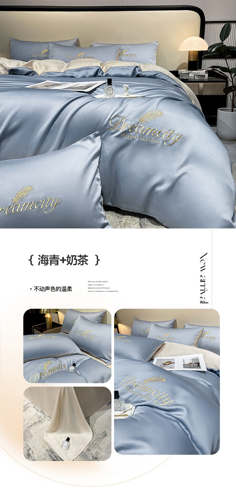 商品名称:花愿 2025新款水洗真丝刺绣四件套-羽梦系列 海青+奶茶
