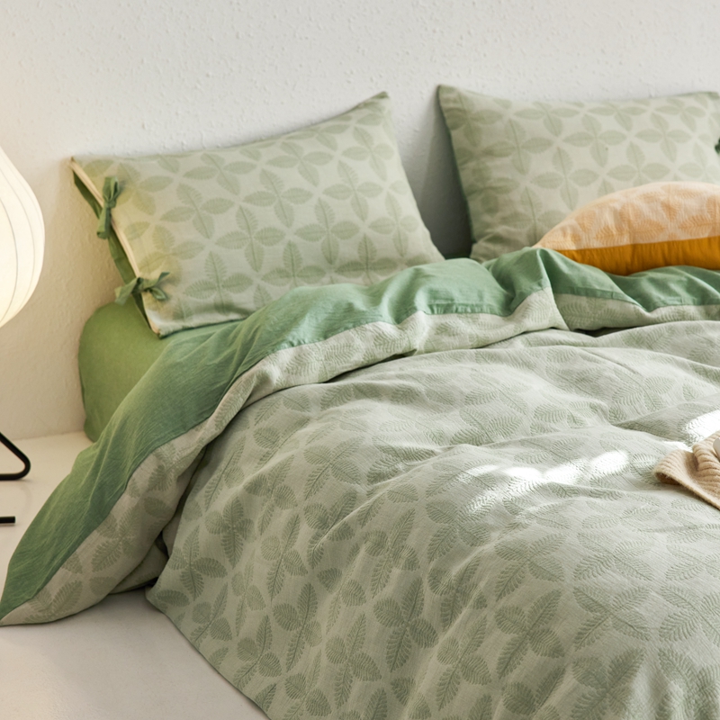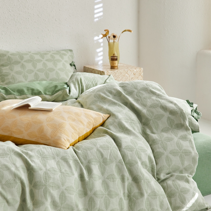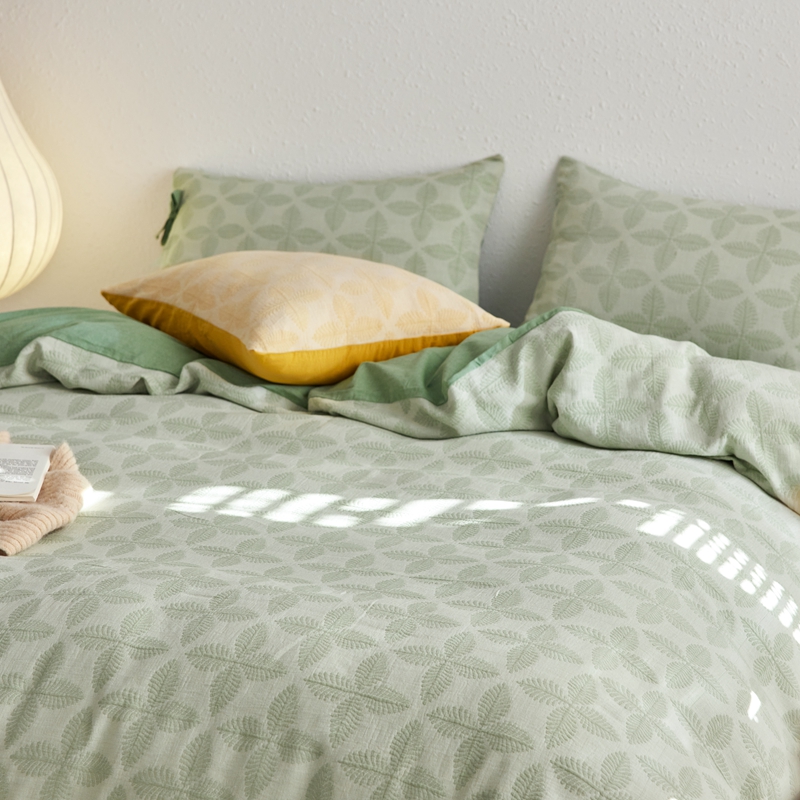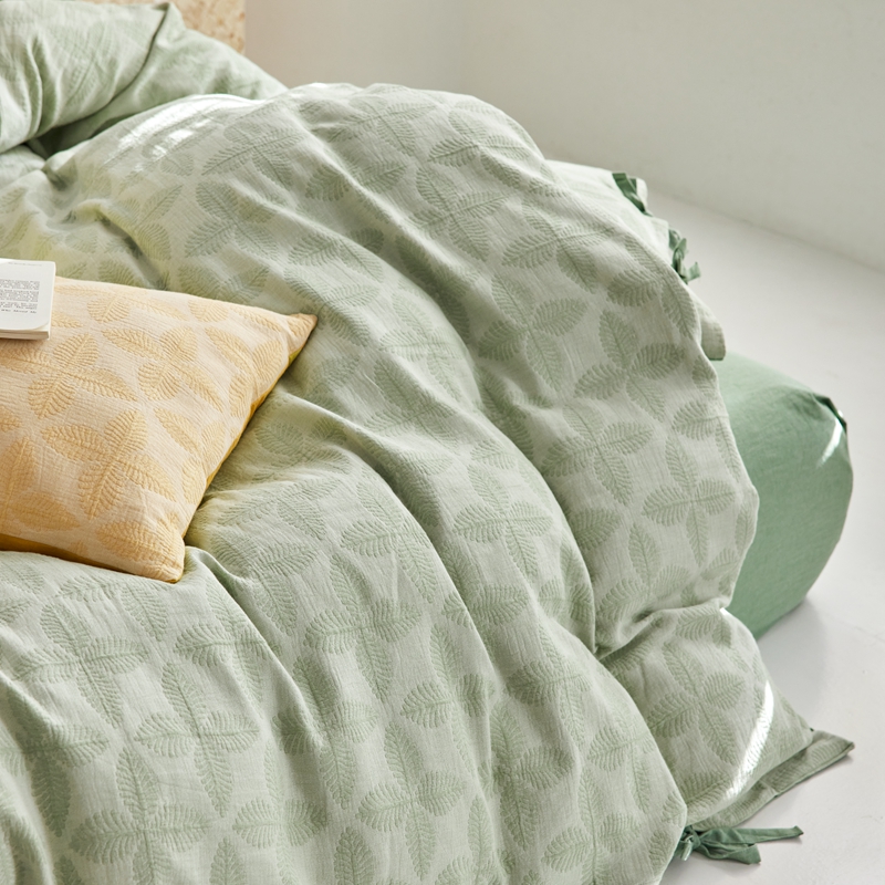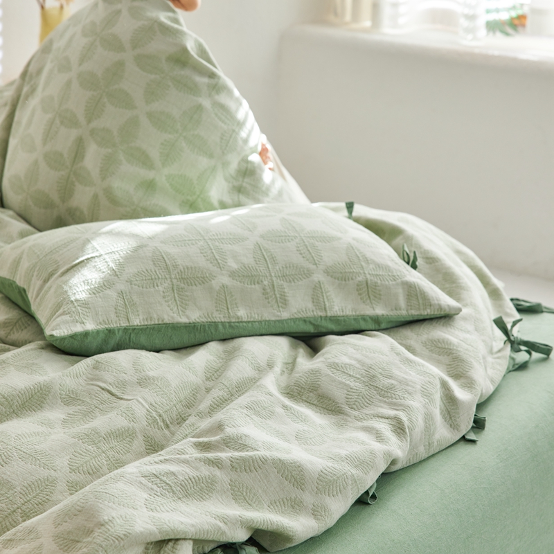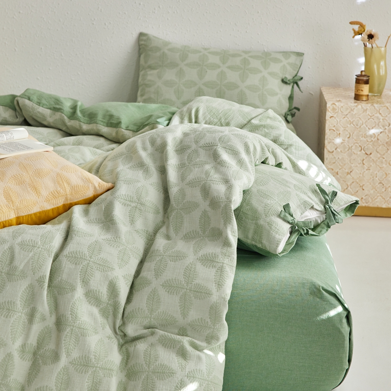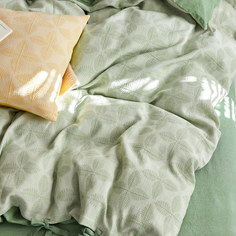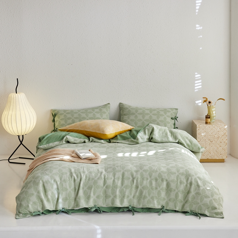 安莱生活 2023年新款高端双层纱栀子花色织大提花蝴蝶结工艺款四件套 幸运草-嫩绿