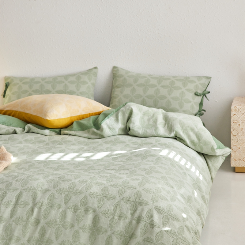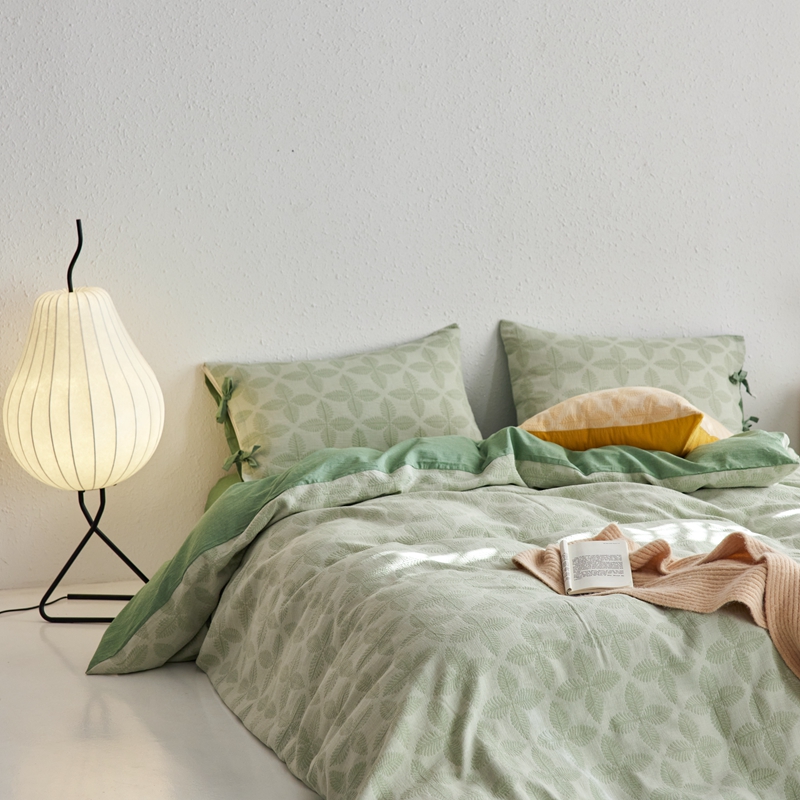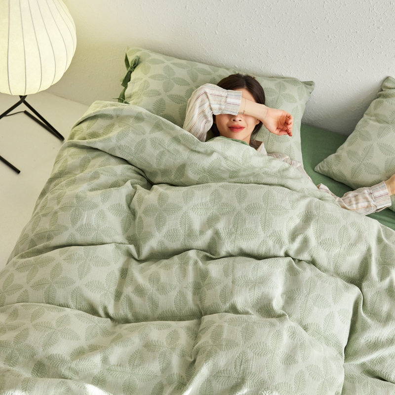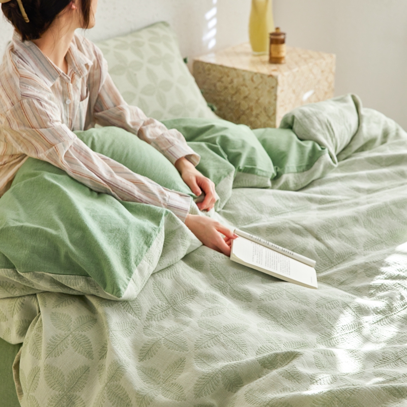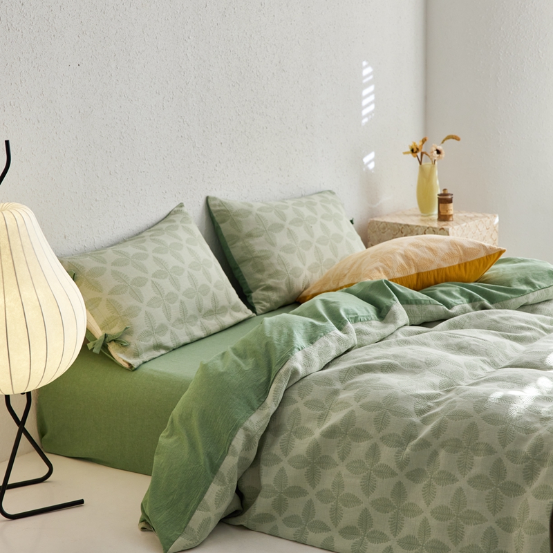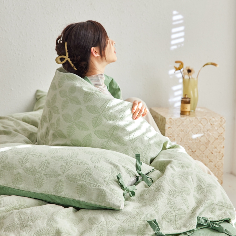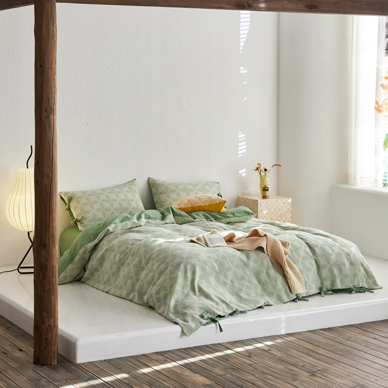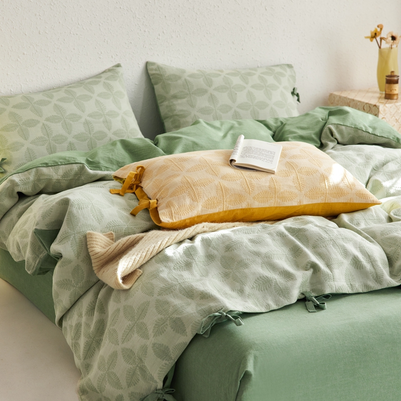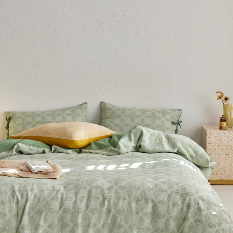 安莱生活 2023年新款高端双层纱栀子花色织大提花蝴蝶结工艺款四件套 幸运草-嫩绿
