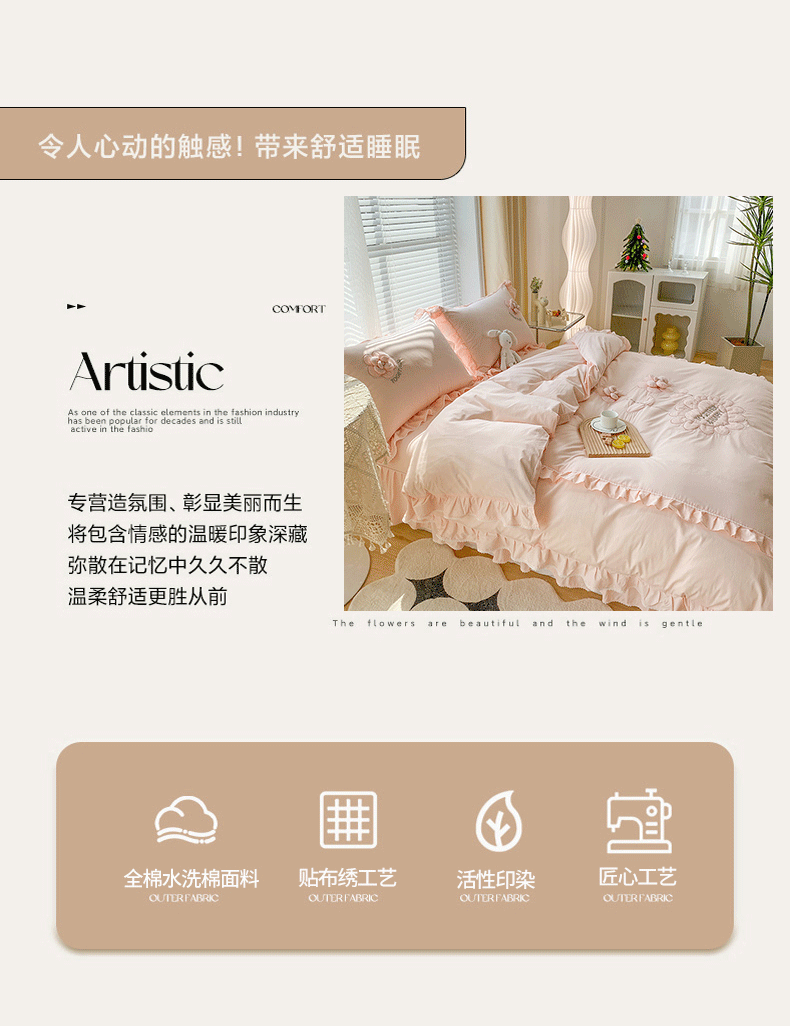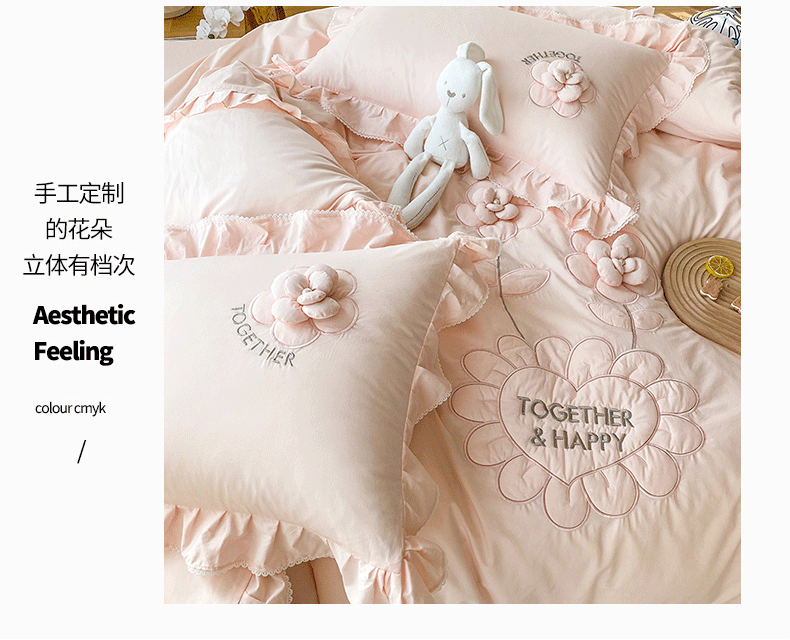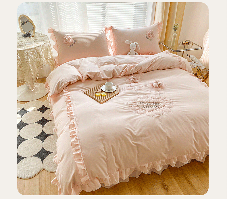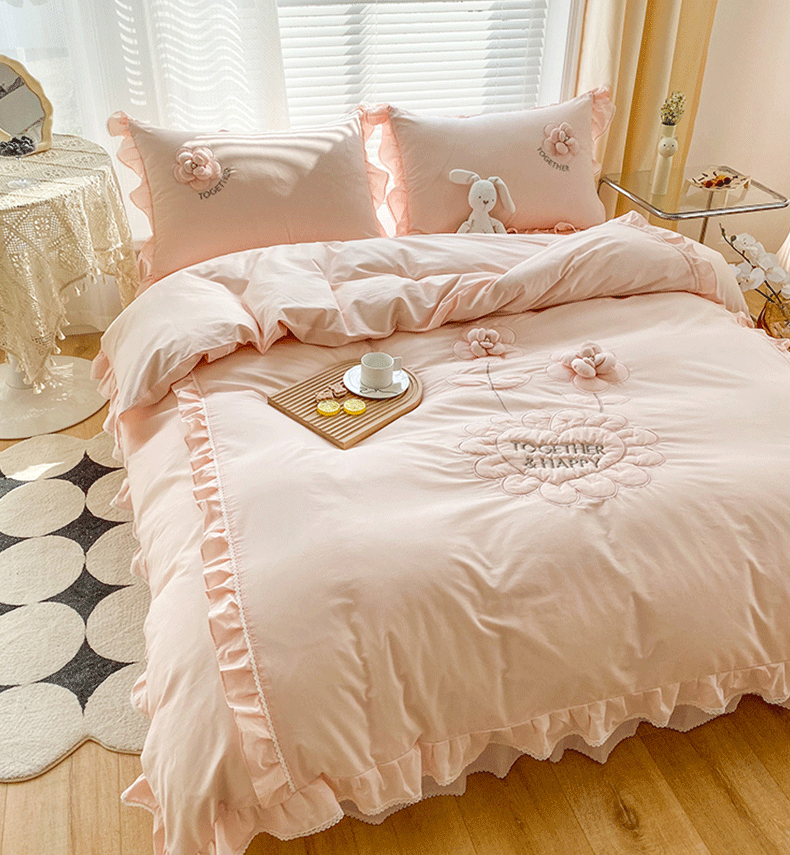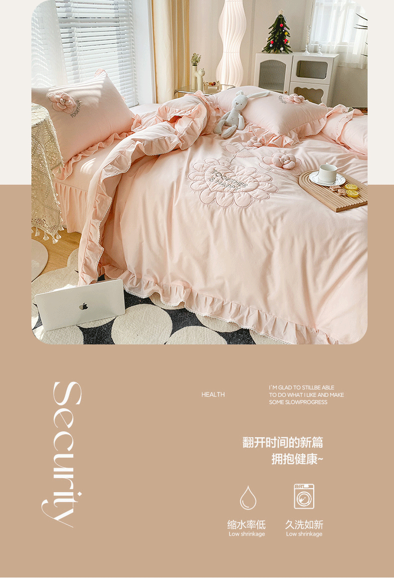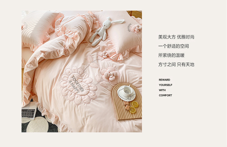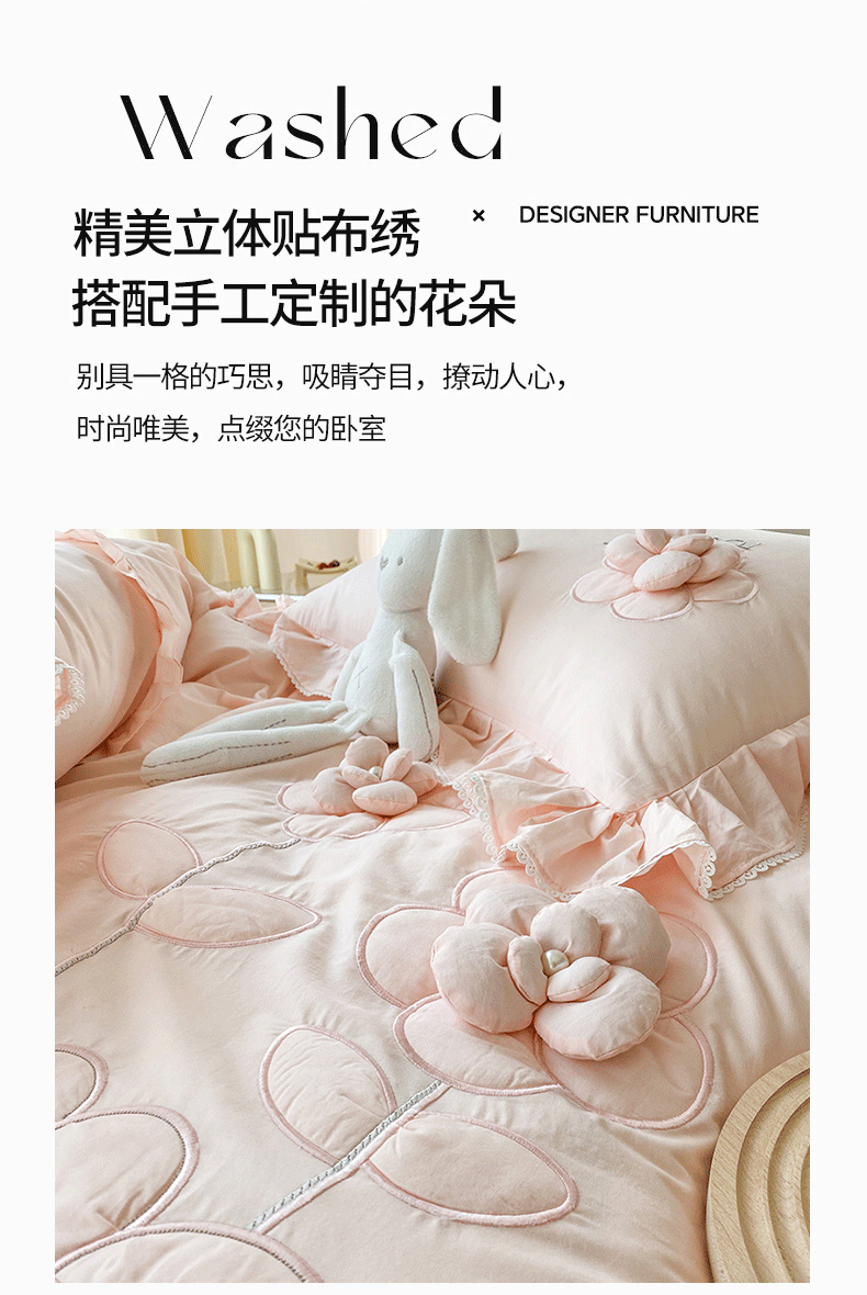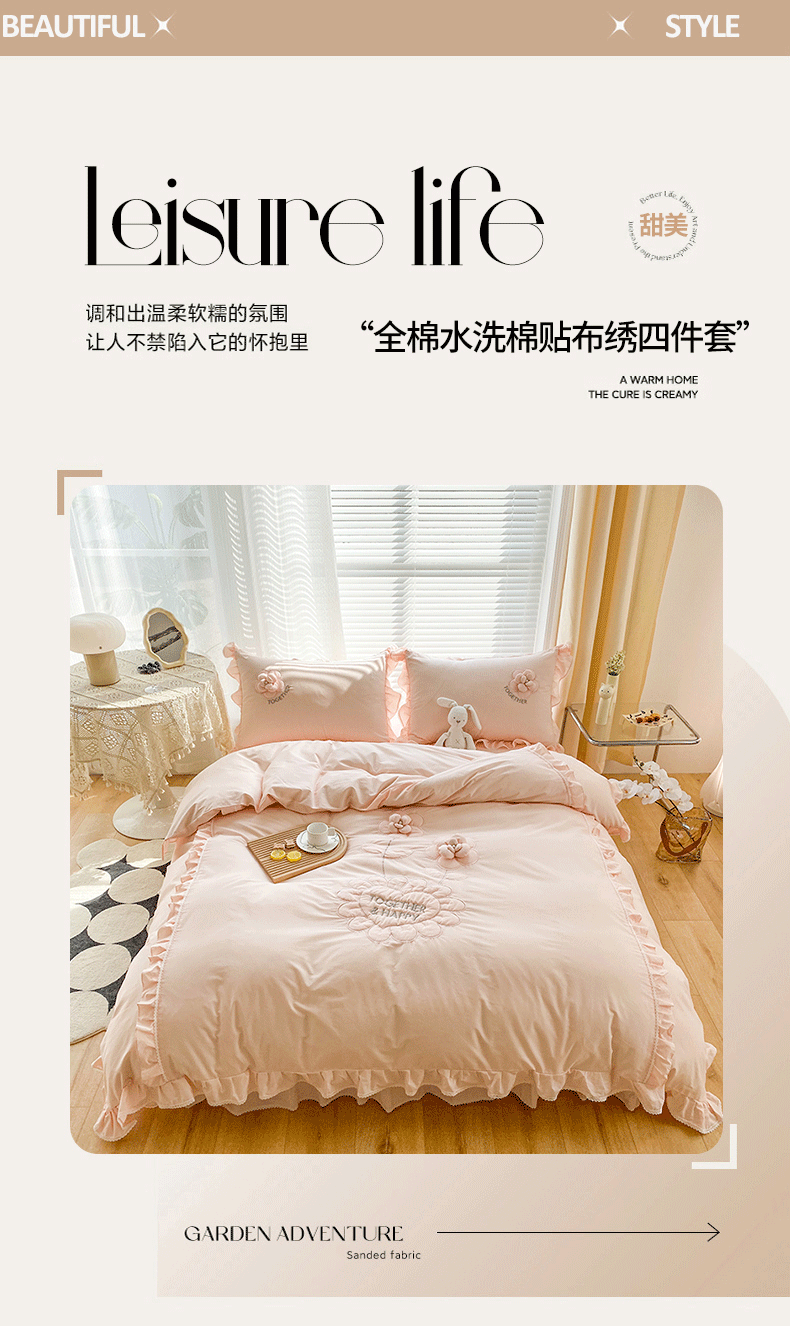 乐嘉盈2025新款全棉水洗棉立体提花贴布绣四件套 淡紫粉