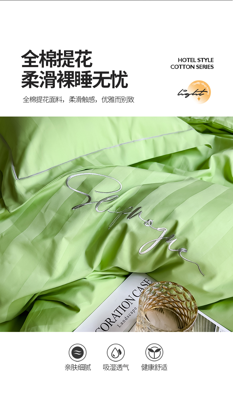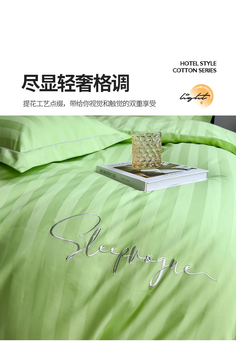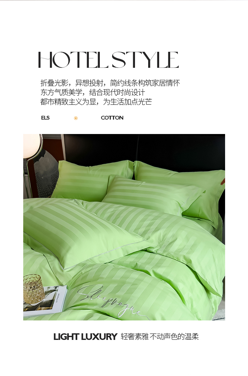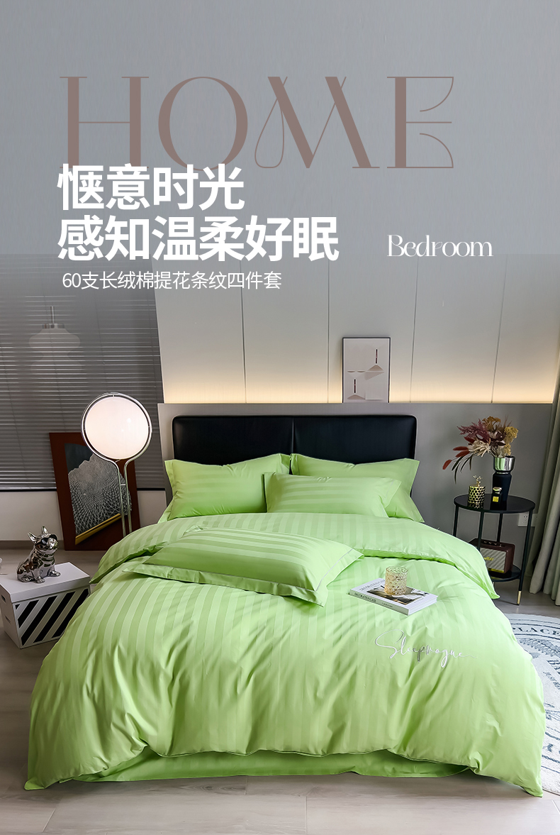 当前位置: 91家纺网 > 商品网购 > 床品套件 > 四件套 > 化纤普通四件套 > 品乐 2023新款 60支长绒棉提花条纹四件套条纹浅绿