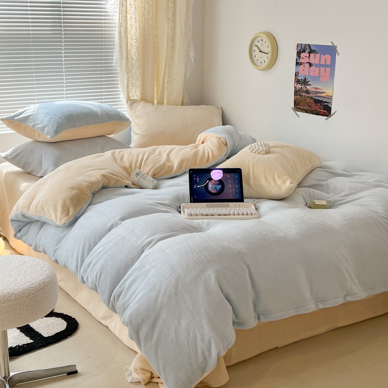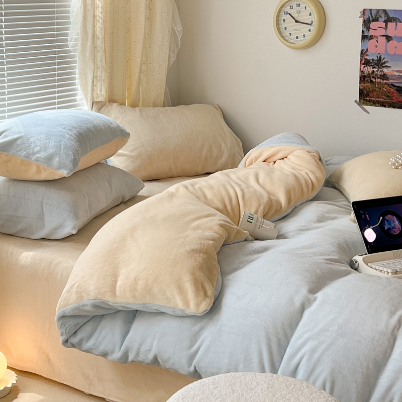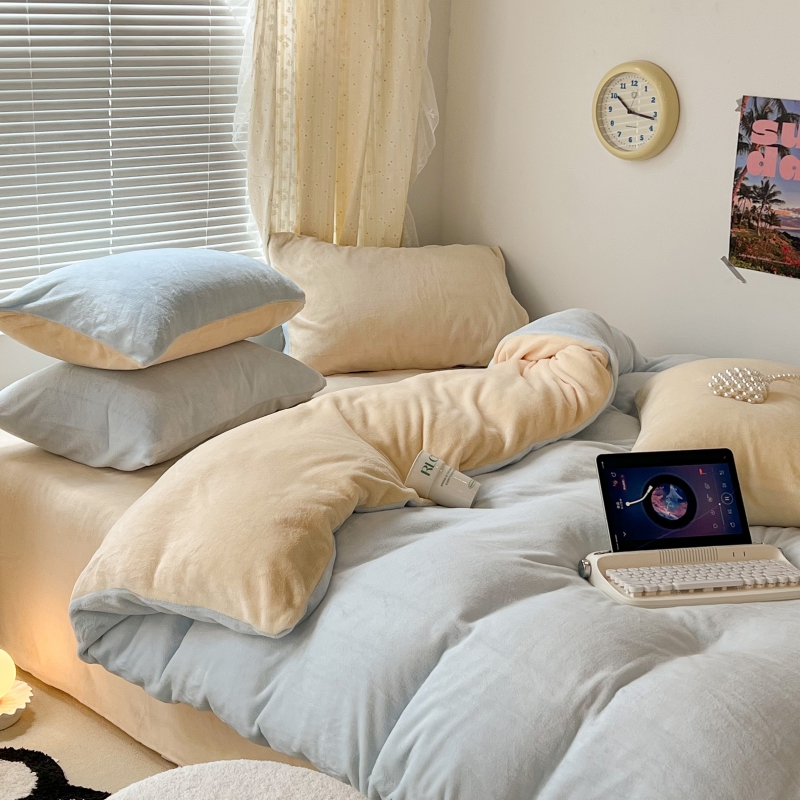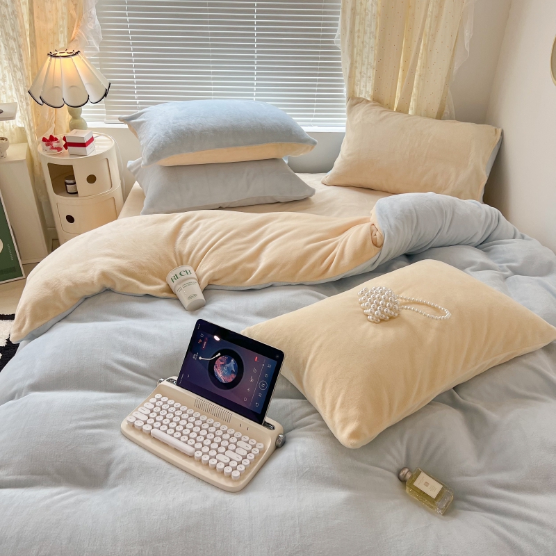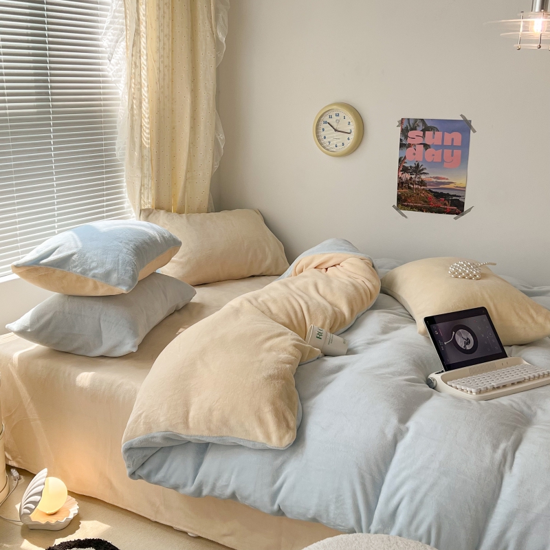 商品名称:昔可家纺 2023新款奶油纯色系列双拼牛奶绒四件套 奶油蓝拼黄