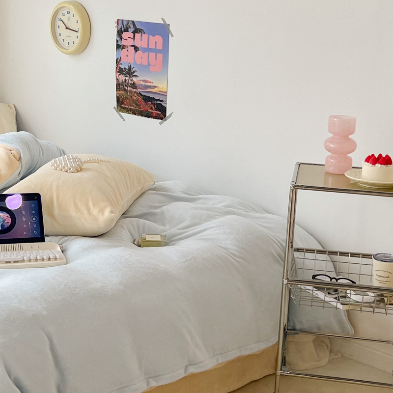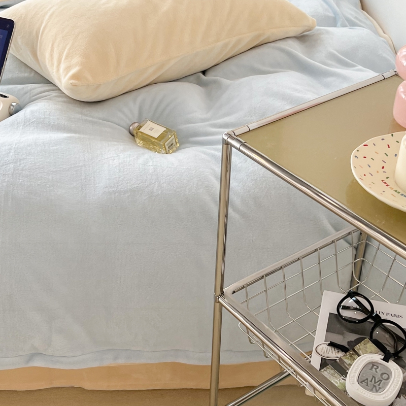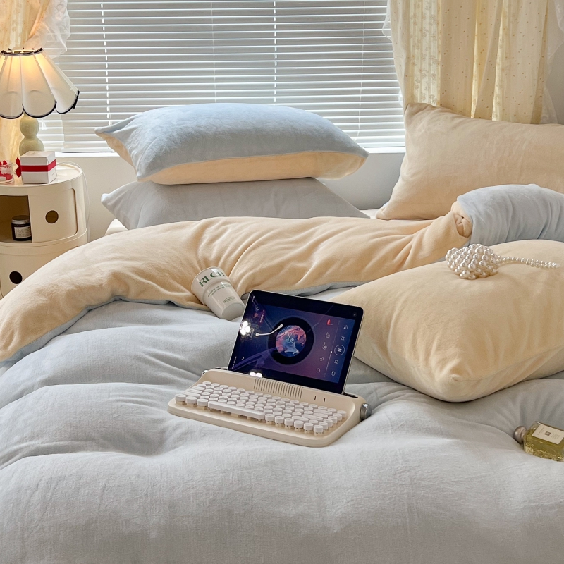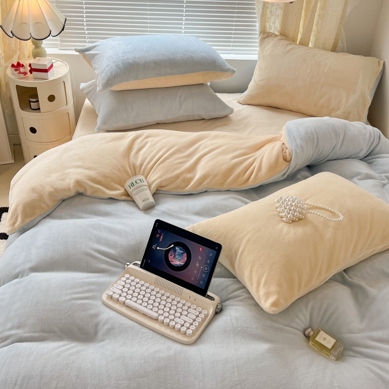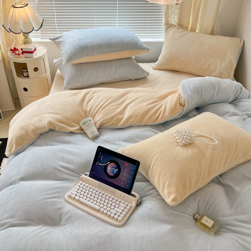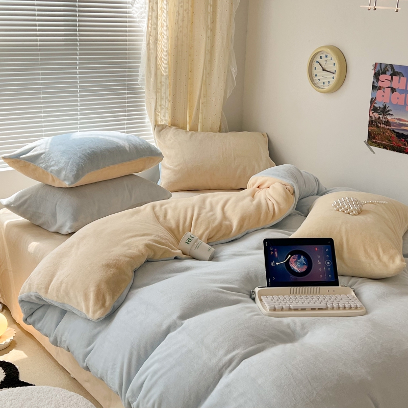 商品名称:昔可家纺 2023新款奶油纯色系列双拼牛奶绒四件套 奶油蓝拼黄
