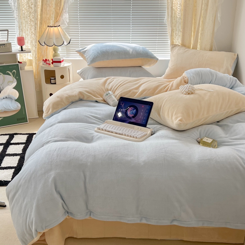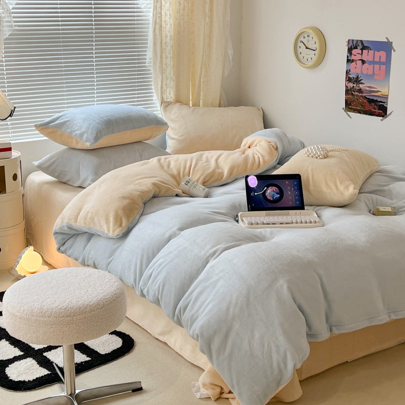 昔可家纺 2023新款奶油纯色系列双拼牛奶绒四件套 奶油蓝拼黄