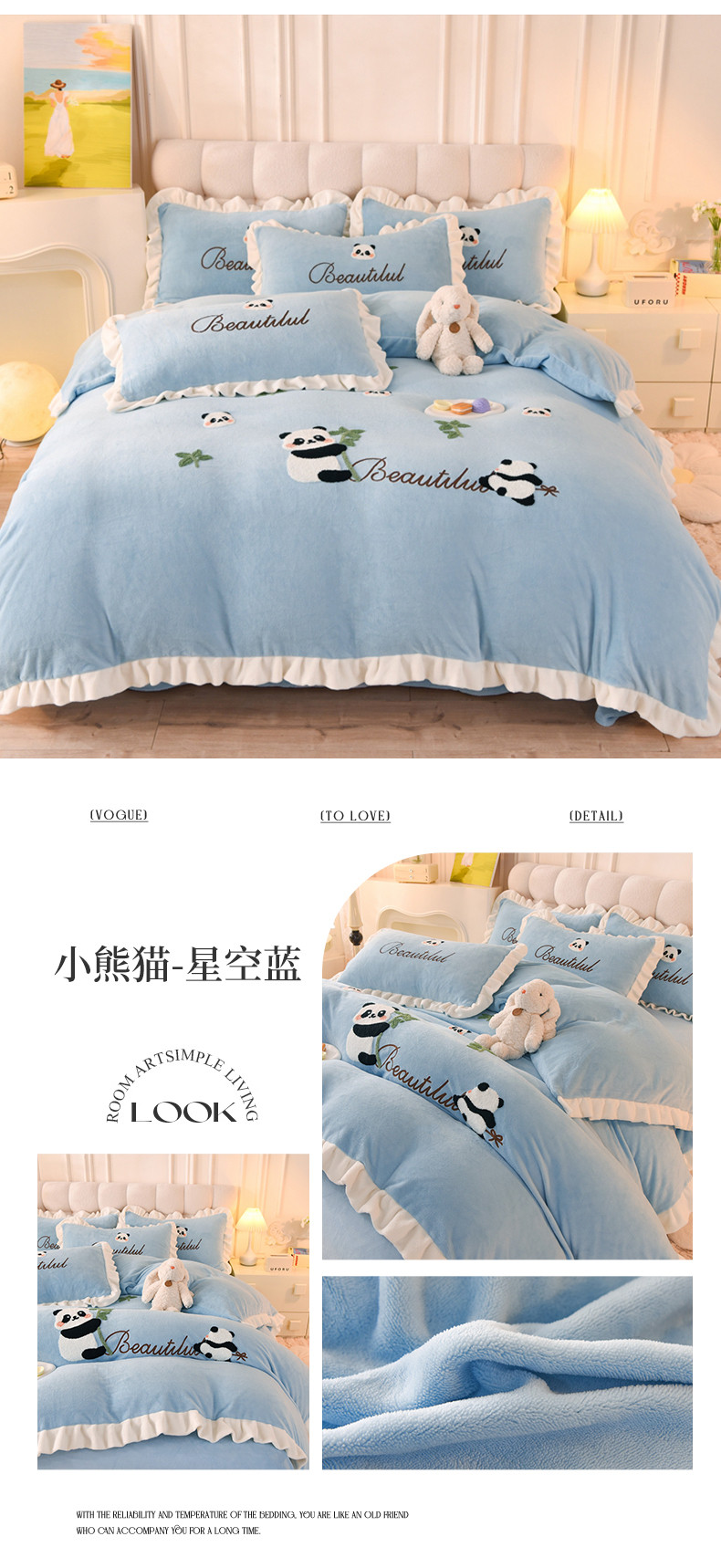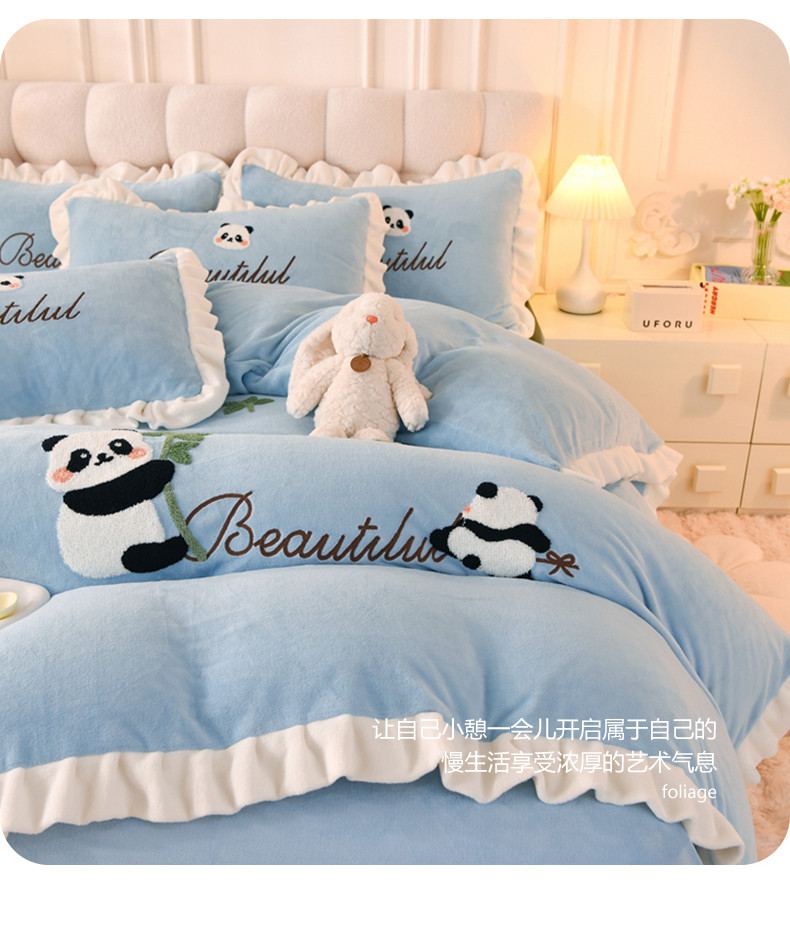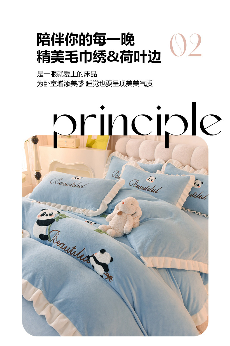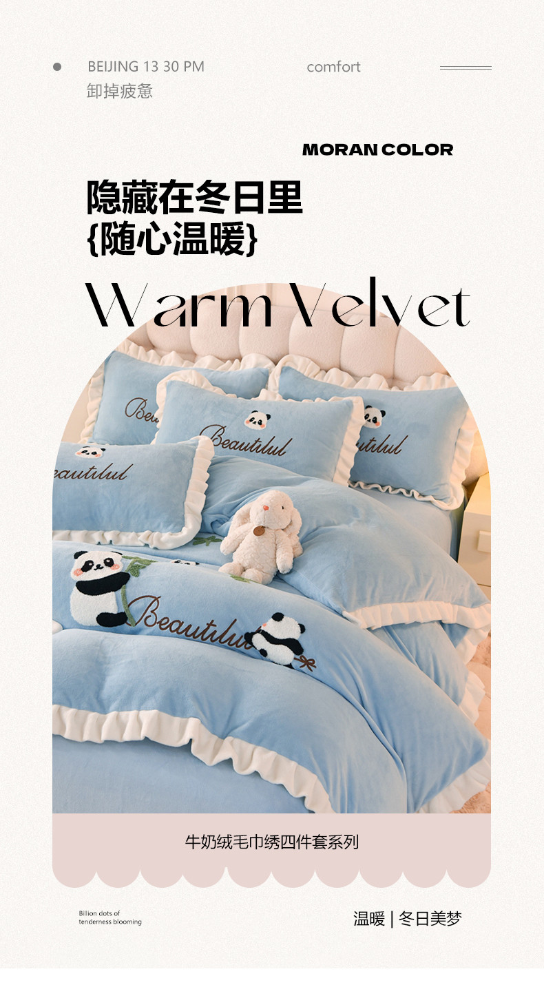 菲儿家纺 2023新款牛奶绒毛巾绣四件套 小熊猫-星空蓝