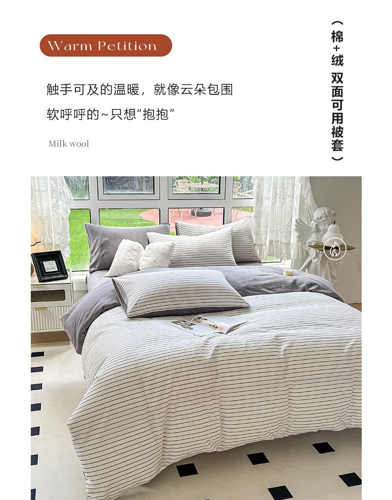 • 91家纺网 家纺一手货源 找家纺 柠萌 2023新款全棉色织水洗棉加牛奶绒单品被套全棉拼牛奶绒被套 棉+绒-白细条