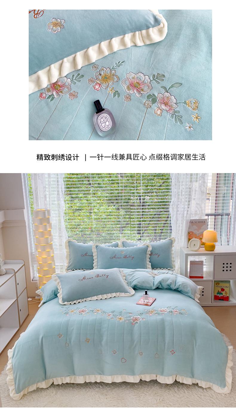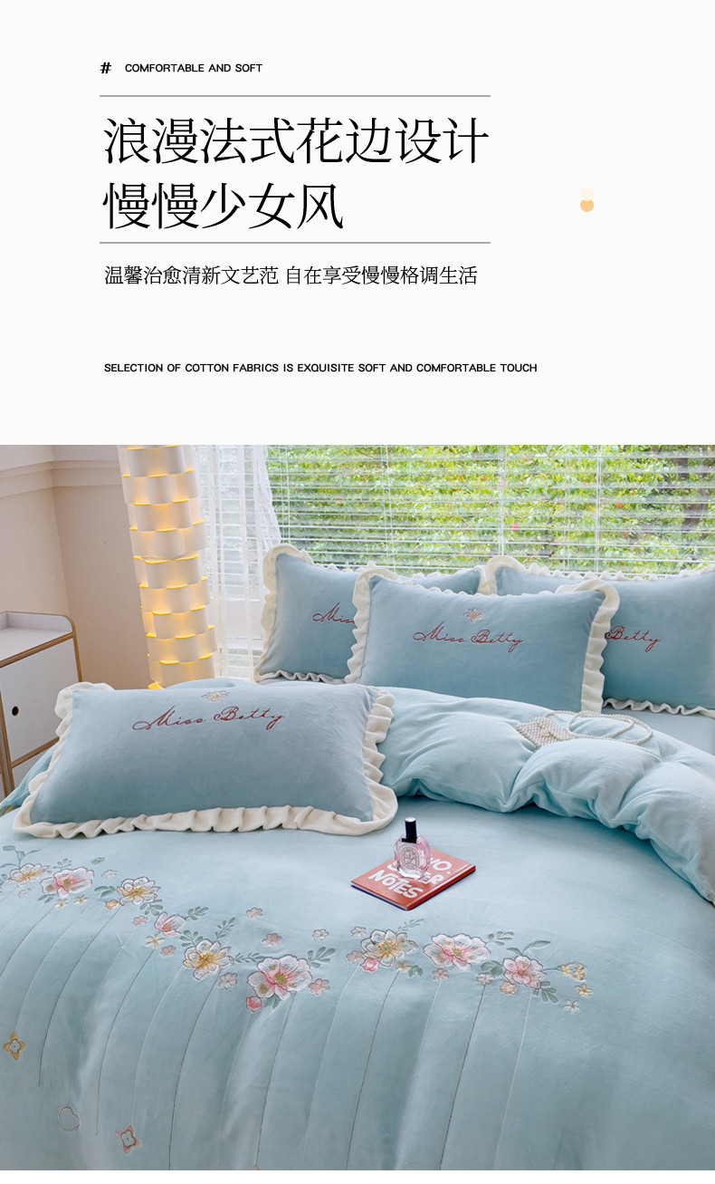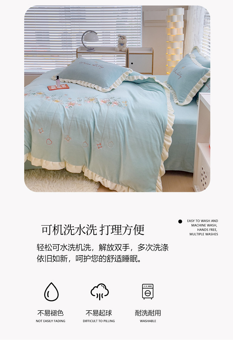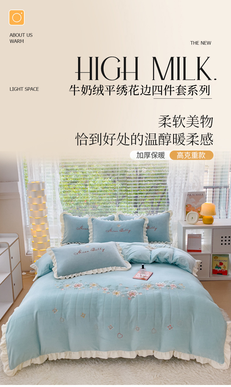 (总)菲儿家纺 2023新款直播高克重纯色牛奶绒平绣花边四件套-黛茜,黛茜-粉,黛茜-黄,黛茜-蓝,黛茜-绿,黛茜-紫