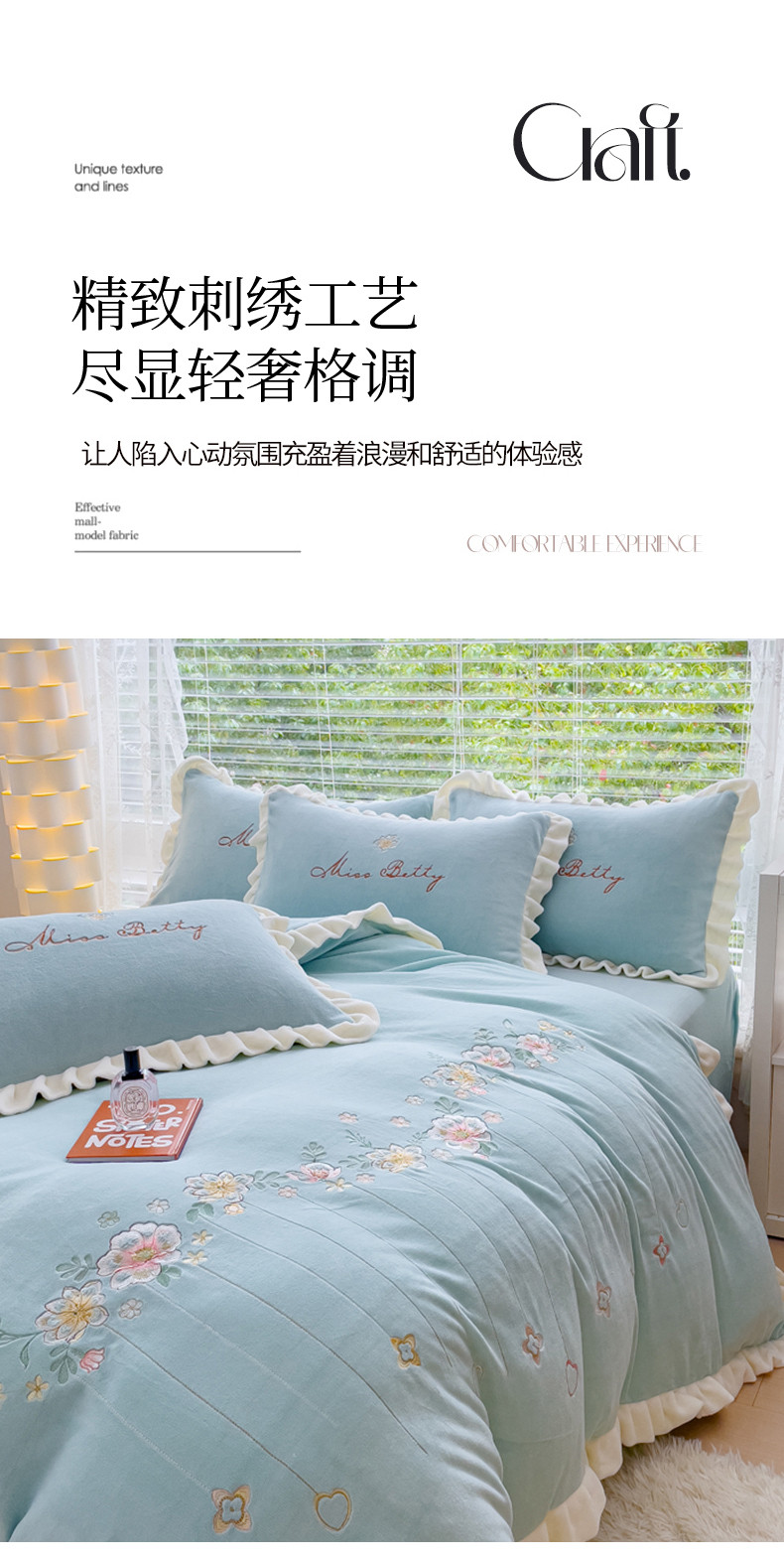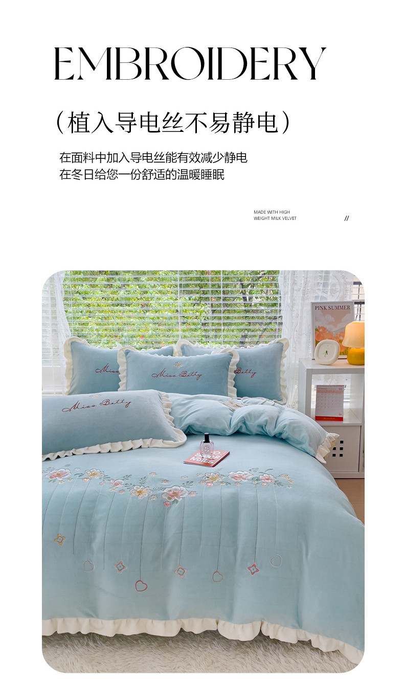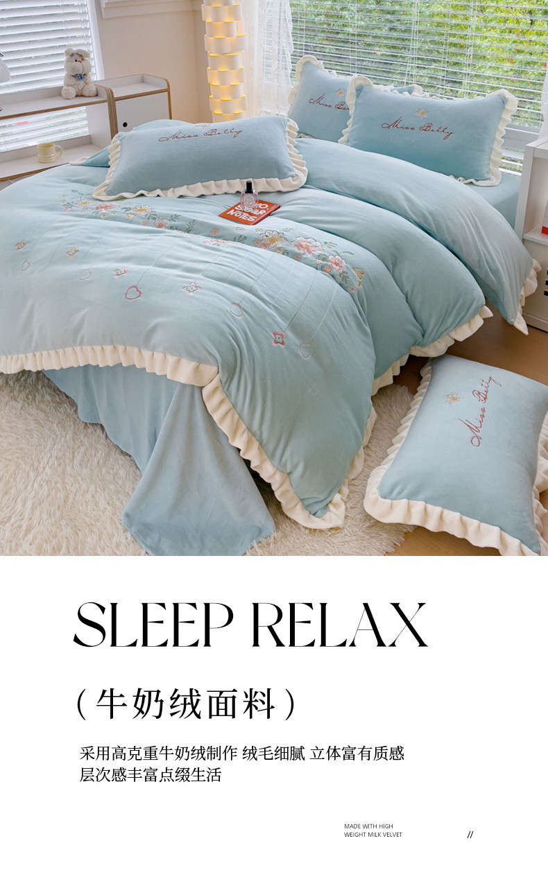 (总)菲儿家纺 2023新款直播高克重纯色牛奶绒平绣花边四件套-黛茜,黛茜-粉,黛茜-黄,黛茜-蓝,黛茜-绿,黛茜-紫