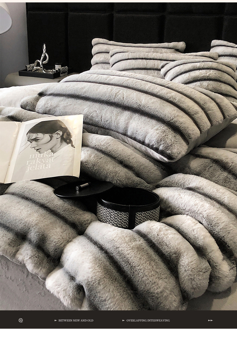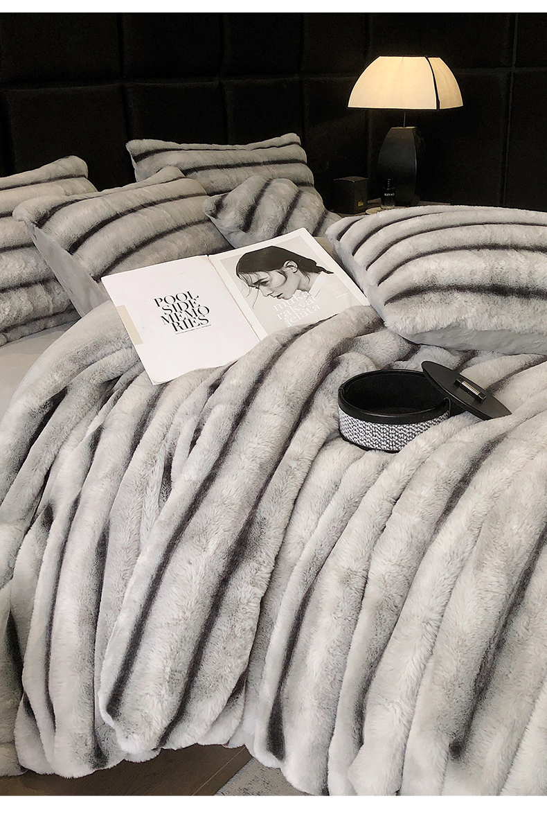 罗优家纺 2025新款条纹兔兔绒四件套 雪灰