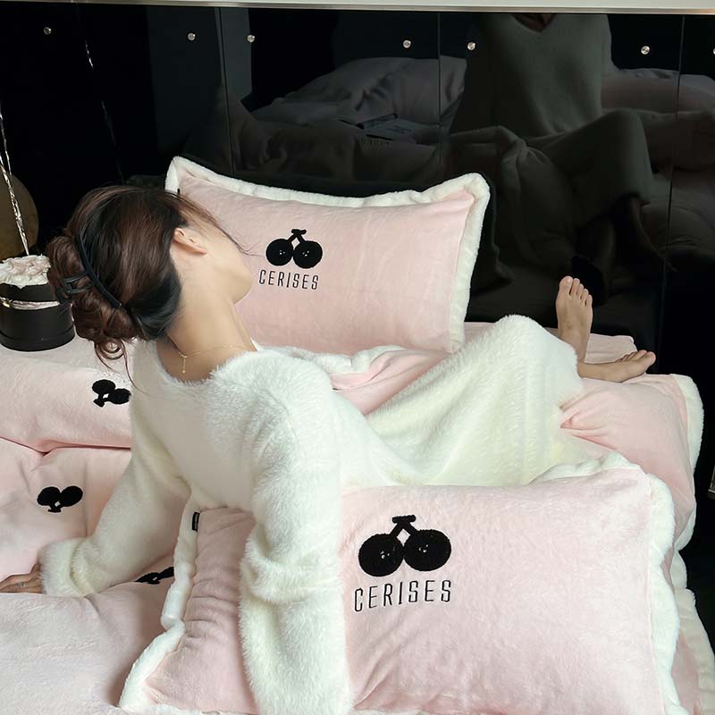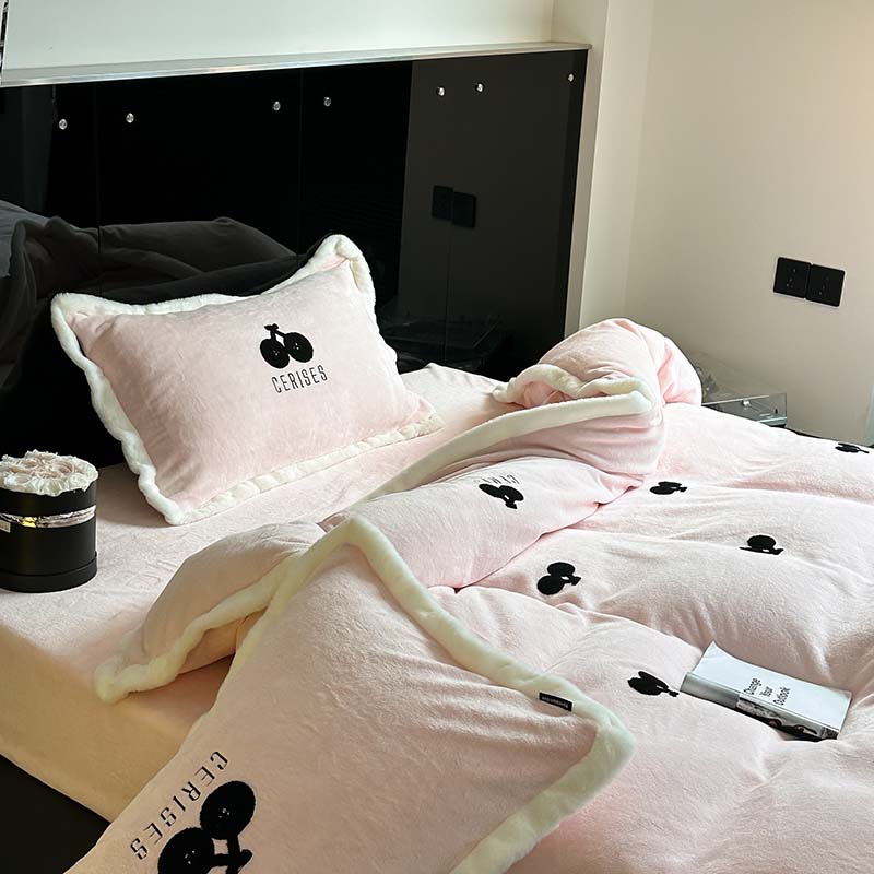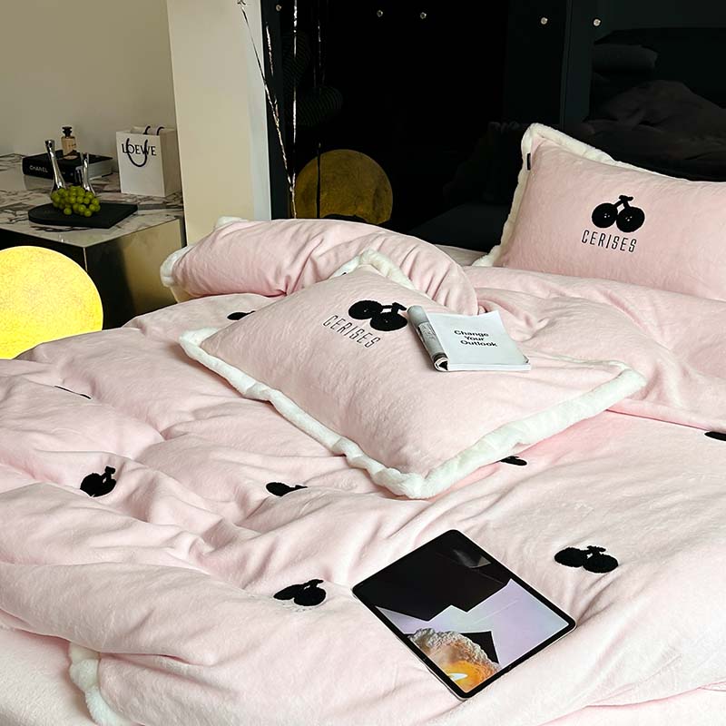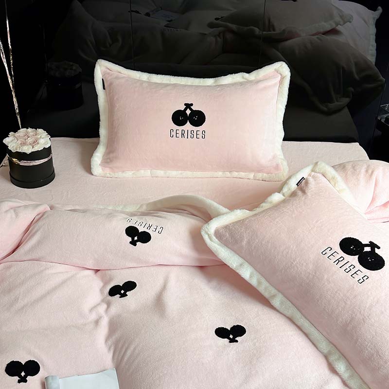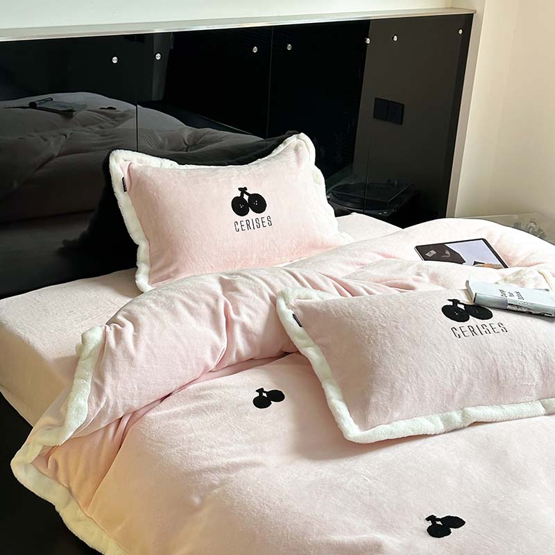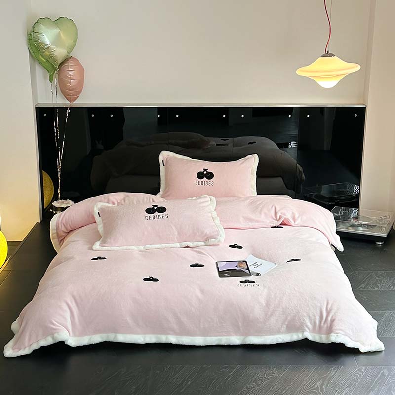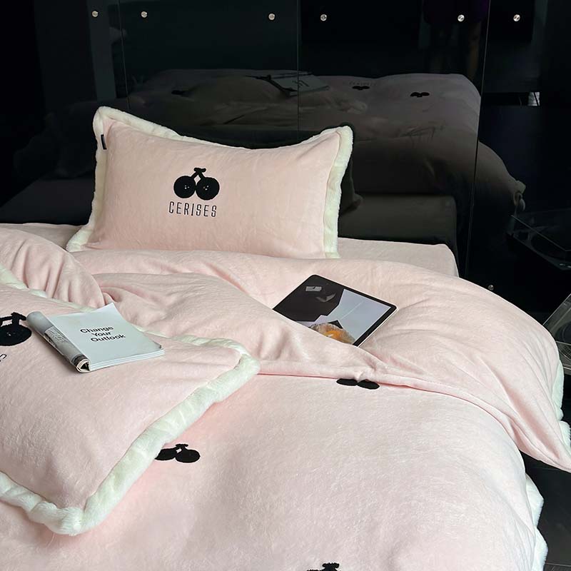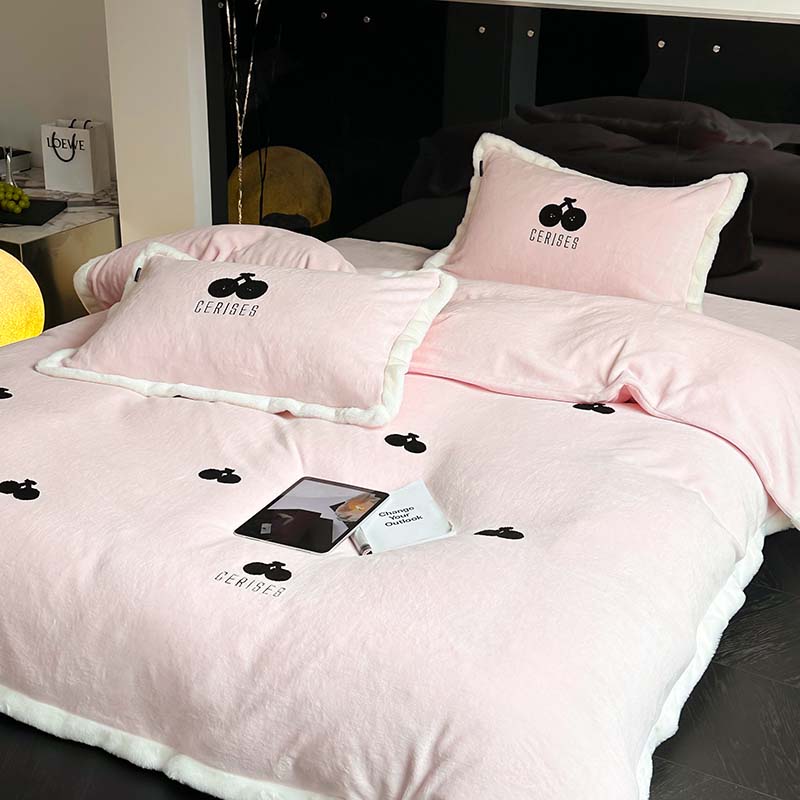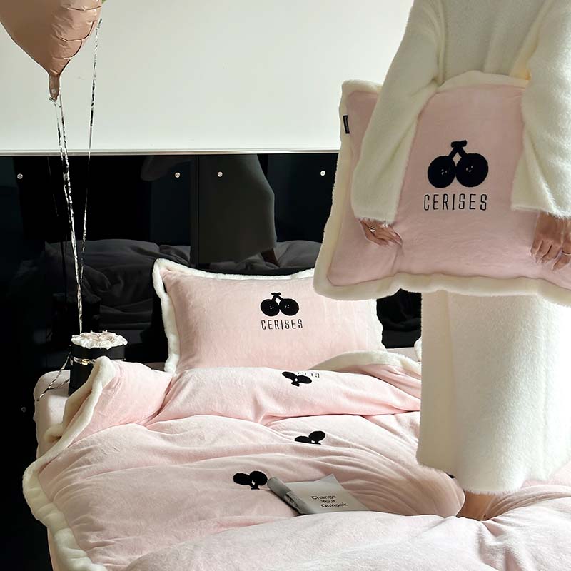 圆岛家纺 2023秋冬新款少女心桃心樱桃毛巾绣牛奶绒四件套 樱桃(玉粉)